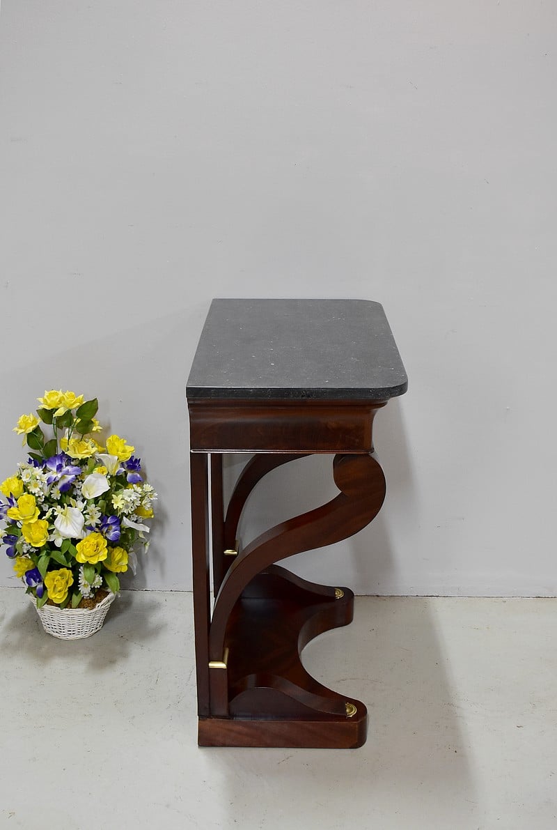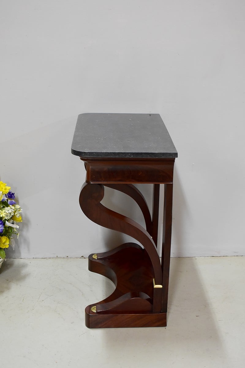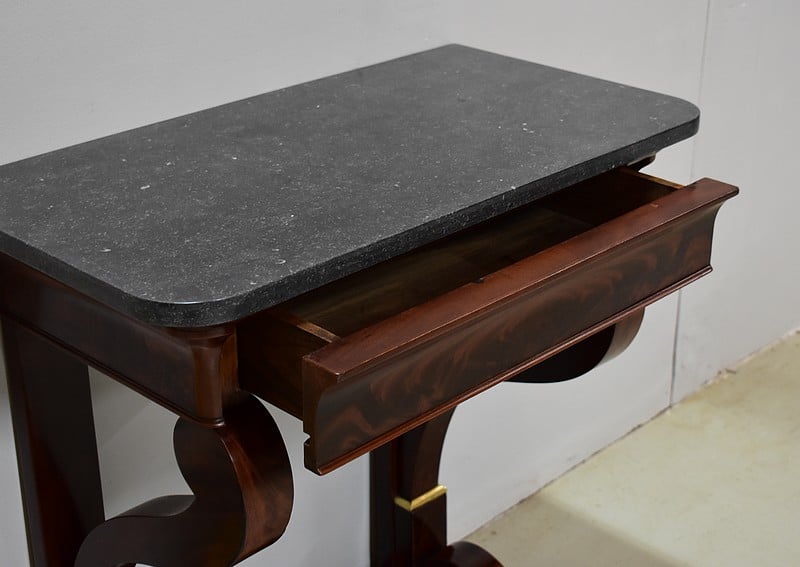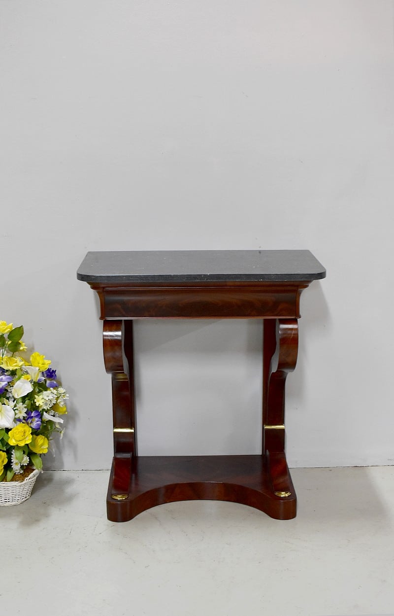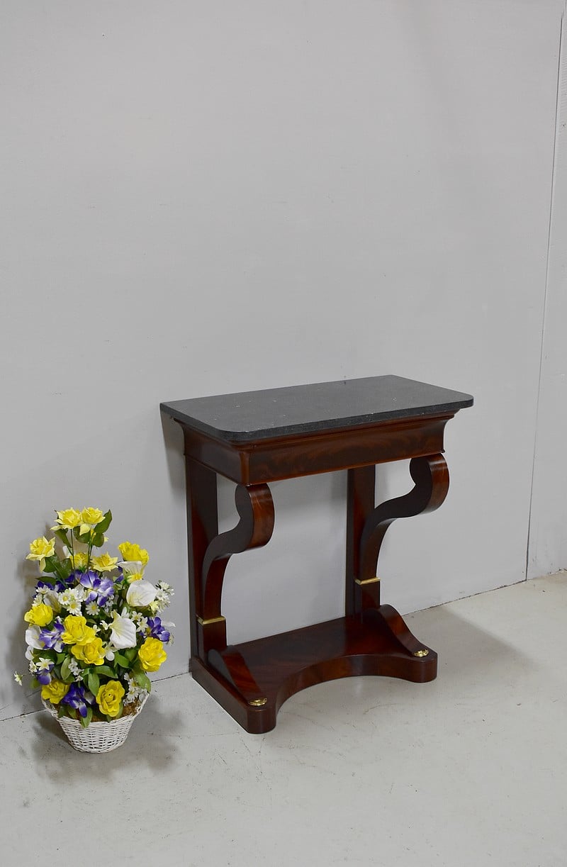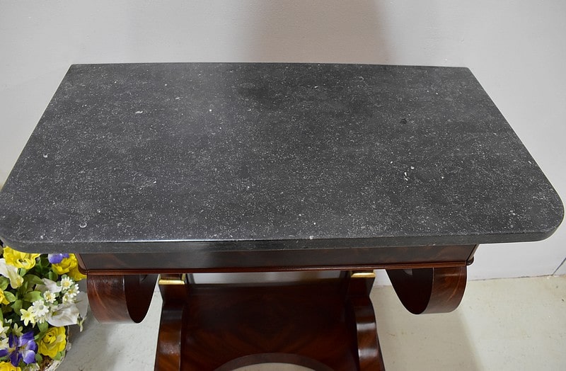 Rare petite console Restauration en placage de Ronce d’Acajou de Cuba avec son dessus en marbre Granit Belge Anthracite de 20 mm d’épaisseur.