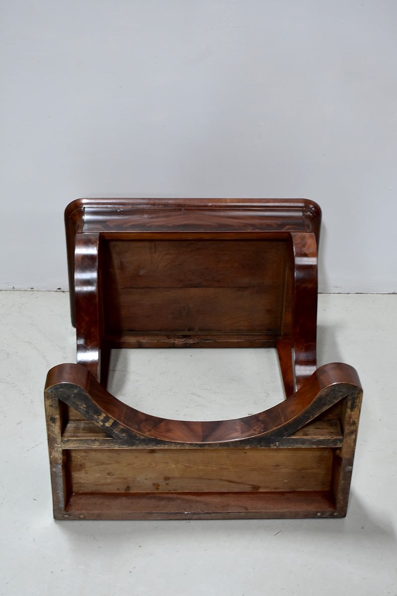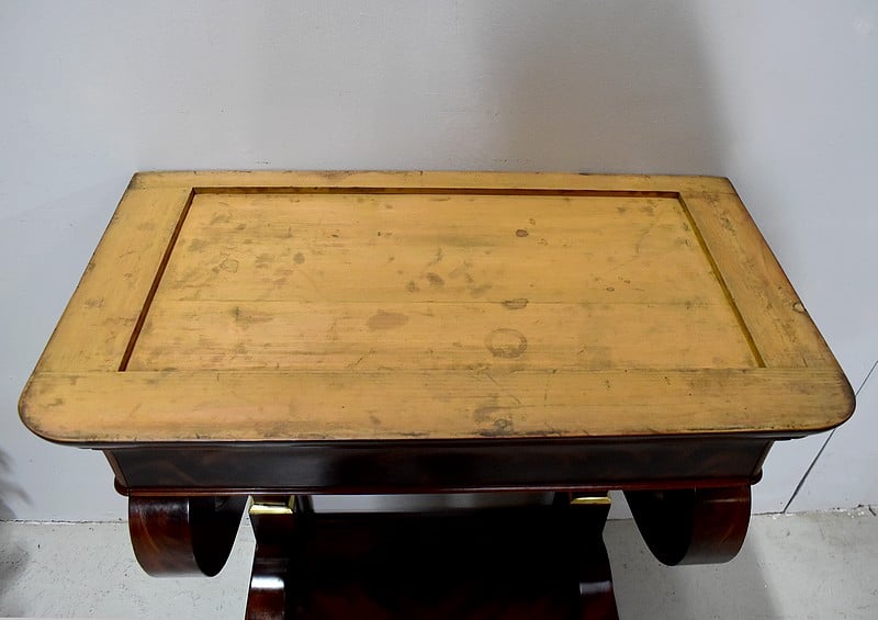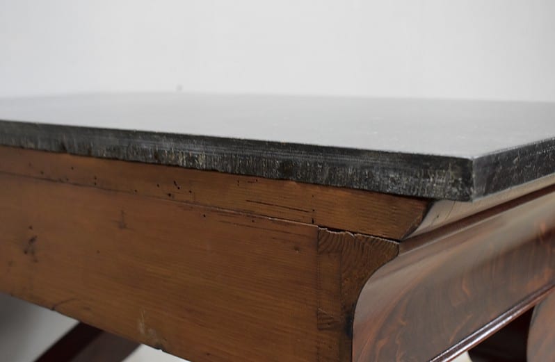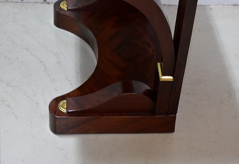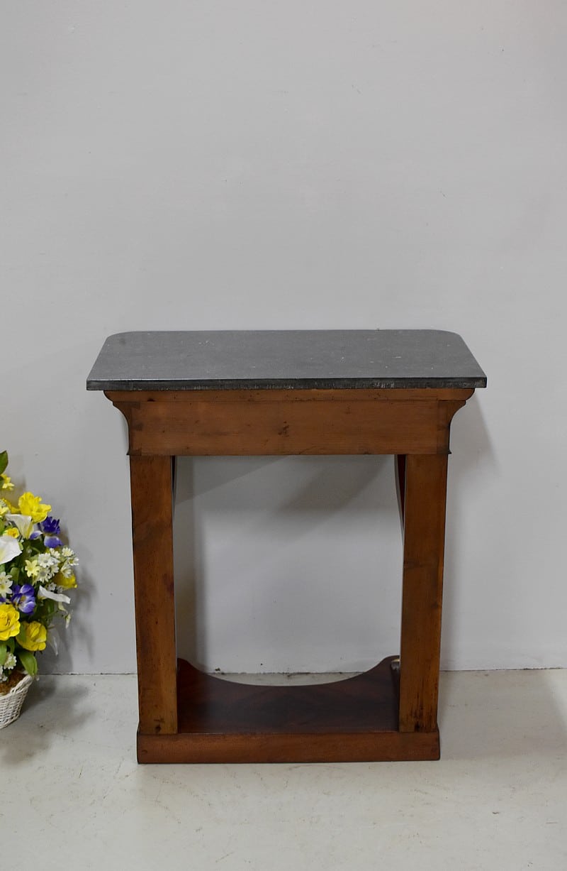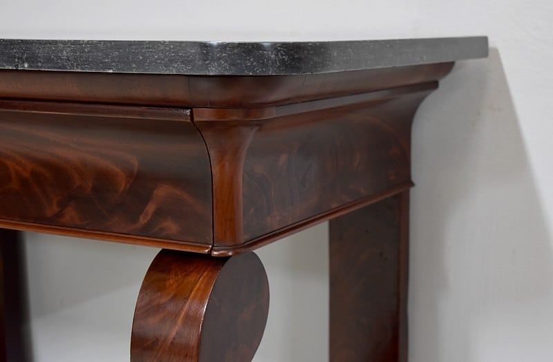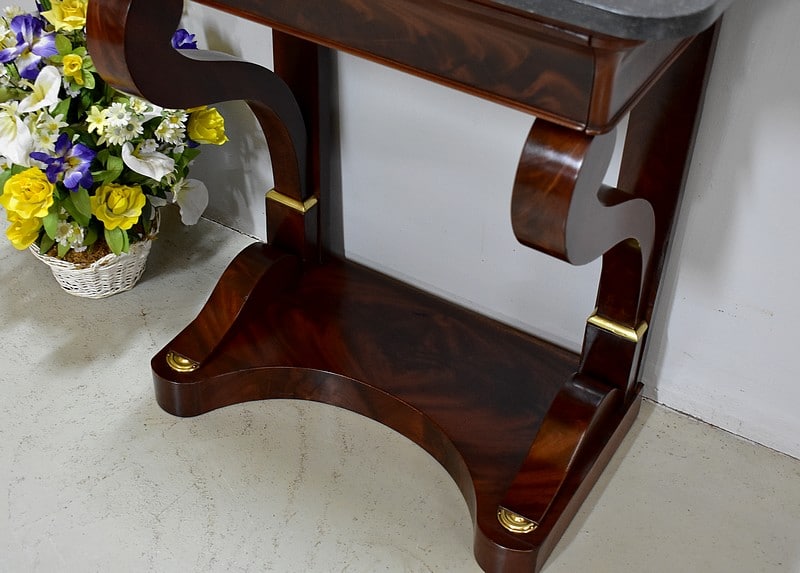 Rare petite console Restauration en placage de Ronce d’Acajou de Cuba avec son dessus en marbre Granit Belge Anthracite de 20 mm d’épaisseur.