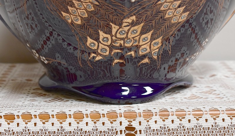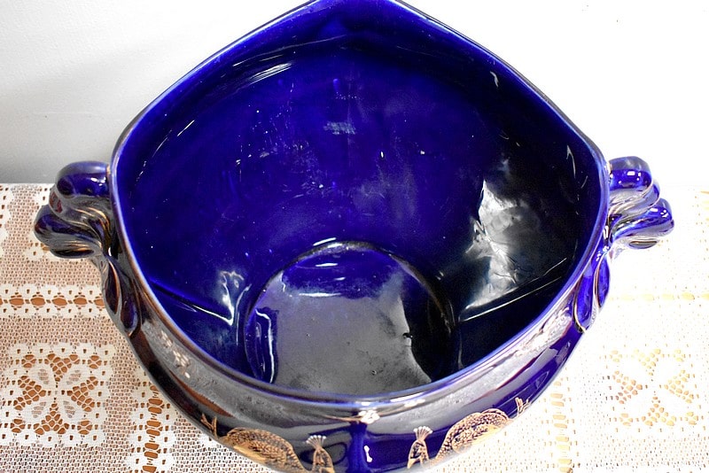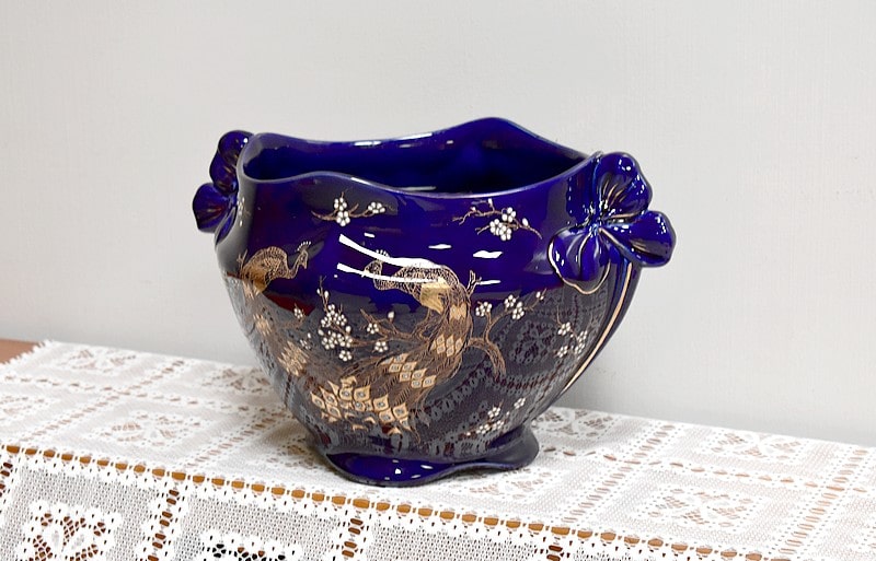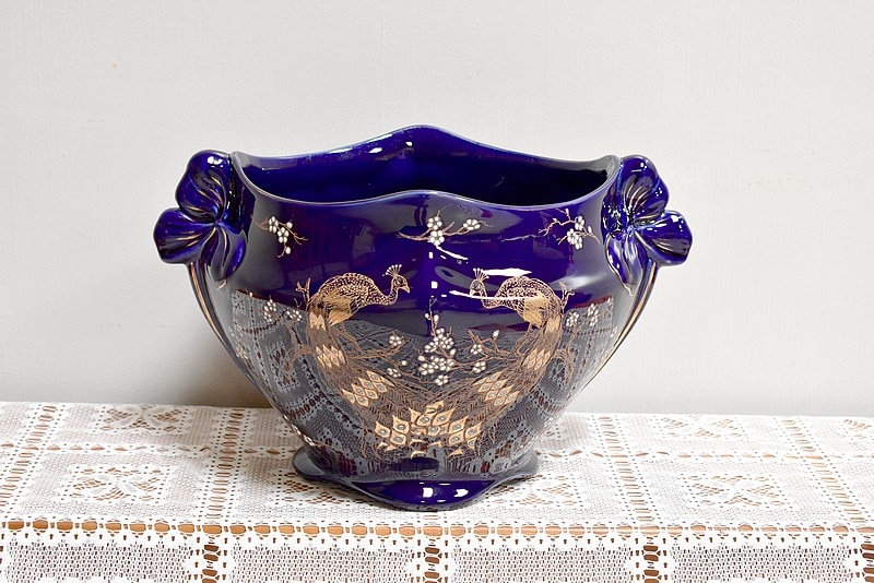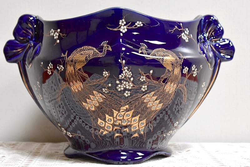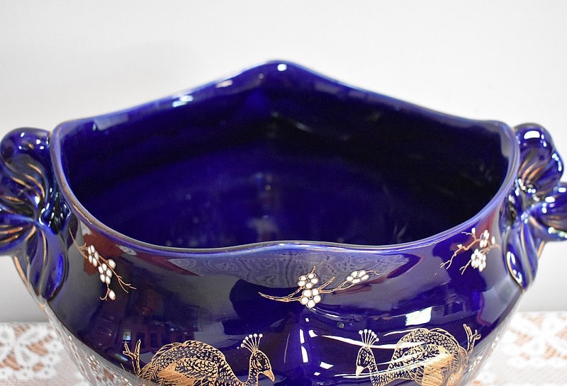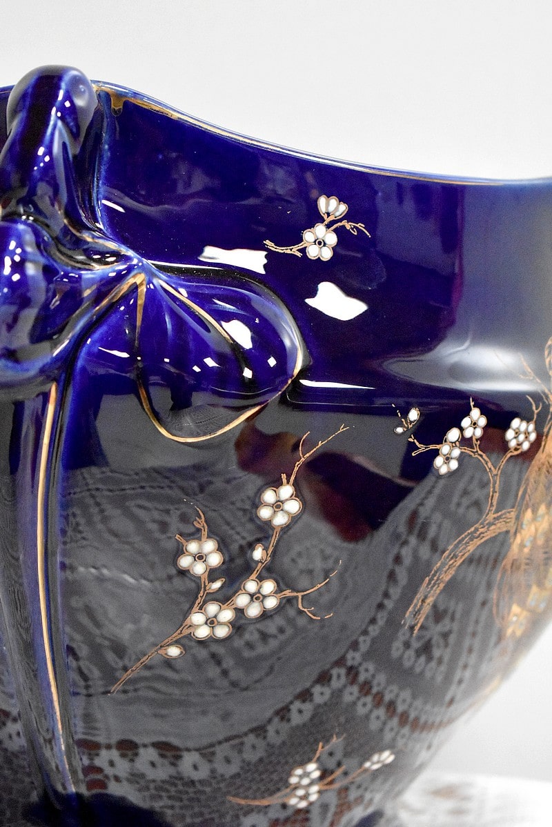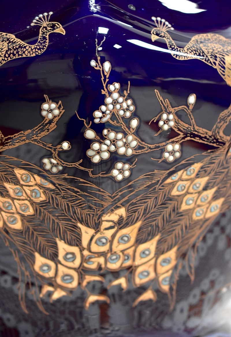 Sur fond d’un bleu profond, il présente des paons peints à la main dorés posés sur des branches à fleurs blanches en émaux.