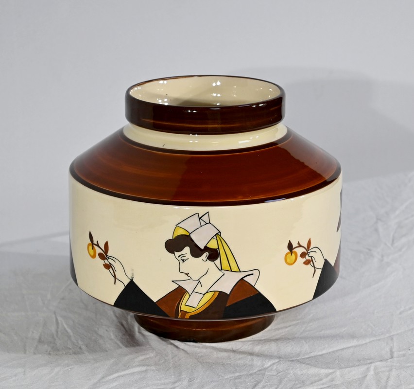 Ce cache-pot, à la panse droite et assise annulaire surélevée, figure un décor tournant de couples stylisés de Bretons en habits traditionnels, têtes bêches, une fleur à la main.
