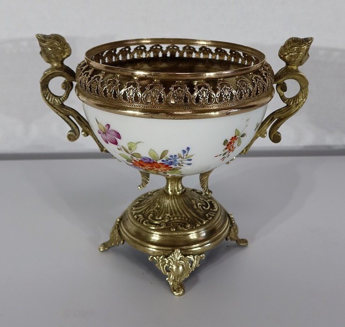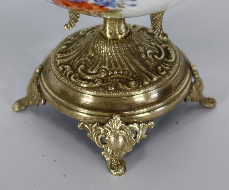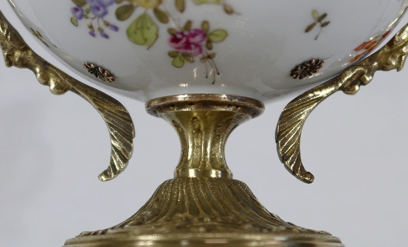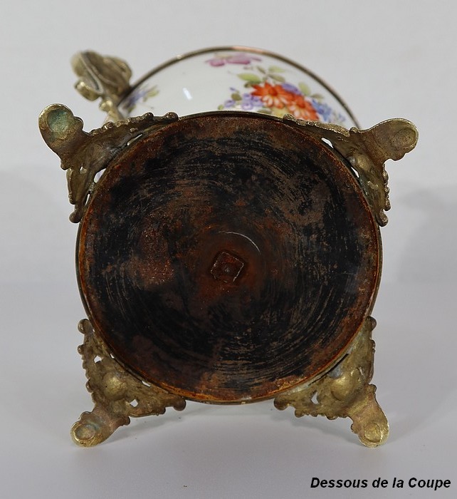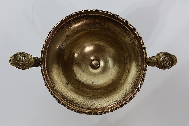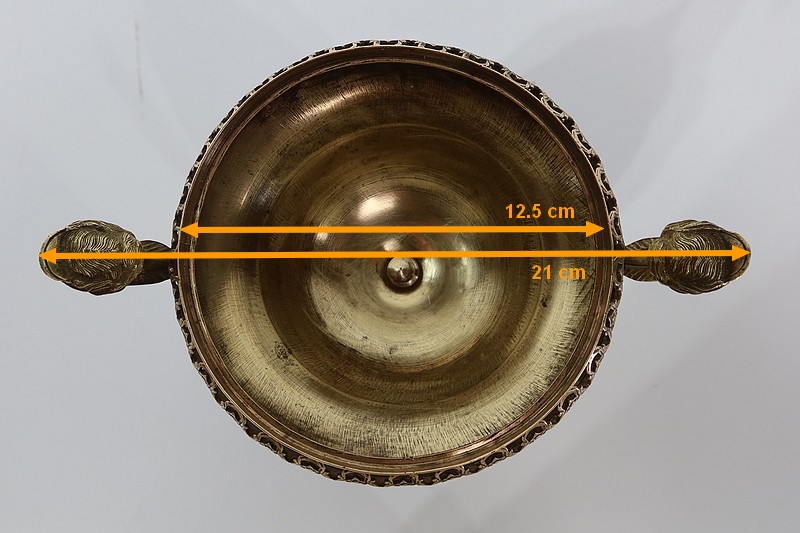 Elle est montée sur bronze, avec en partie haute une large galerie ajourée. De là partent deux anses formant des bustes de femmes terminés en enroulements.
