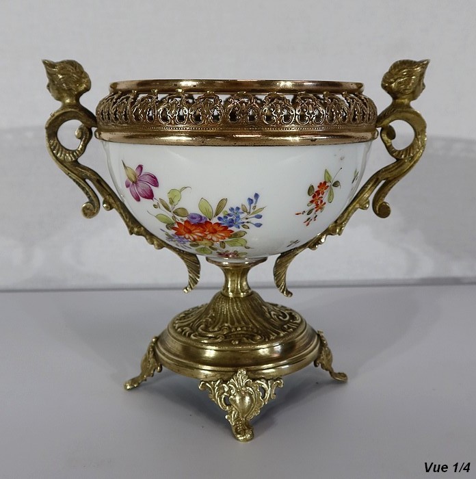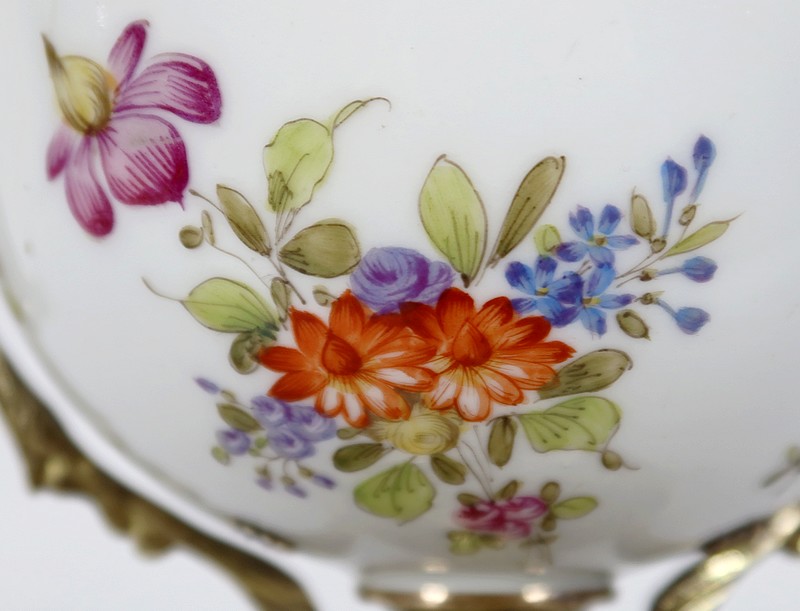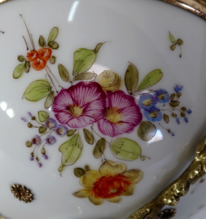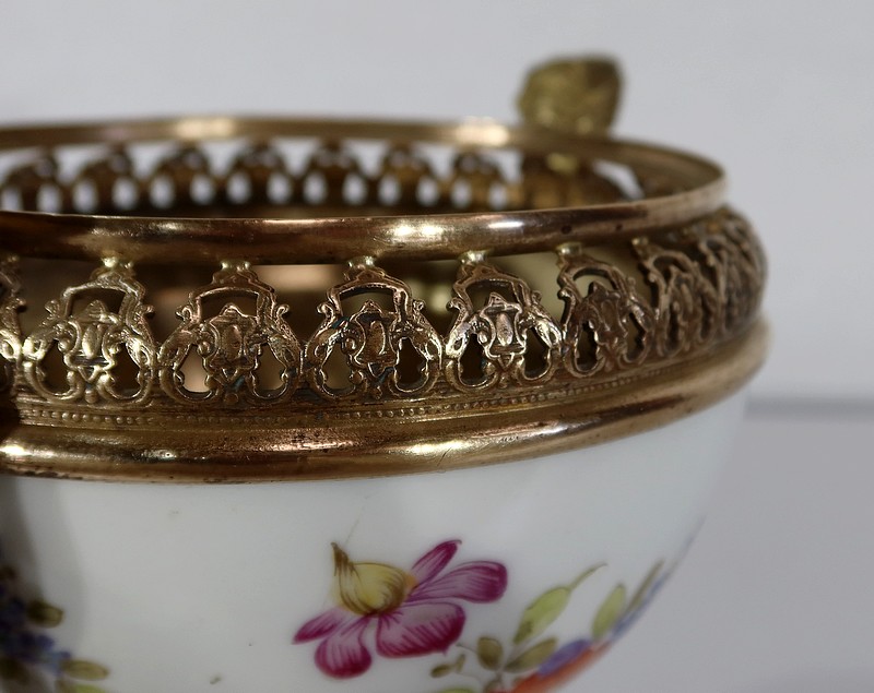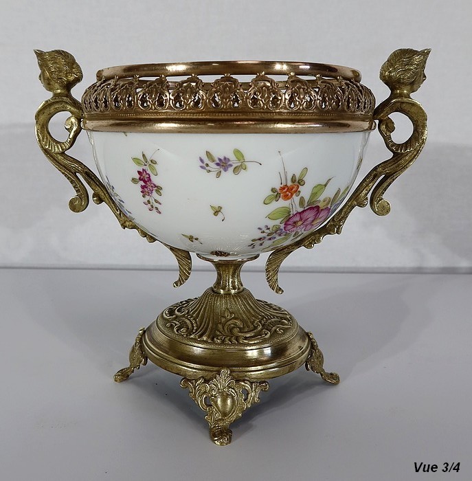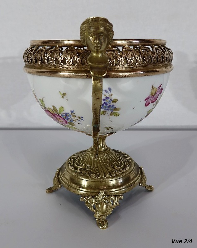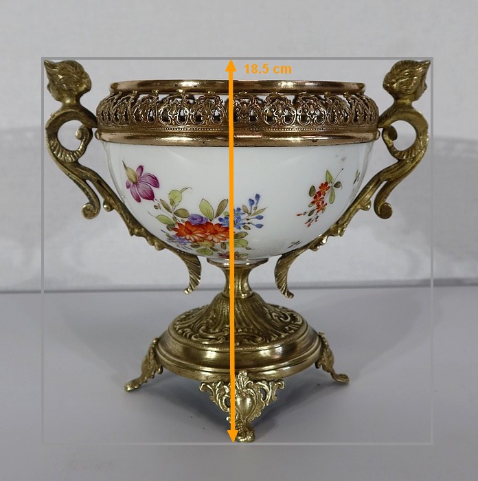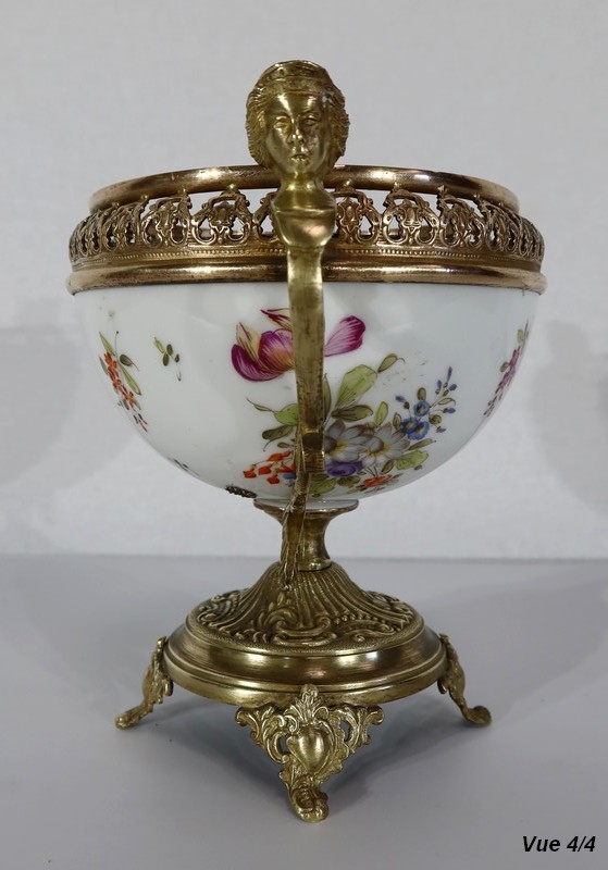 Petite coupe, dont la panse en porcelaine est enjolivée de fins décors de fleurs polychromes sur fond crème.