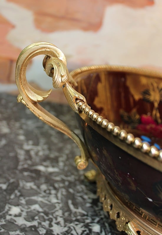 Grande coupe en bronze et laiton à décor de feuilles d’acanthes et céramique peinte de fleurs, de feuilles et d’oiseaux.