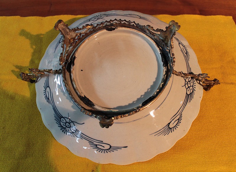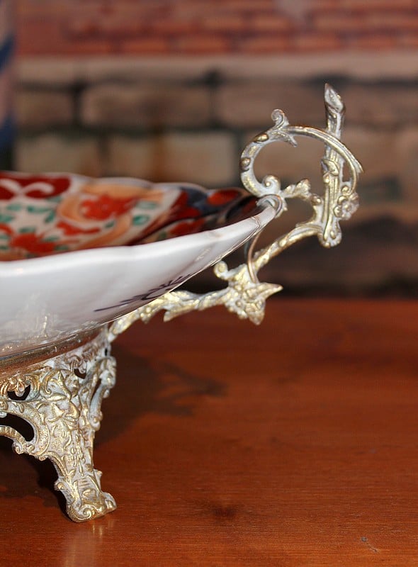 Coupe en porcelaine à décor fleuri ‘Imari’ sur monture en métal doré feuillagé. Seconde moitié du XIXe. Très bon état.