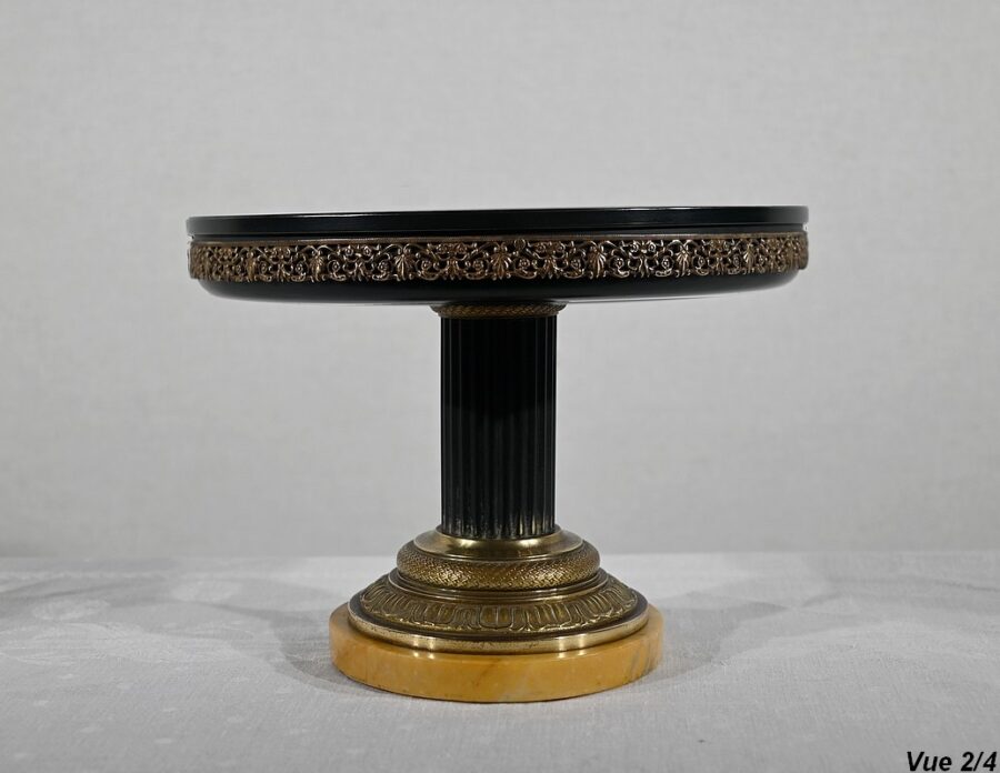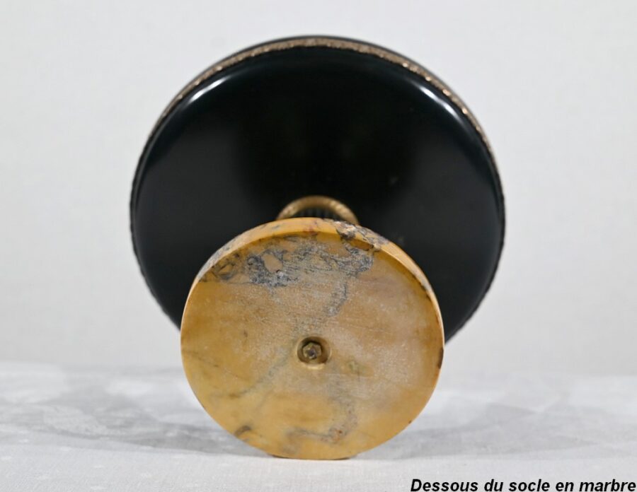 Le piédouche rudenté, à collerette, se termine par un ensemble d’éléments, striés et ciselés, reposant sur un marbre Jaune de Sienne.
