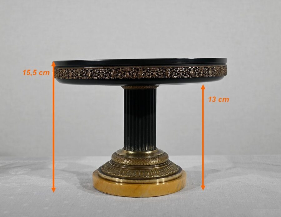 Coupe plate sur pied en tôle verte foncée. L’intérieur est orné d’un motif de fleur en bronze. Le pourtour extérieur est habillé d’une bande en laiton façonné.