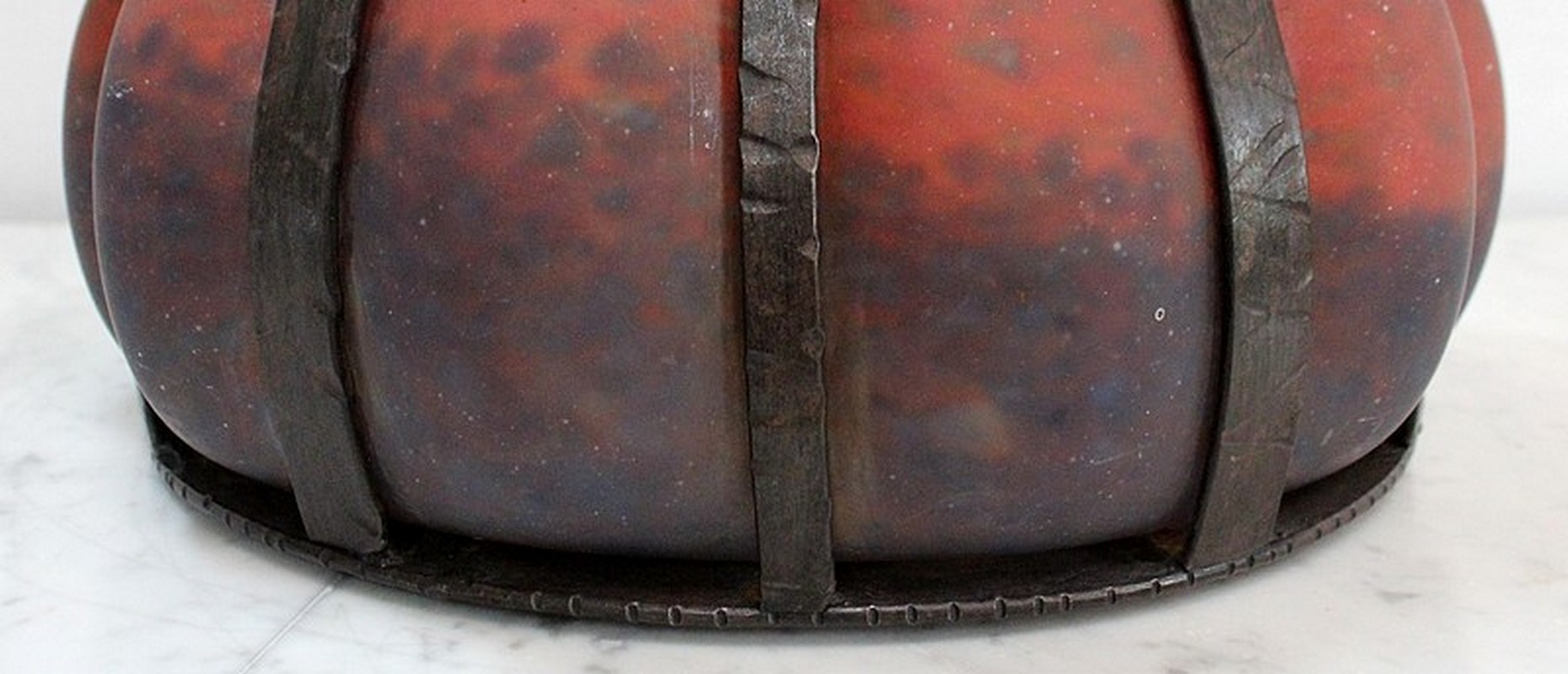 D’aspect Mat, cette Pièce a été soufflée à chaud dans une Monture sculptée en fer Forgé munie de deux anses.