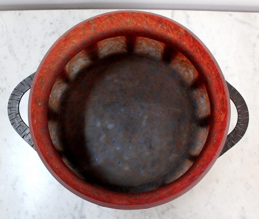 Cette Épreuve Circulaire Godronnée, réalisée par Vitrification intercalaire de poudres d’oxydes, bénéficie d’une riche Palette Chromatique : Orange, Jaune, Blanc et Bleu s’entremêlent et se superposent.