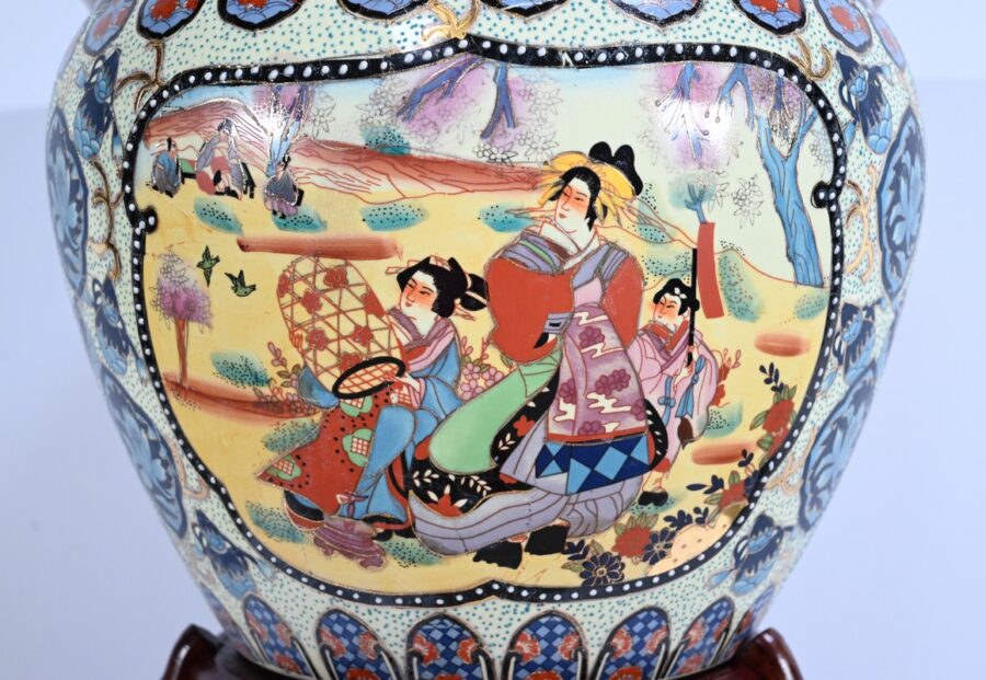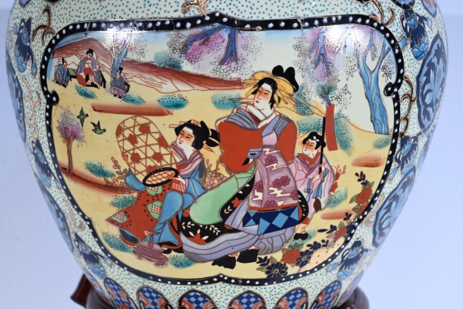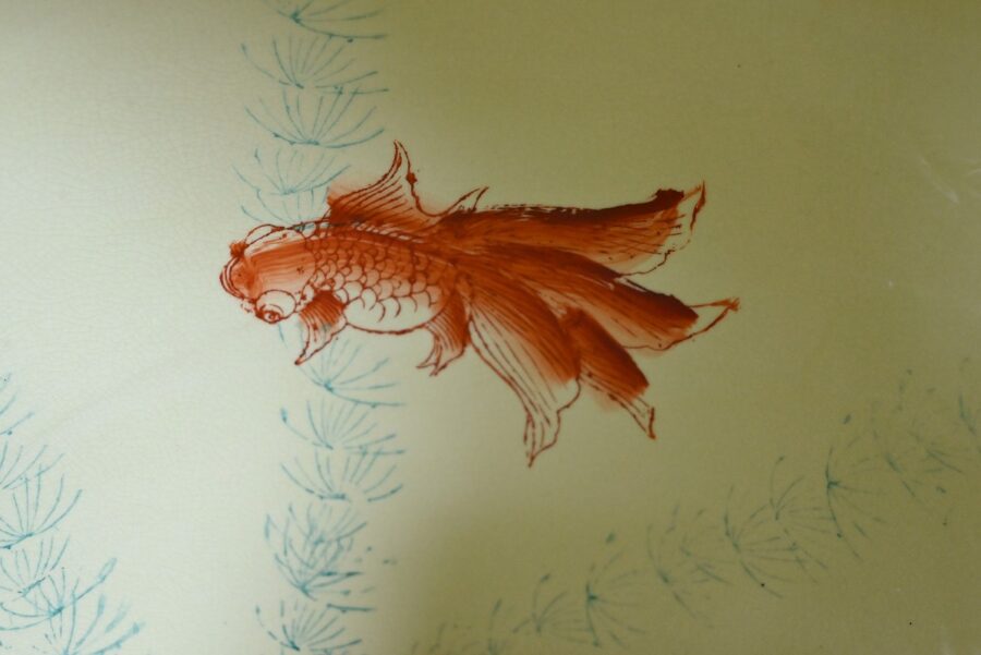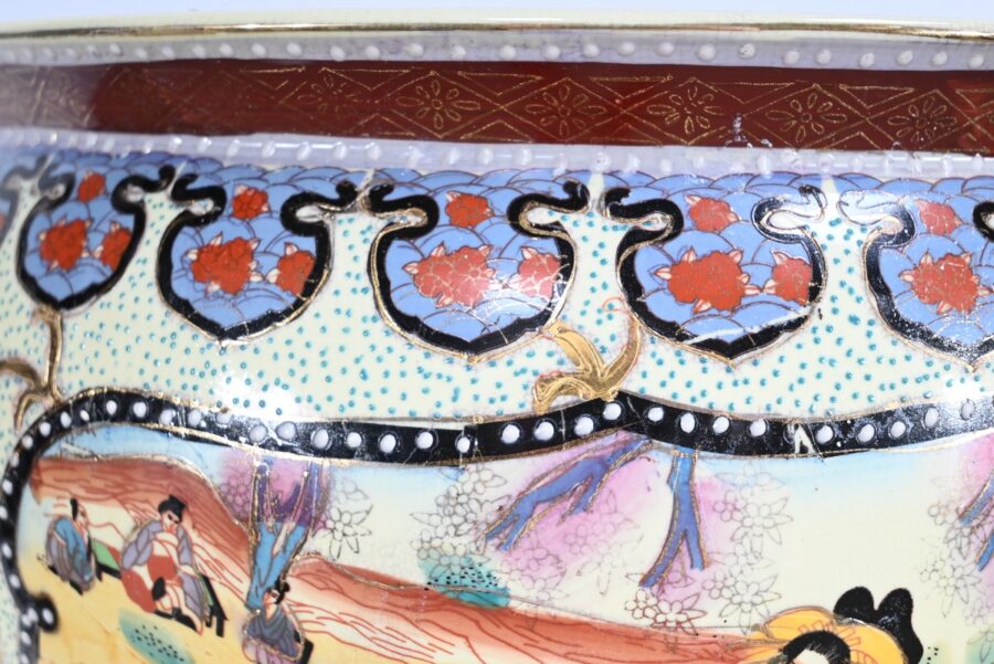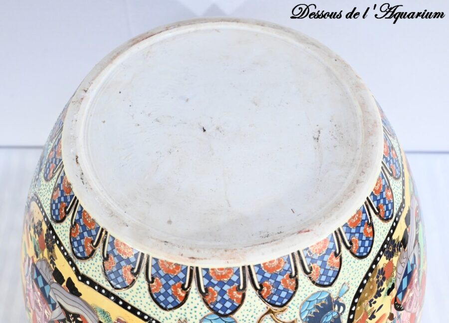 Grand aquarium en porcelaine de Chine polychrome émaillée. Il est orné de scènes chinoises traditionnelles en cartouche sur fond de frises, de fleurs et de volutes dans des couleurs bleu charron, bleu bleuet, jaune champagne et rouge d’andrinople.
