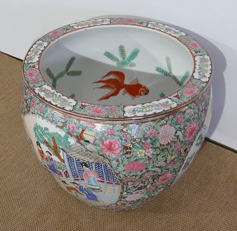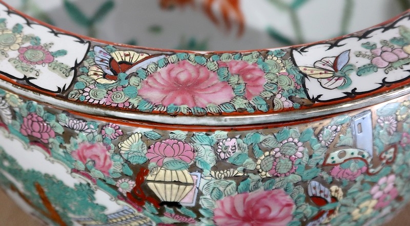 Grand aquarium en porcelaine de Canton polychrome émaillée à décor de fleurs sur fond or et orné de scènes traditionnelles dans des cartouches polylobés.