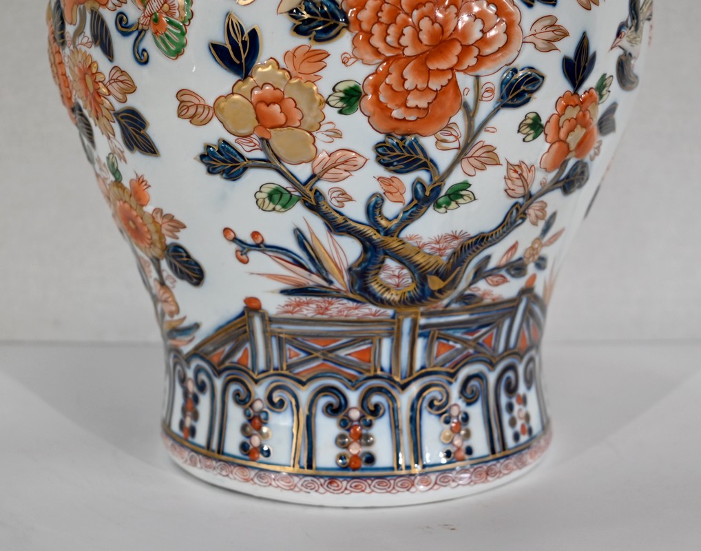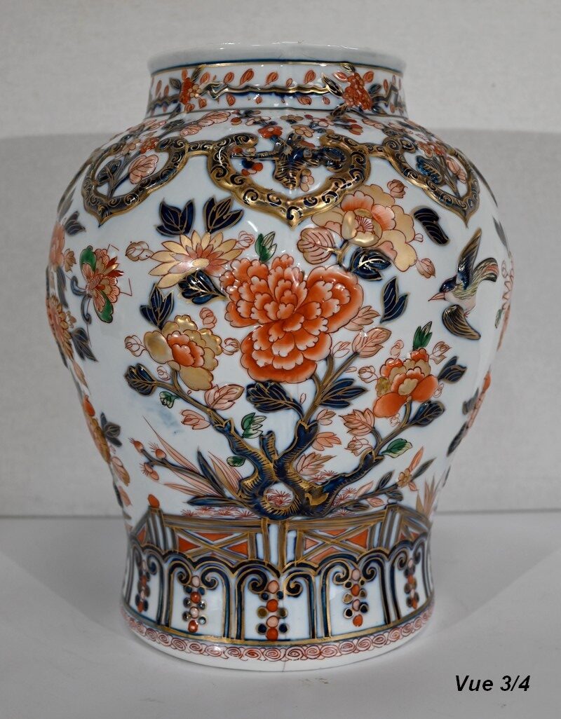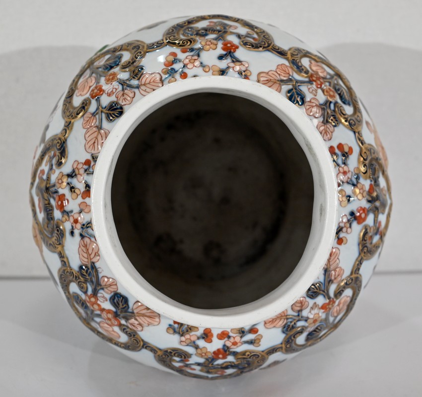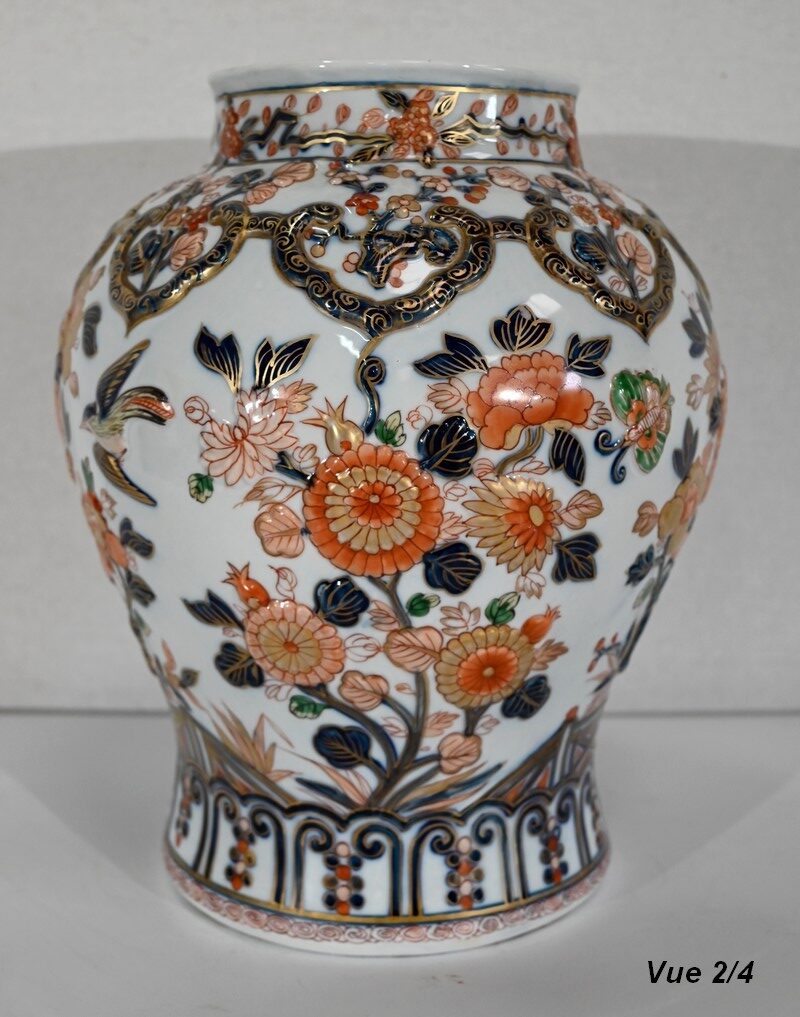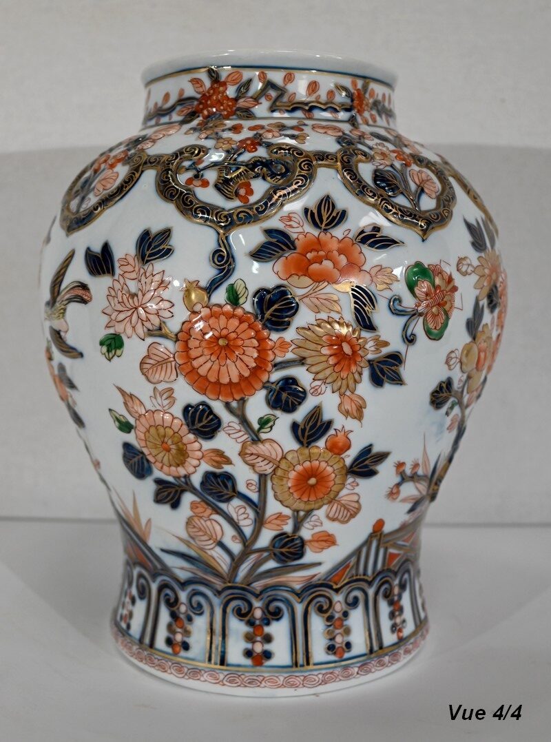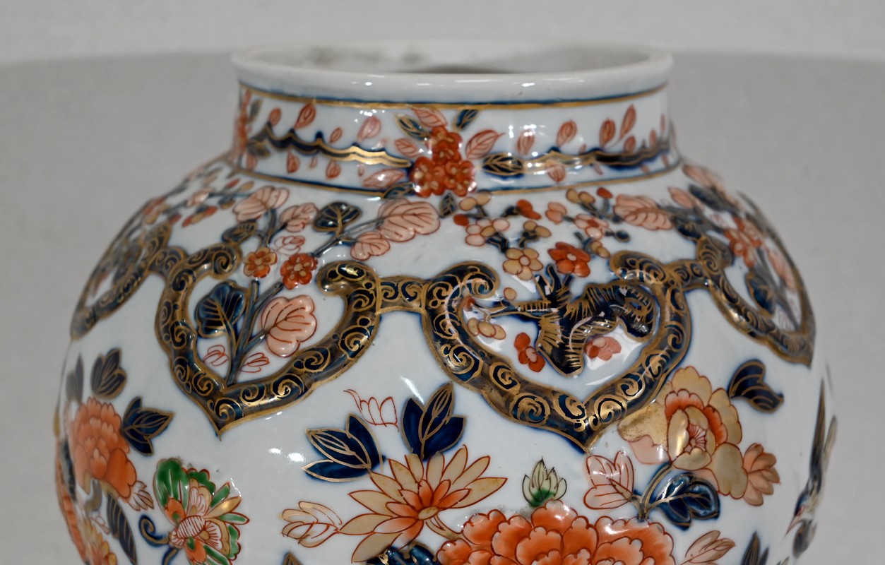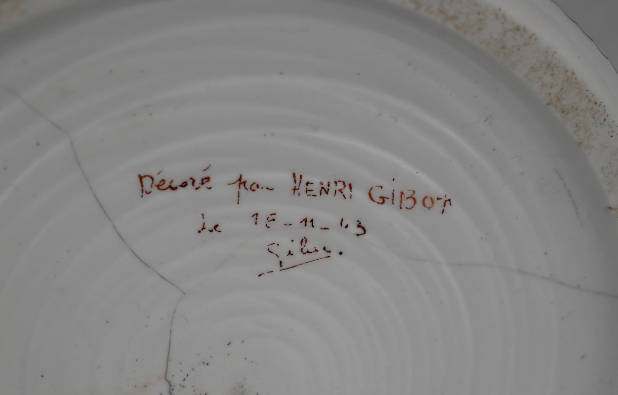 Grand vase pansu, joliment orné de décorations d’inspiration Imari. Ce style d’origine japonaise, apparu au XVIIe siècle, fut repris considérablement par les occidentaux, sensibles à la poésie de cet art. Cette œuvre est signée de l’artiste Henri GIBOT, et datée du 16 Novembre 1943, sous la base.
