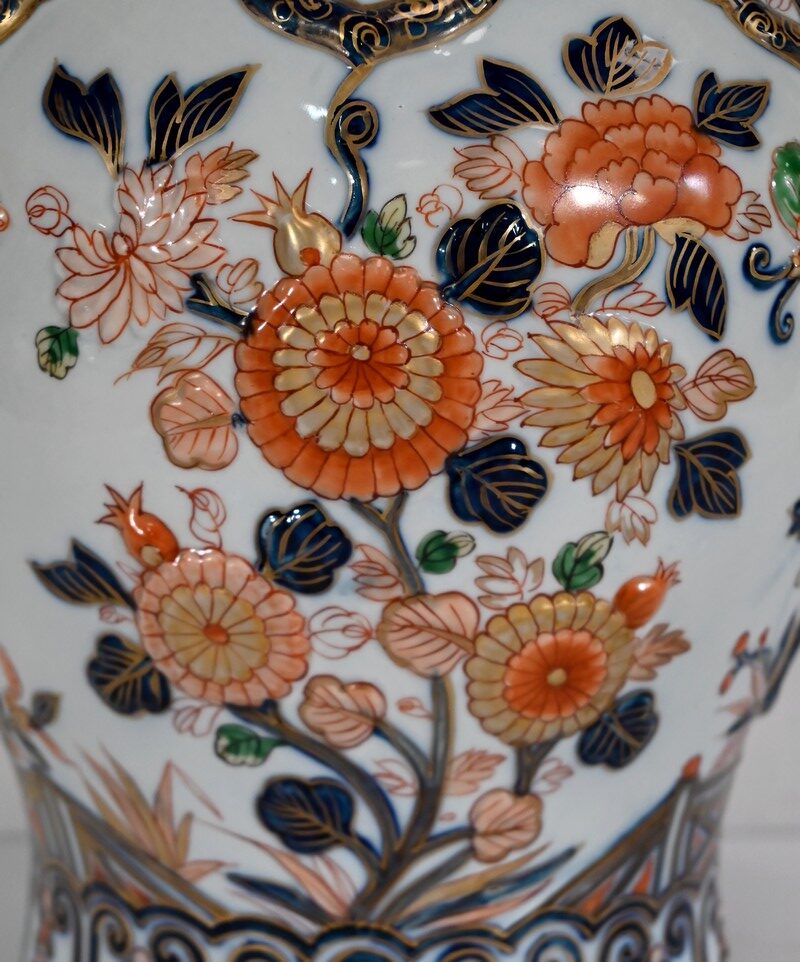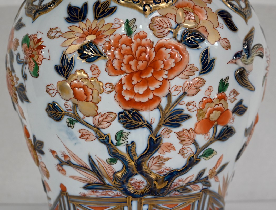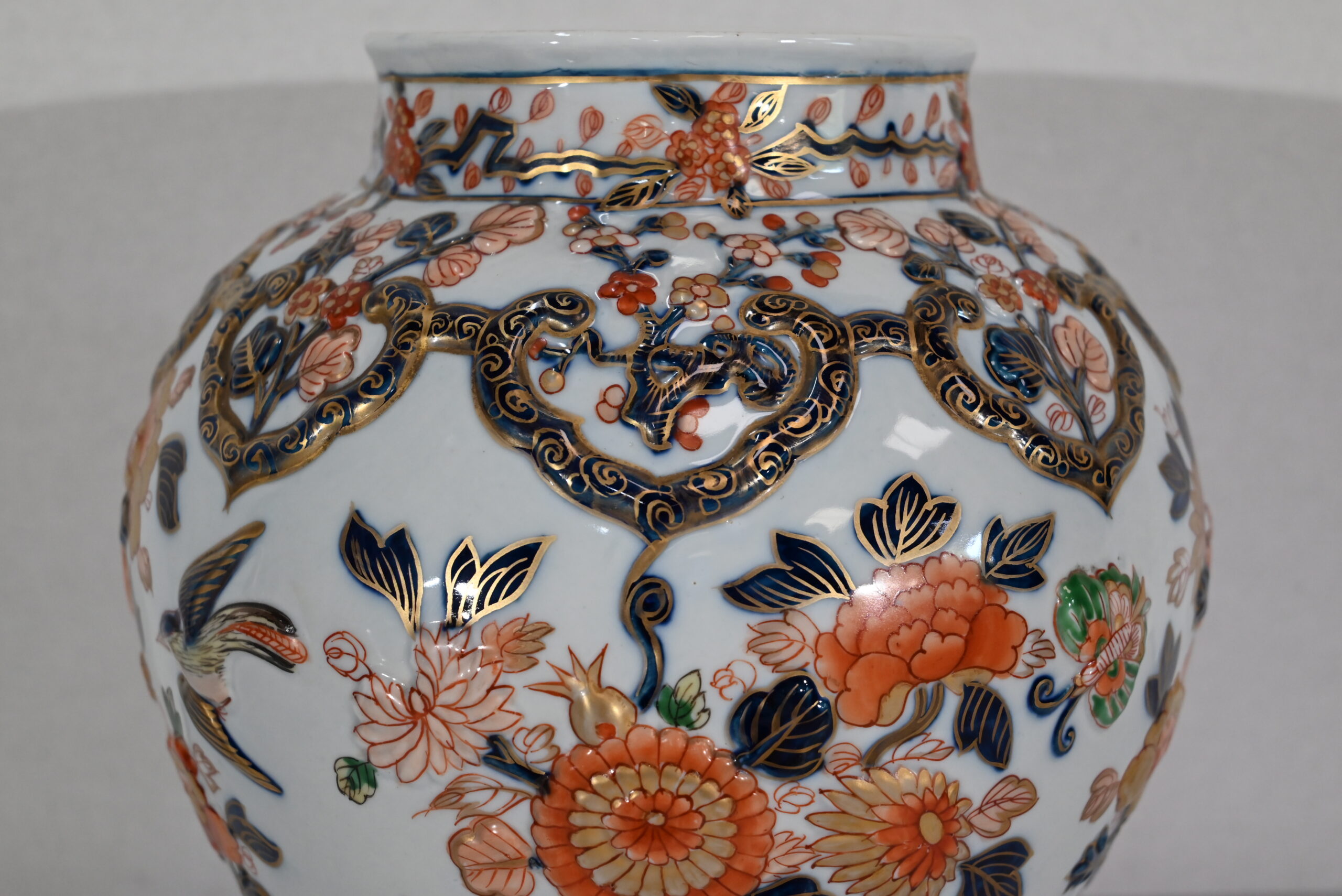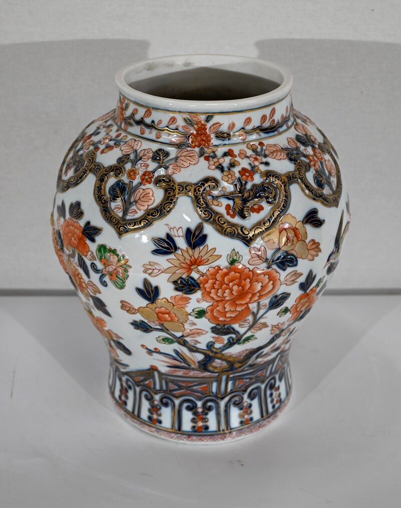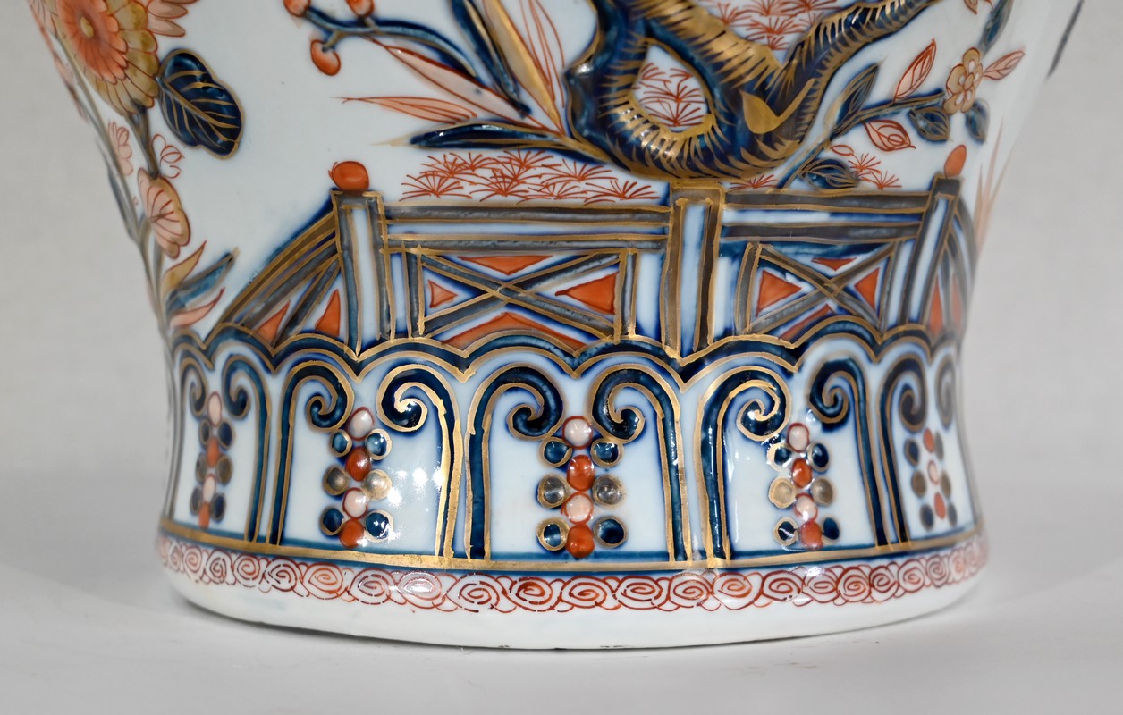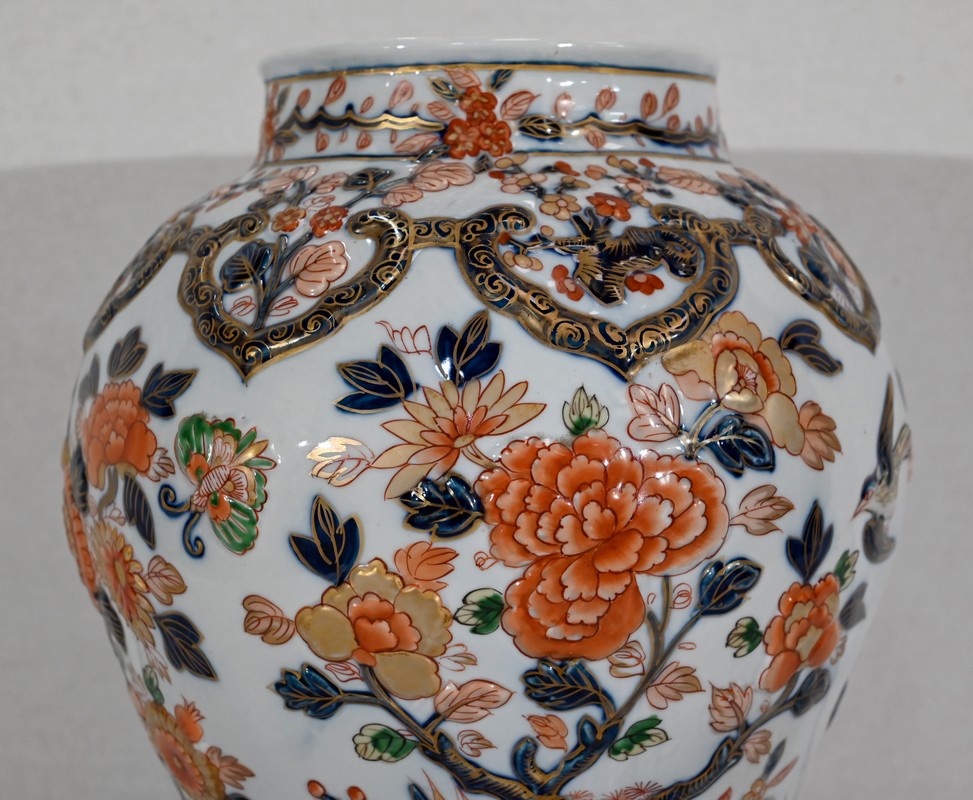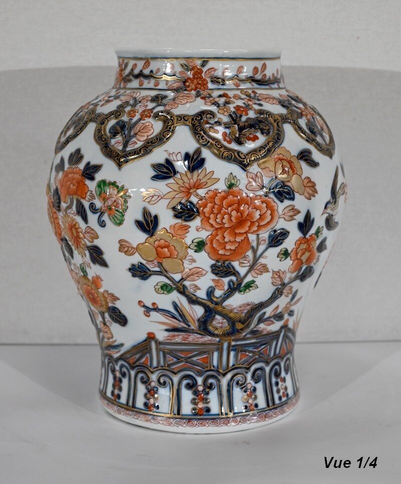 Grand vase pansu, joliment orné de décorations d’inspiration Imari. Ce style d’origine japonaise, apparu au XVIIe siècle, fut repris considérablement par les occidentaux, sensibles à la poésie de cet art. Cette œuvre est signée de l’artiste Henri GIBOT, et datée du 16 Novembre 1943, sous la base.