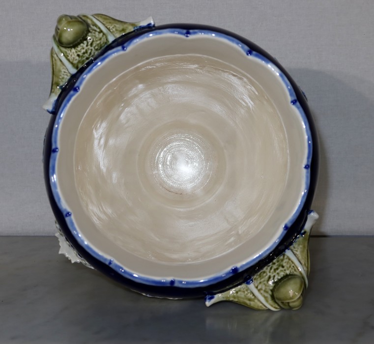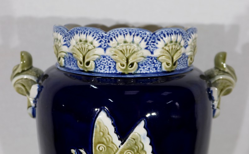 Important Vase en Faïence estampillé de la maison De Bruyn, faïencerie renommée du quartier de Fives à Lille, de 1864 jusqu’à sa fermeture en 1950. Cette céramique à décor de papillon et de chardons, portant la référence « n° 3185 BIS », a été éditée en différents coloris. Celle-ci présente un fond bleu nuit, tandis que les jolis décors en relief, ainsi que les anses rappelant une chrysalide, arborent un ton vert d’eau nuancé.