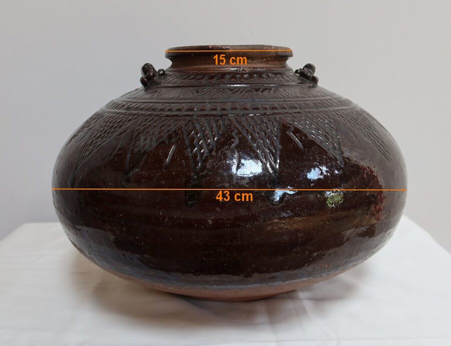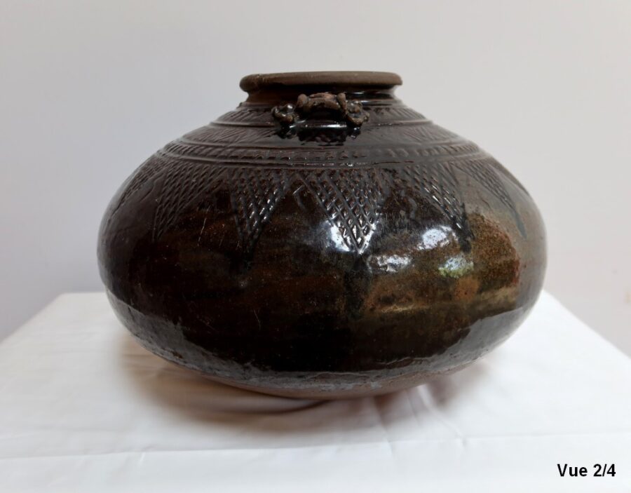 Ce vase très pansu, en terre cuite vernissée dans les tons marron vert, est décoré de motifs géométriques.