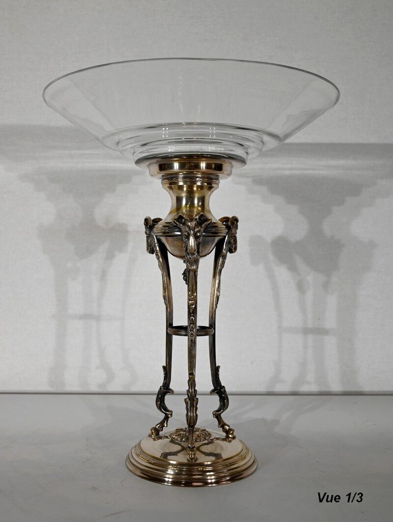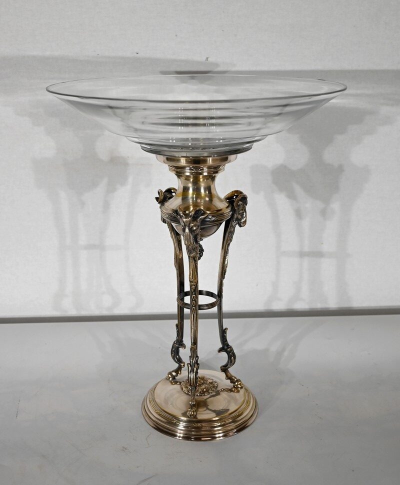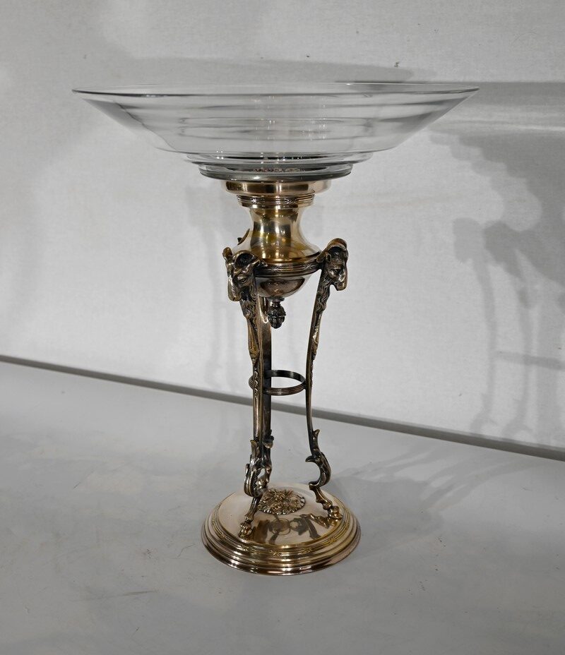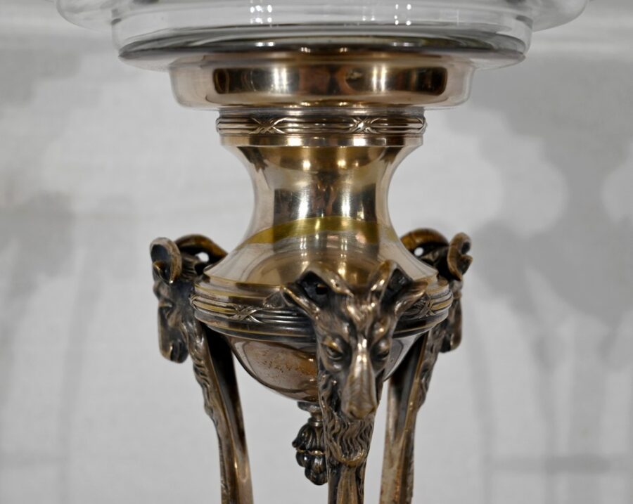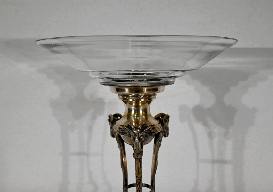 Coupe en Verre à dégradé reposant sur un ensemble en laiton, composé de 3 supports. Ceux-ci représentent une tête de bélier en partie haute, et se terminent en partie basse par un sabot. Ils sont fixés sur une base en laiton festonné, avec en son centre un macaron en bronze, identique à celui à l’intérieur de la coupe.