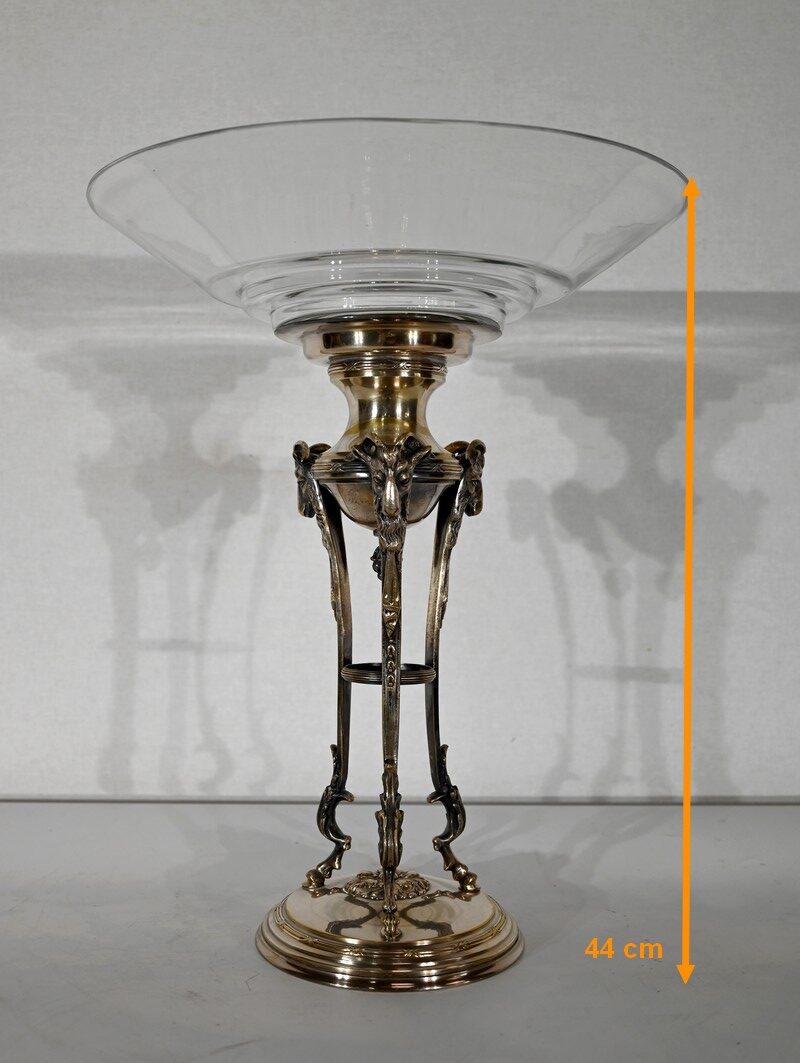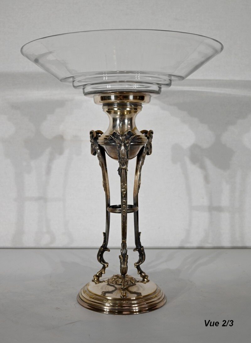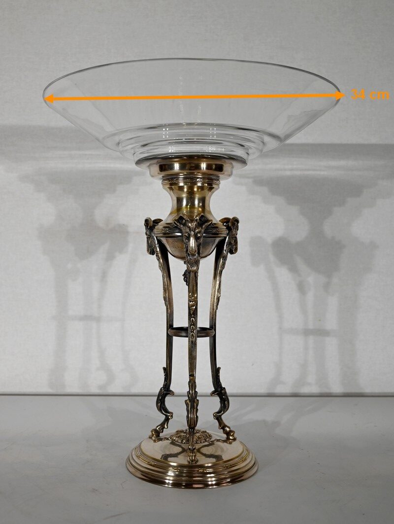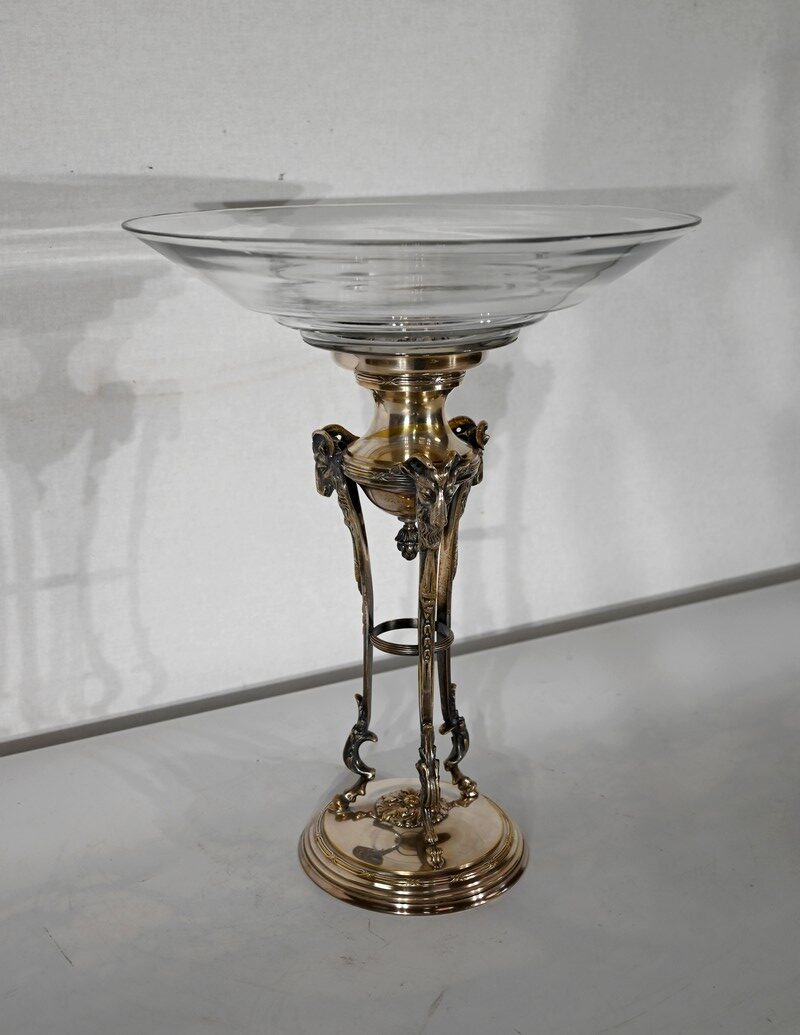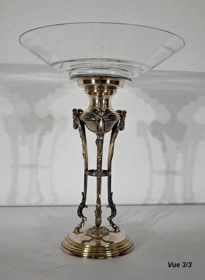Coupe en Verre à dégradé reposant sur un ensemble en laiton, composé de 3 supports. Ceux-ci représentent une tête de bélier en partie haute, et se terminent en partie basse par un sabot. Ils sont fixés sur une base en laiton festonné, avec en son centre un macaron en bronze, identique à celui à l’intérieur de la coupe.