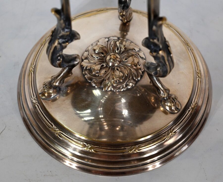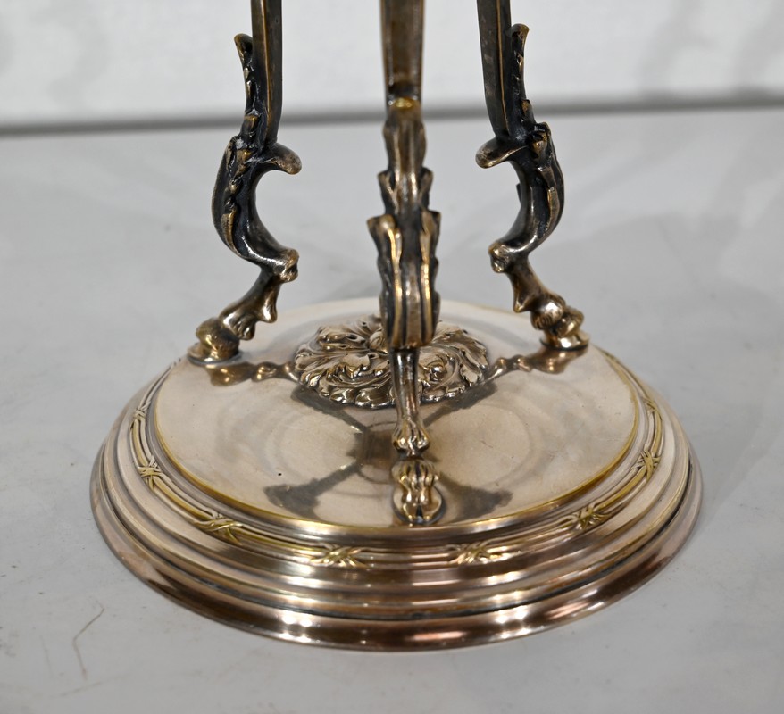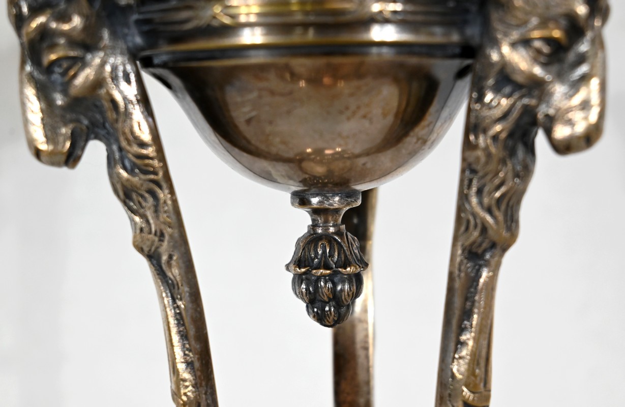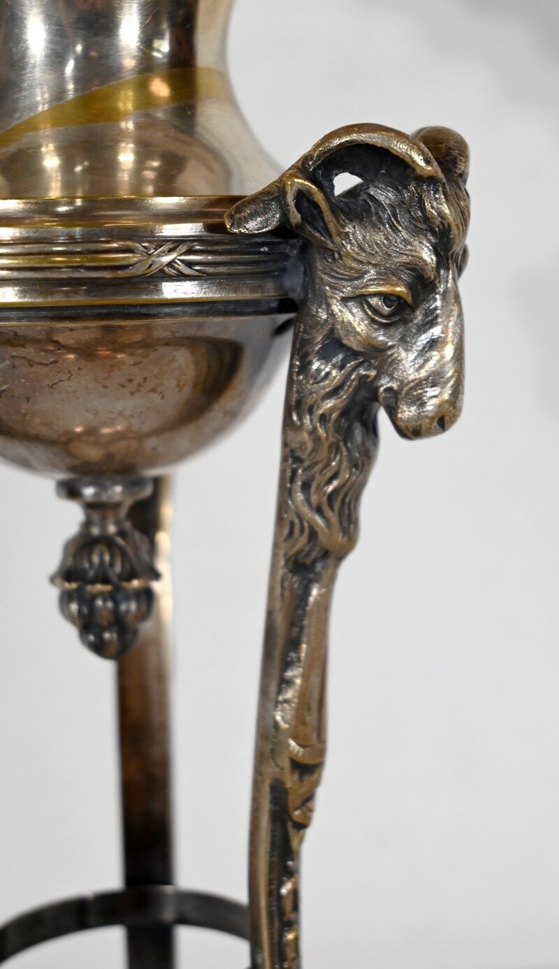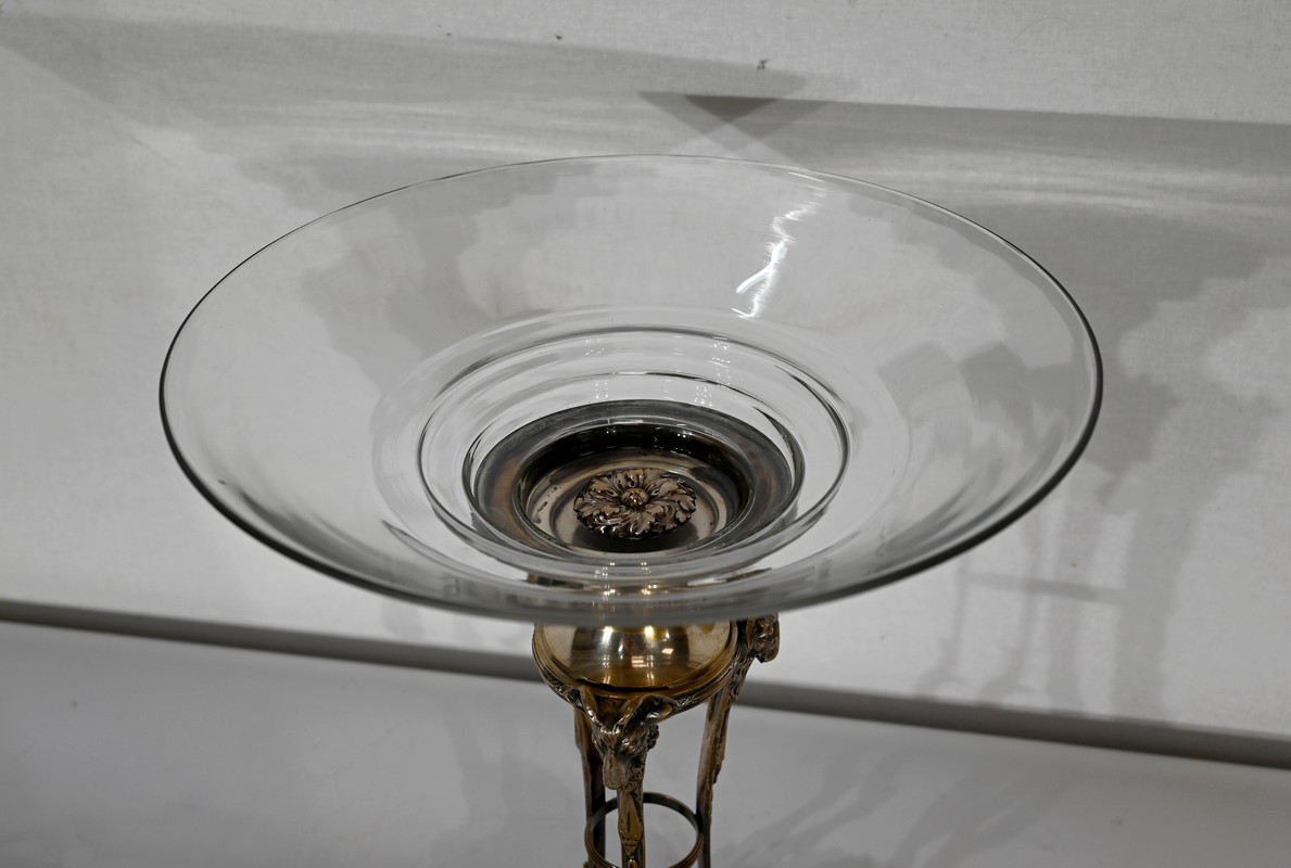 Coupe en Verre à dégradé reposant sur un ensemble en laiton, composé de 3 supports. Ceux-ci représentent une tête de bélier en partie haute, et se terminent en partie basse par un sabot. Ils sont fixés sur une base en laiton festonné, avec en son centre un macaron en bronze, identique à celui à l’intérieur de la coupe.