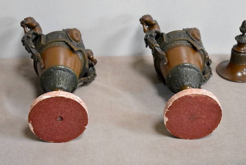 Le pied mouluré et à décors floraux repose sur un socle rond en marbre Rose vif des Pyrénées mouluré en gorge , le dessous est recouvert d’une feutrine rouge en l’état.