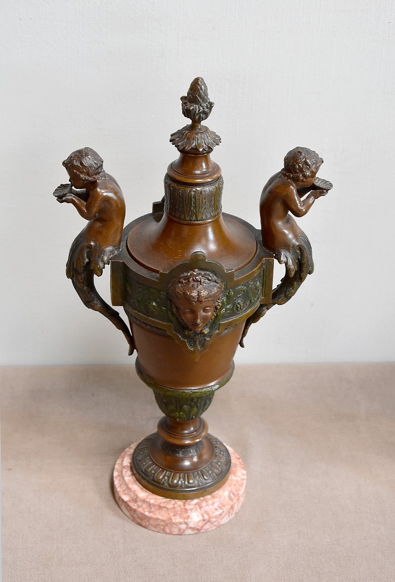 Les anses sont à décors d’enfants-tritons tenant en coupe dans leurs mains un coquillage porté à leurs lèvres.