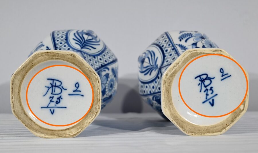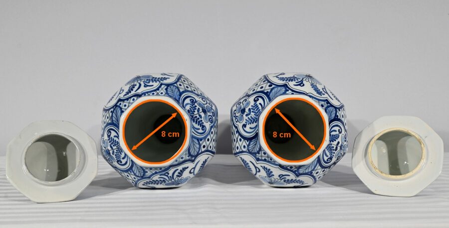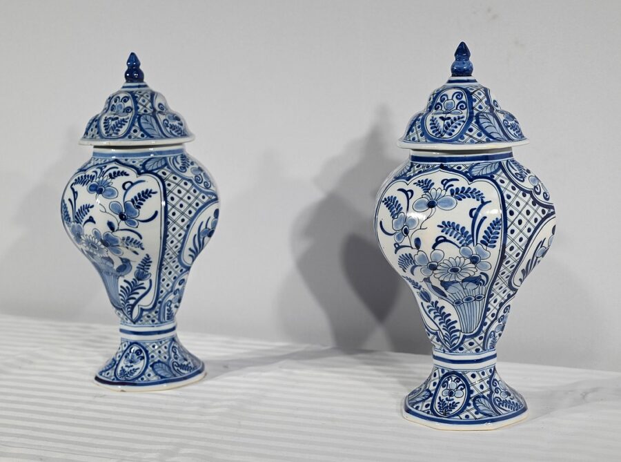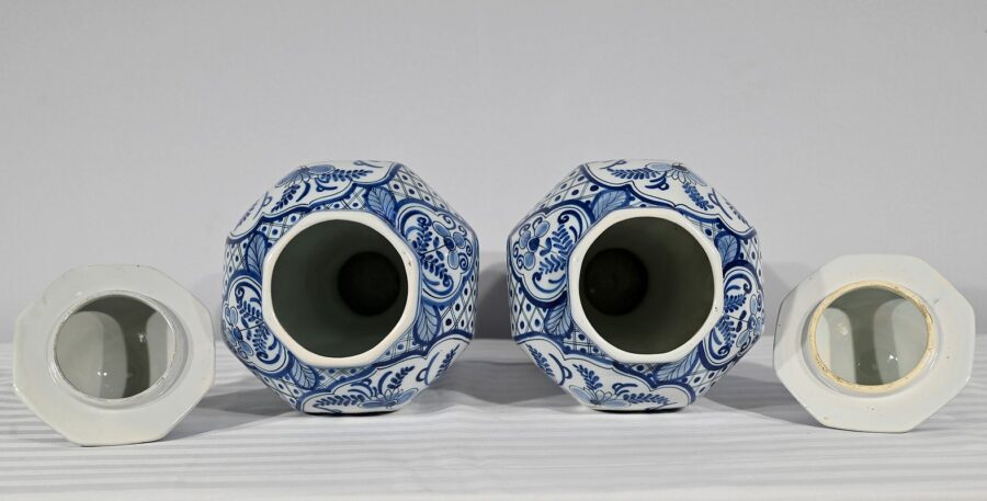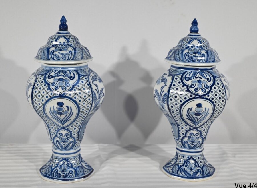 Ces vases, signés sous chaque fond, se structure d’un email blanc brillant et de motifs « bleu de Delft ». Ils sont illustrés de décors identiques mais inversés, de fleurs, de feuillage, et d’oiseaux en cartouche, entourés de quadrillage. Les couvercles sont sommés de boutons de préhension en pointe.