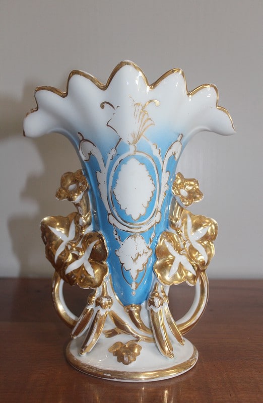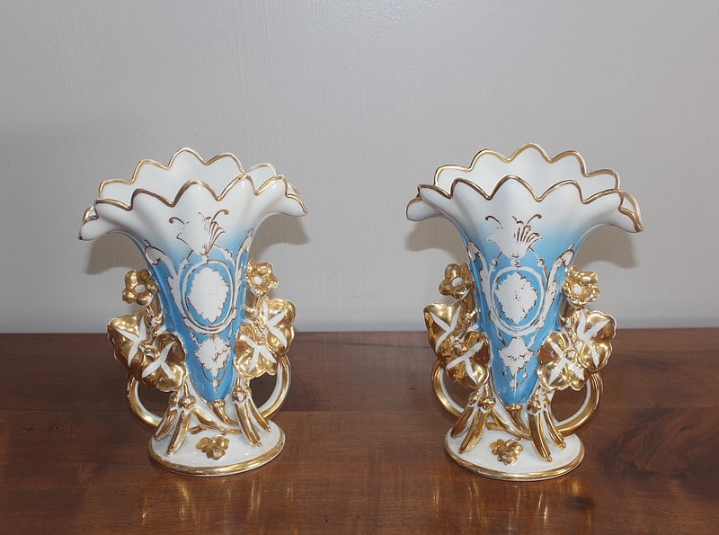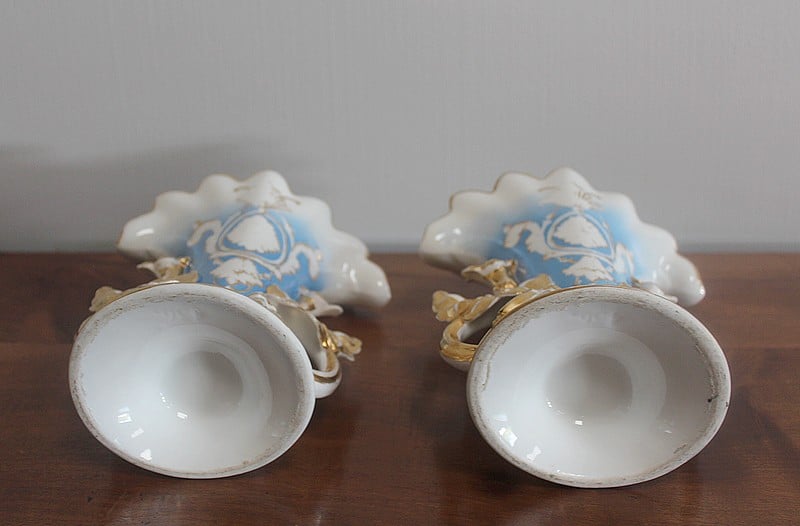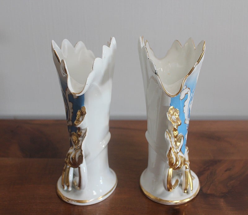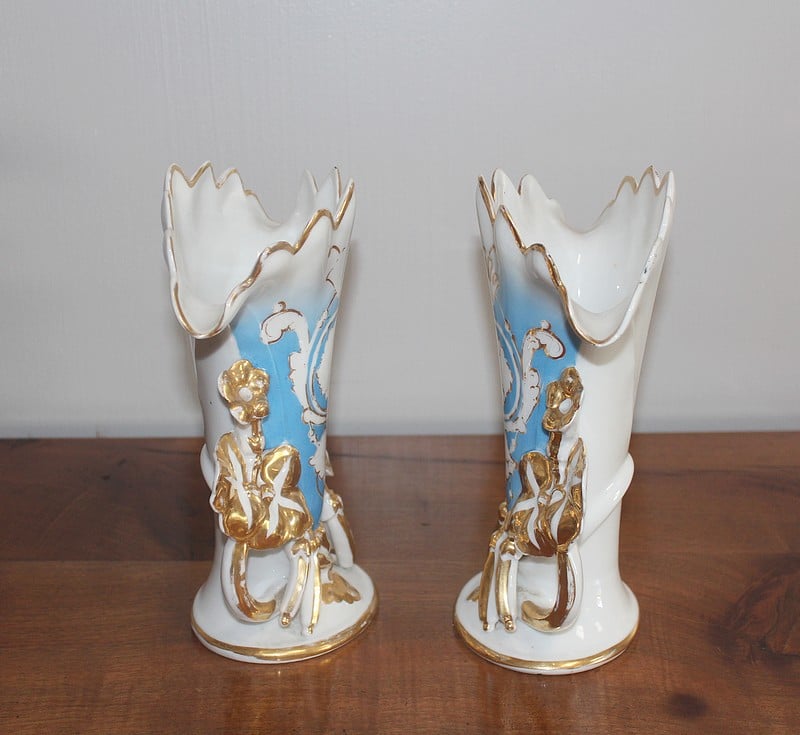 Paire de vases de mariage en porcelaine blanche, avec anses, le devant peint en bleu et décor de fleurs doré à l’or fin.