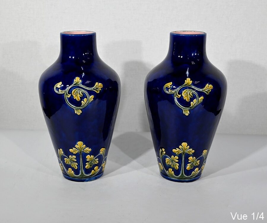 Paire de vases balustres Art Nouveau, en céramique de couleur bleu cobalt, décorés de fleurs jaunes et de feuillages.