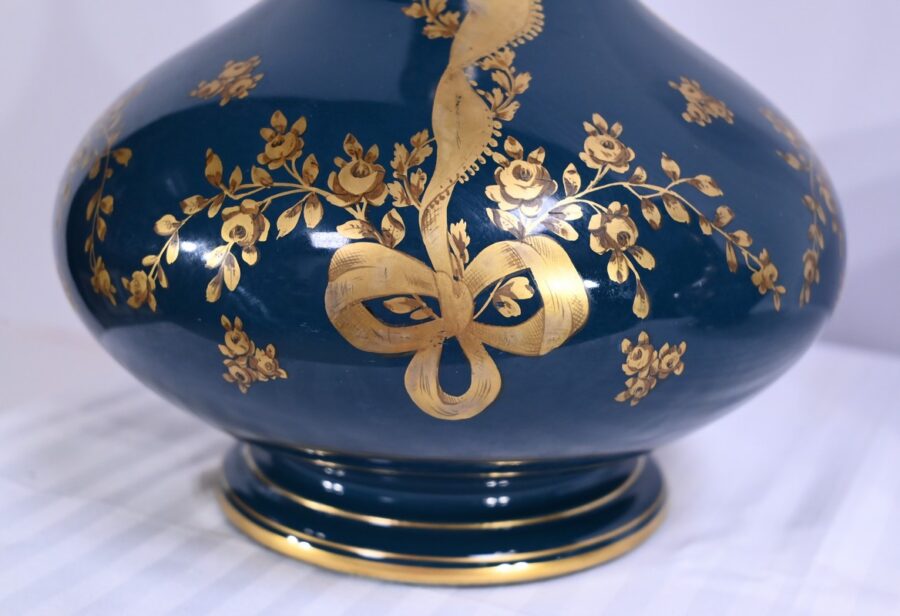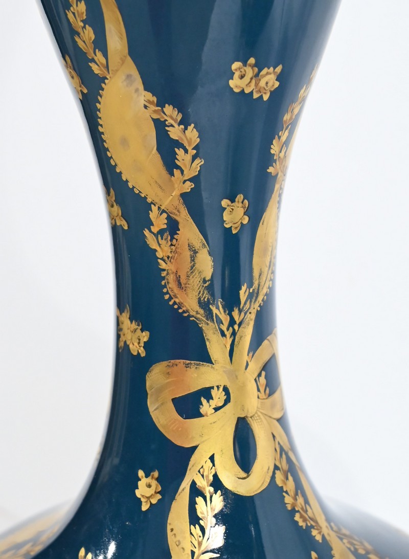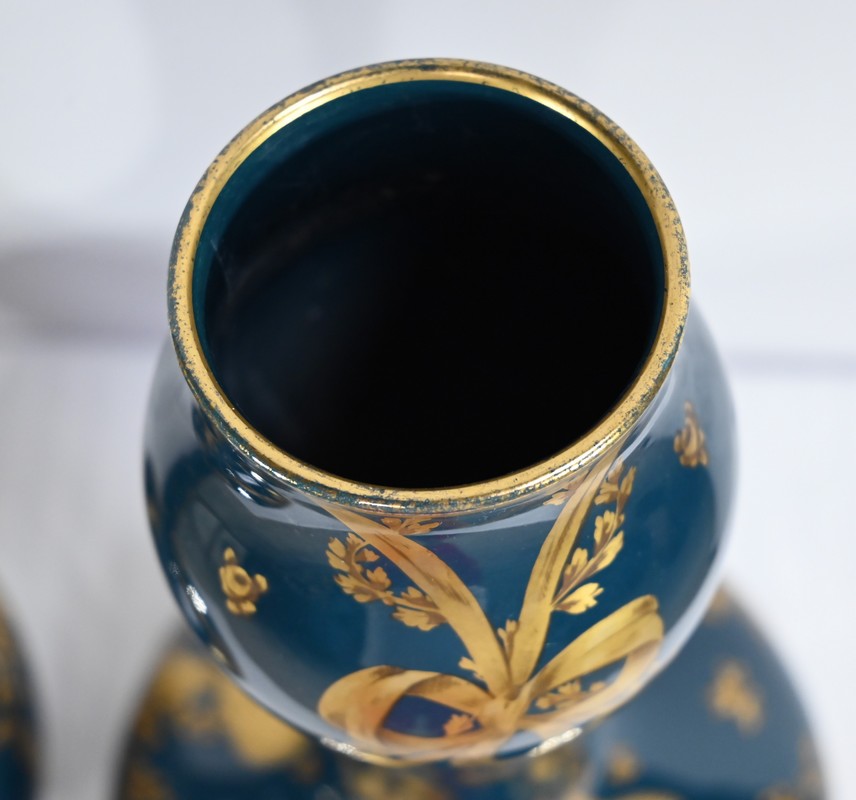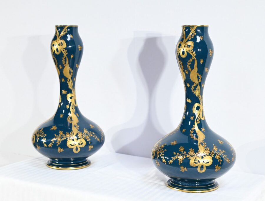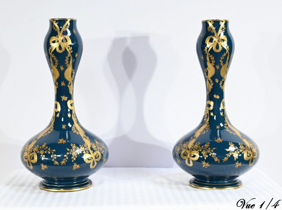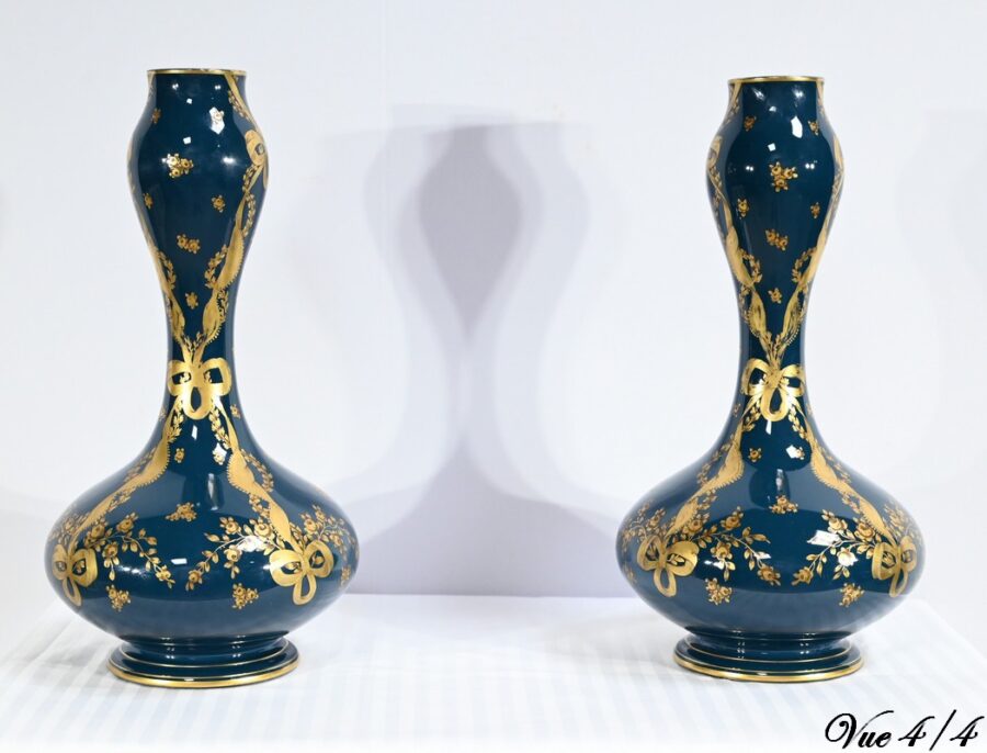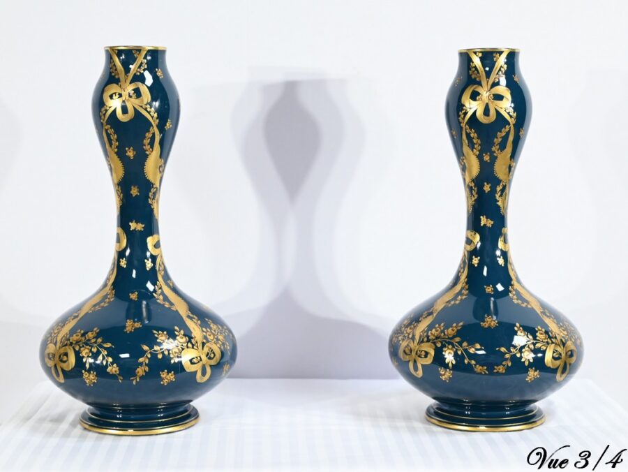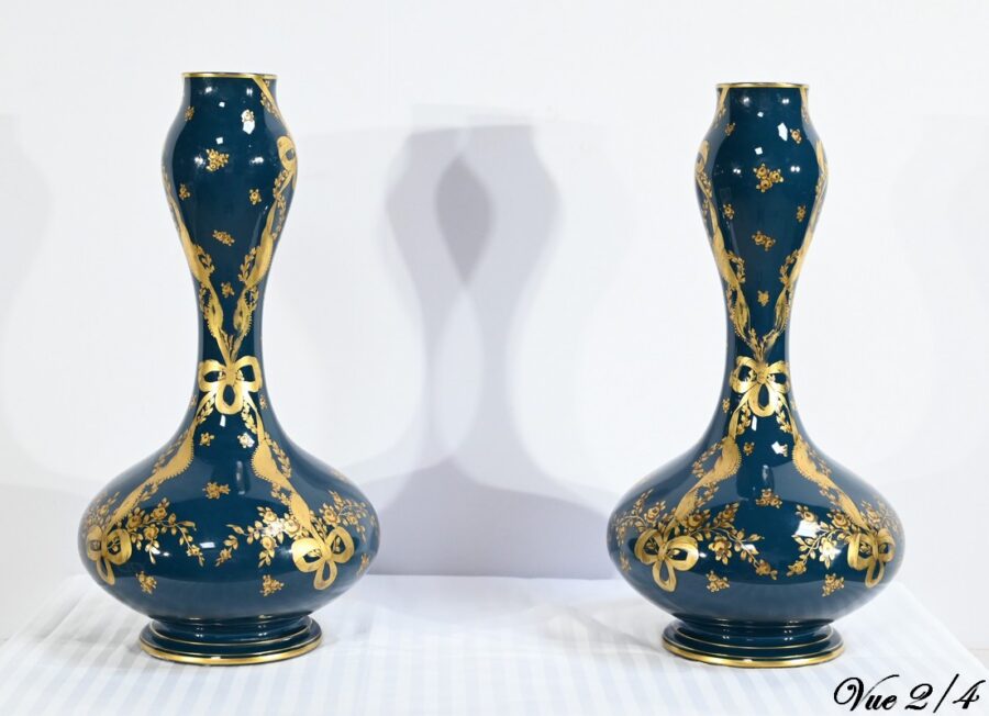 Paire de vases en céramique de Gien, datant de la fin du XIXe siècle, à décors dorés de rubans noués et de fleurs sur fond couleur bleu d’Anvers.