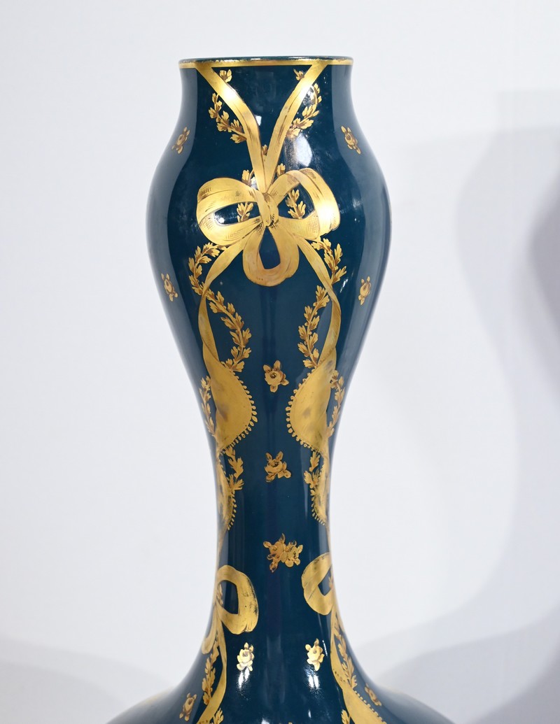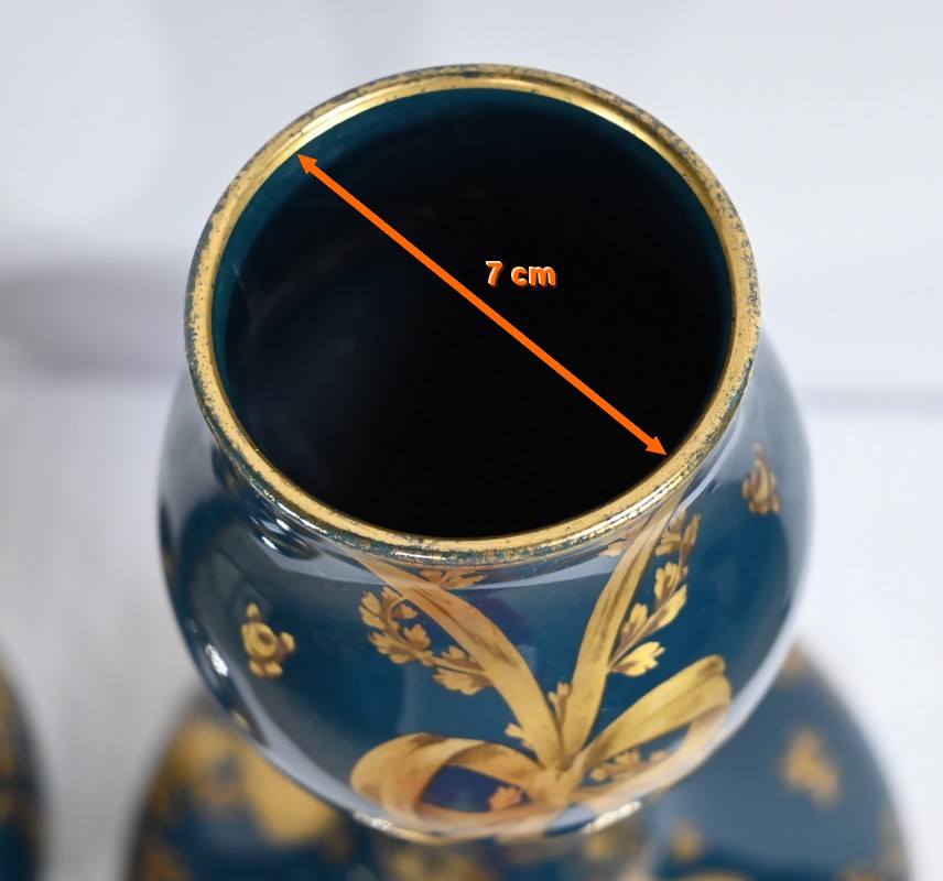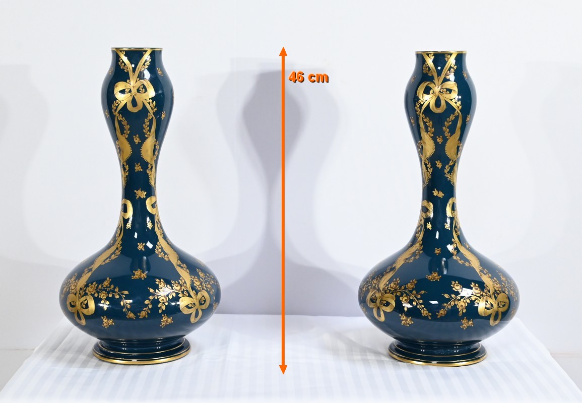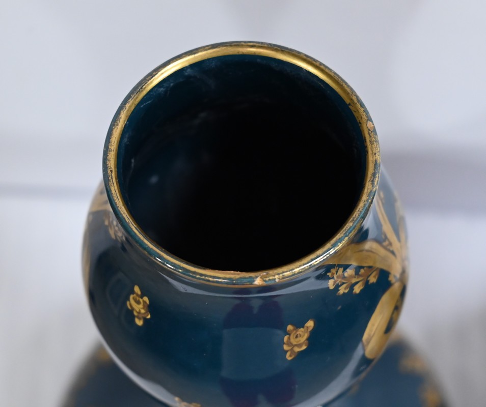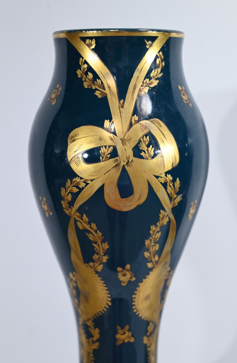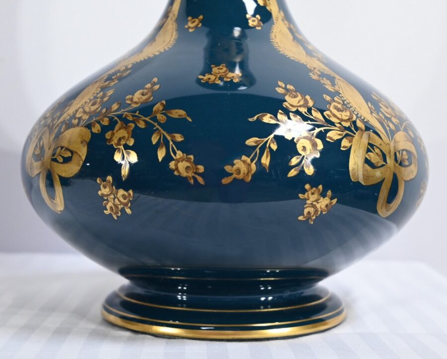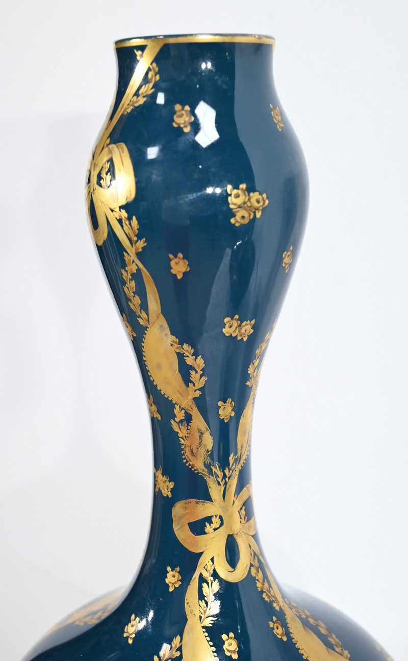 Paire de vases en céramique de Gien, datant de la fin du XIXe siècle, à décors dorés de rubans noués et de fleurs sur fond couleur bleu d’Anvers.