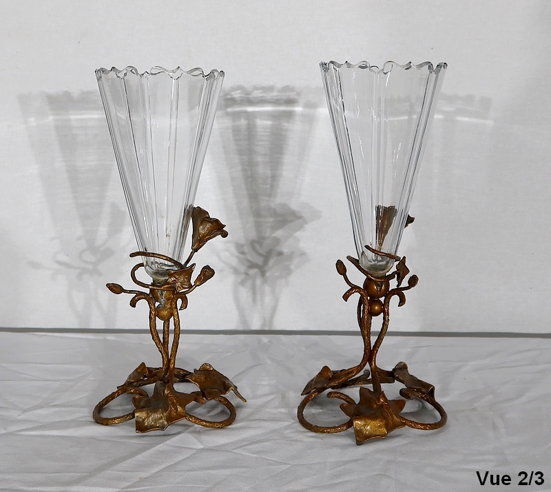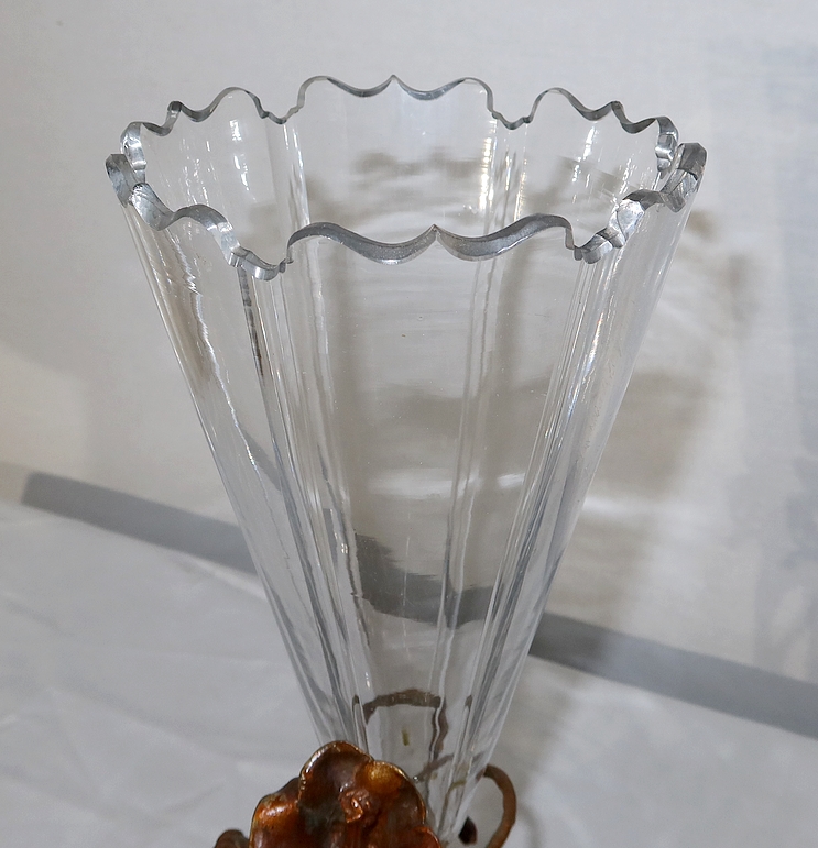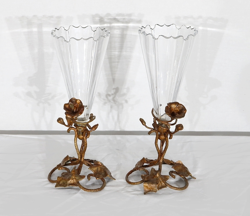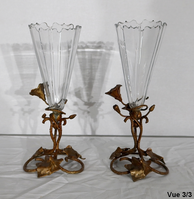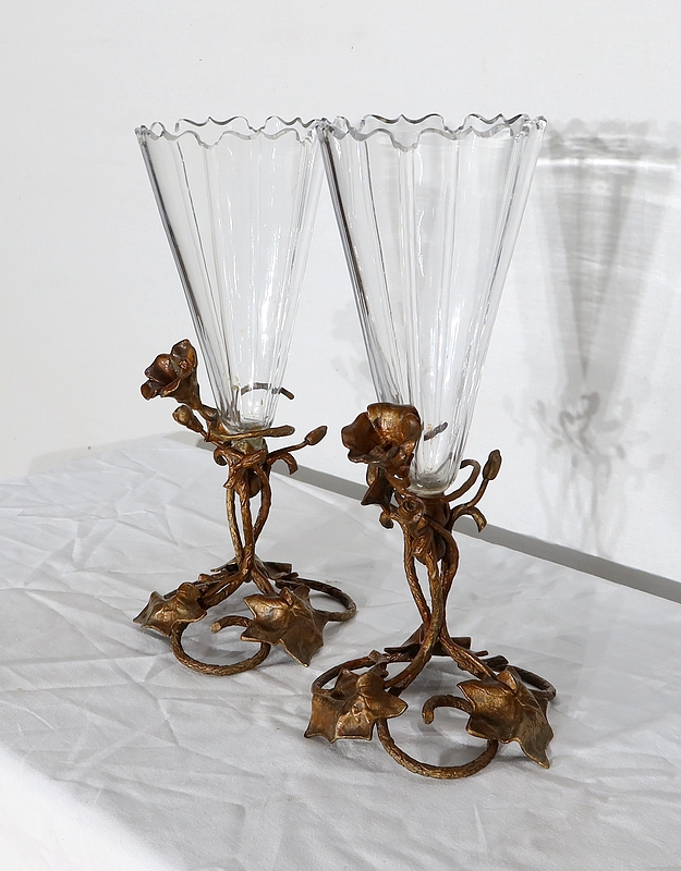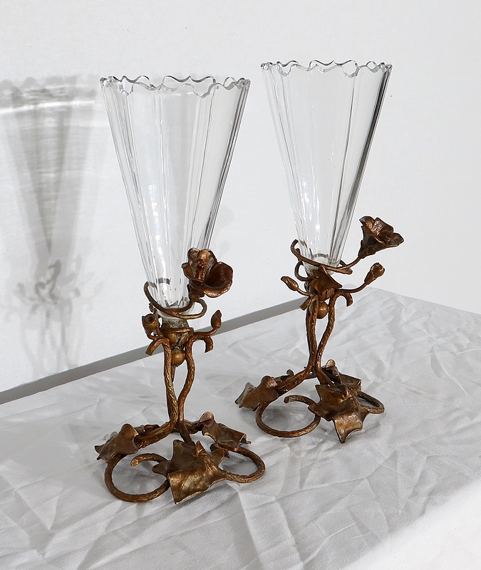 Paire de Vases dits à Cornet composés d’une partie conique en Cristal à découpe sur le dessus et rainuré sur le plan vertical. Chaque vase repose sur une base en laiton patiné de couleur mordoré. Cette monture à décor de fleurs et de feuilles de lierre entoure la base du cristal dans un mouvement harmonieux. D’épaisses tiges entremêlées forment un trépied stable pour ces vases aux courbes inspirées de la nature.