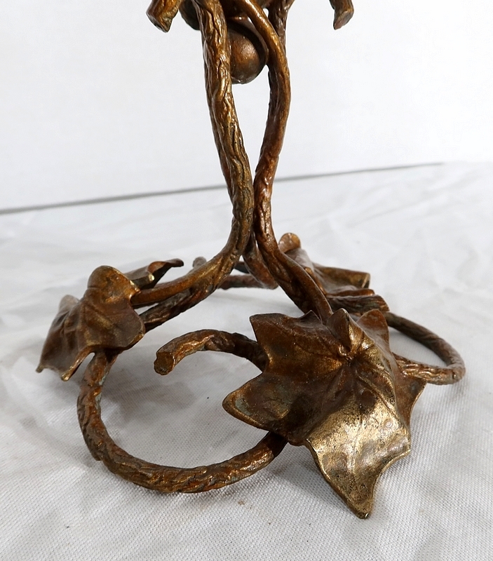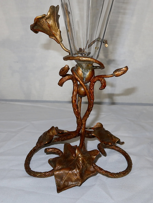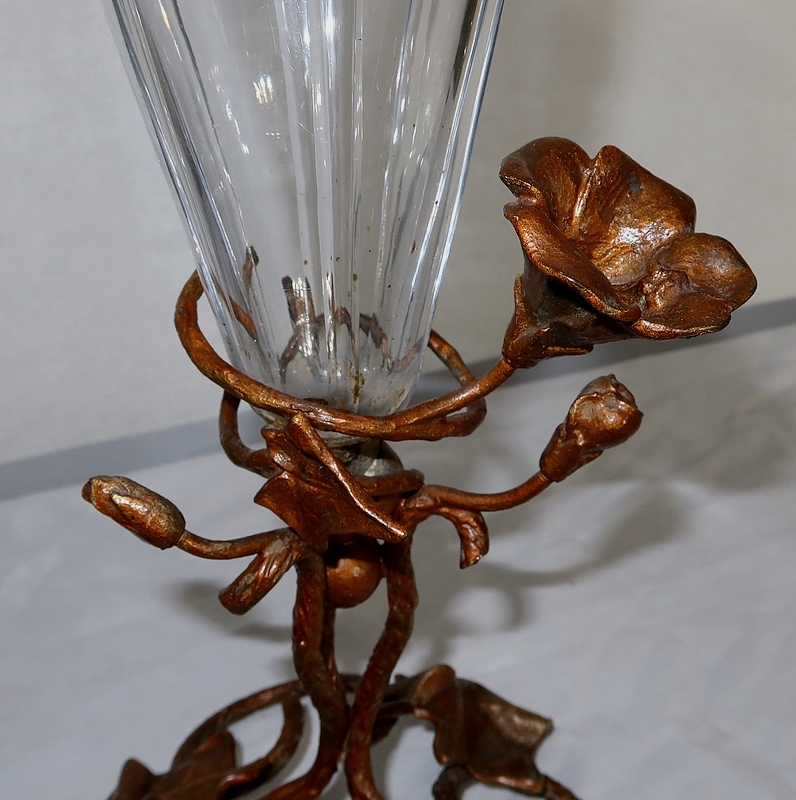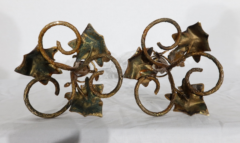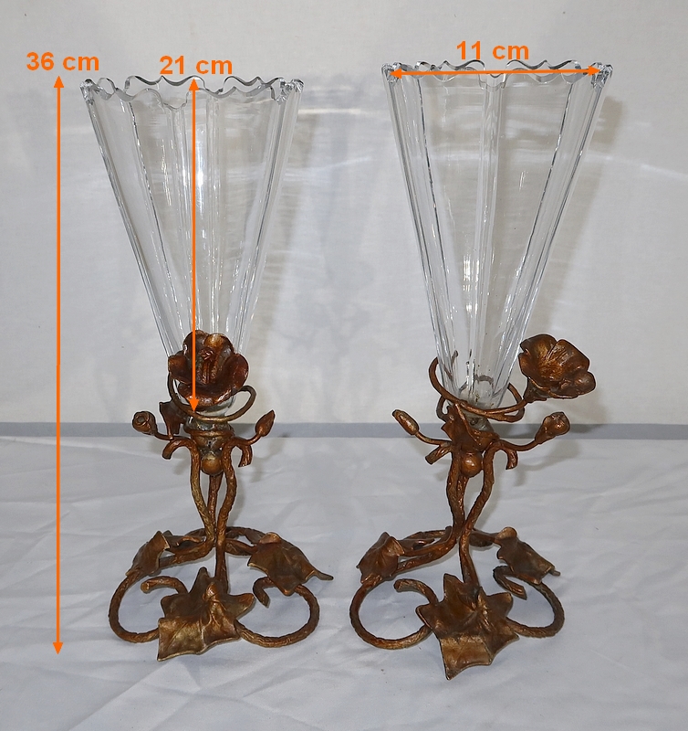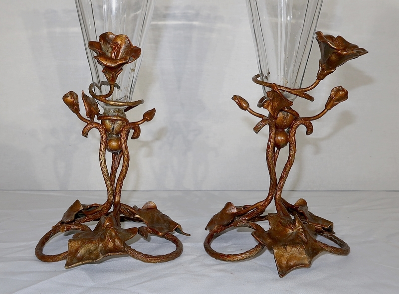 Paire de Vases dits à Cornet composés d’une partie conique en Cristal à découpe sur le dessus et rainuré sur le plan vertical. Chaque vase repose sur une base en laiton patiné de couleur mordoré. Cette monture à décor de fleurs et de feuilles de lierre entoure la base du cristal dans un mouvement harmonieux. D’épaisses tiges entremêlées forment un trépied stable pour ces vases aux courbes inspirées de la nature.