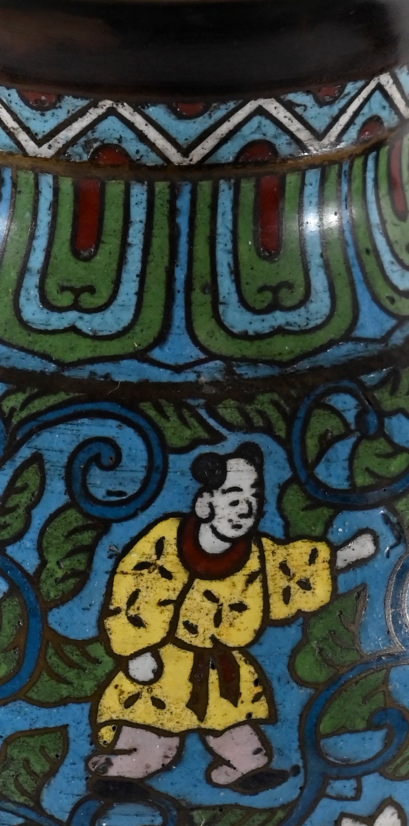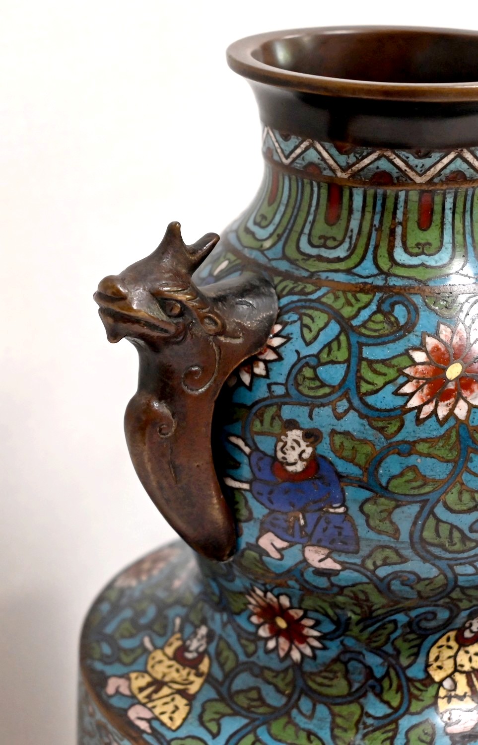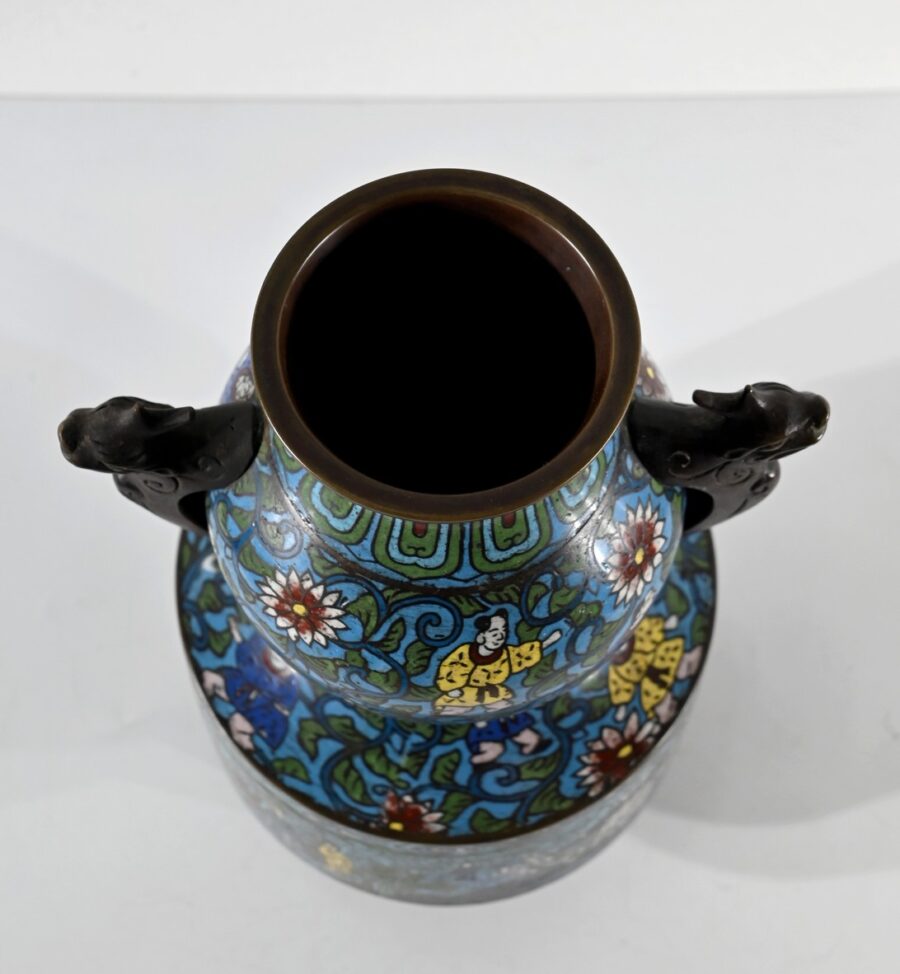 La partie plus haute, arrondie, a des anses en chiens de Fao en bronze ; des personnages se perdent dans des fleurs et feuillages, amenant au col orné de frises, puis à la lèvre en cuivre.