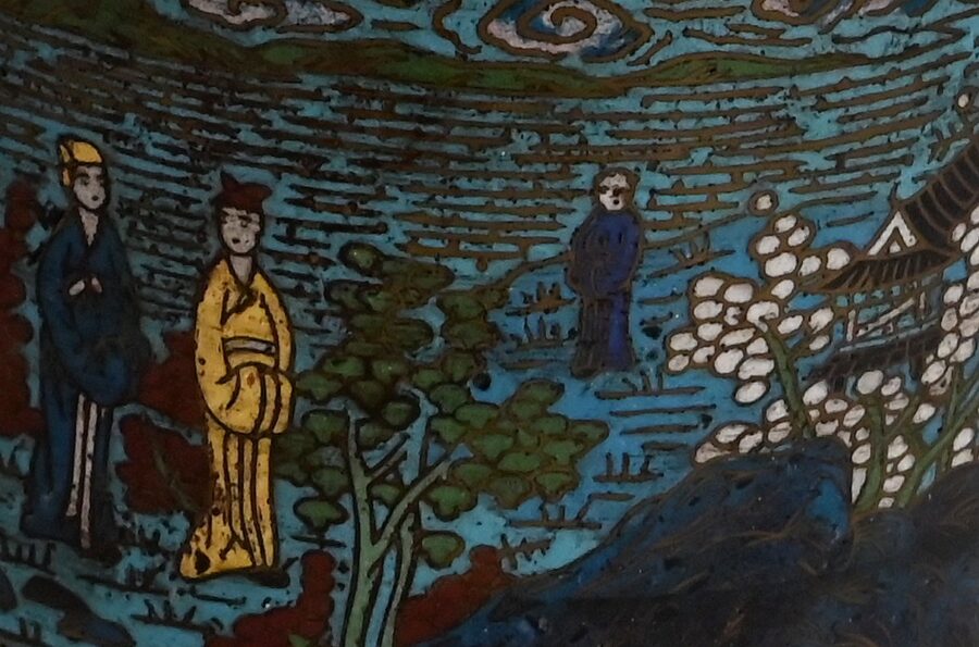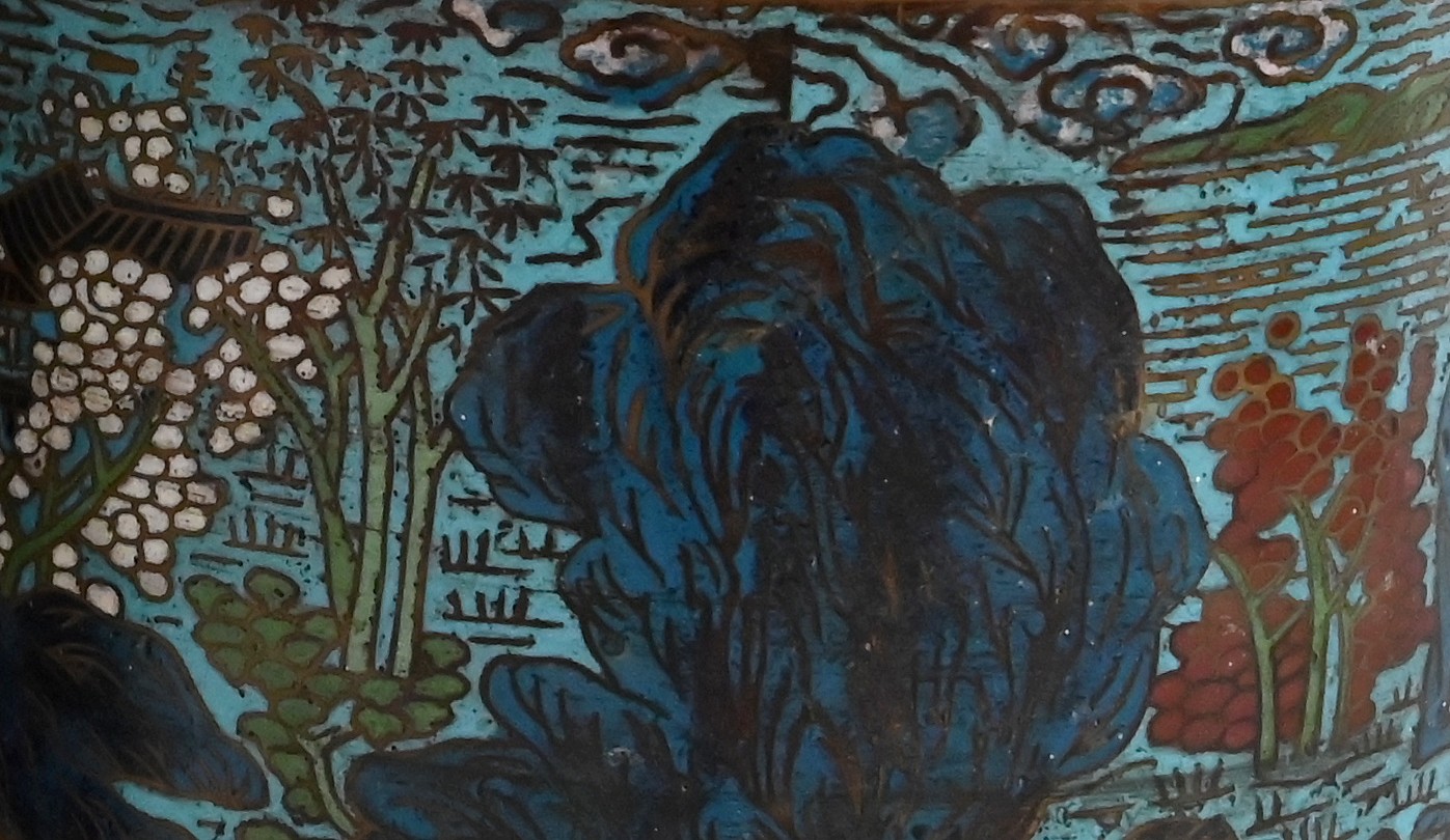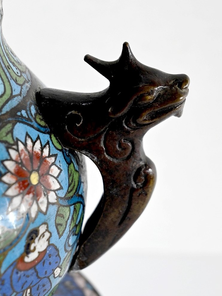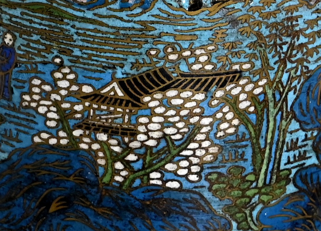 La partie plus haute, arrondie, a des anses en chiens de Fao en bronze ; des personnages se perdent dans des fleurs et feuillages, amenant au col orné de frises, puis à la lèvre en cuivre.