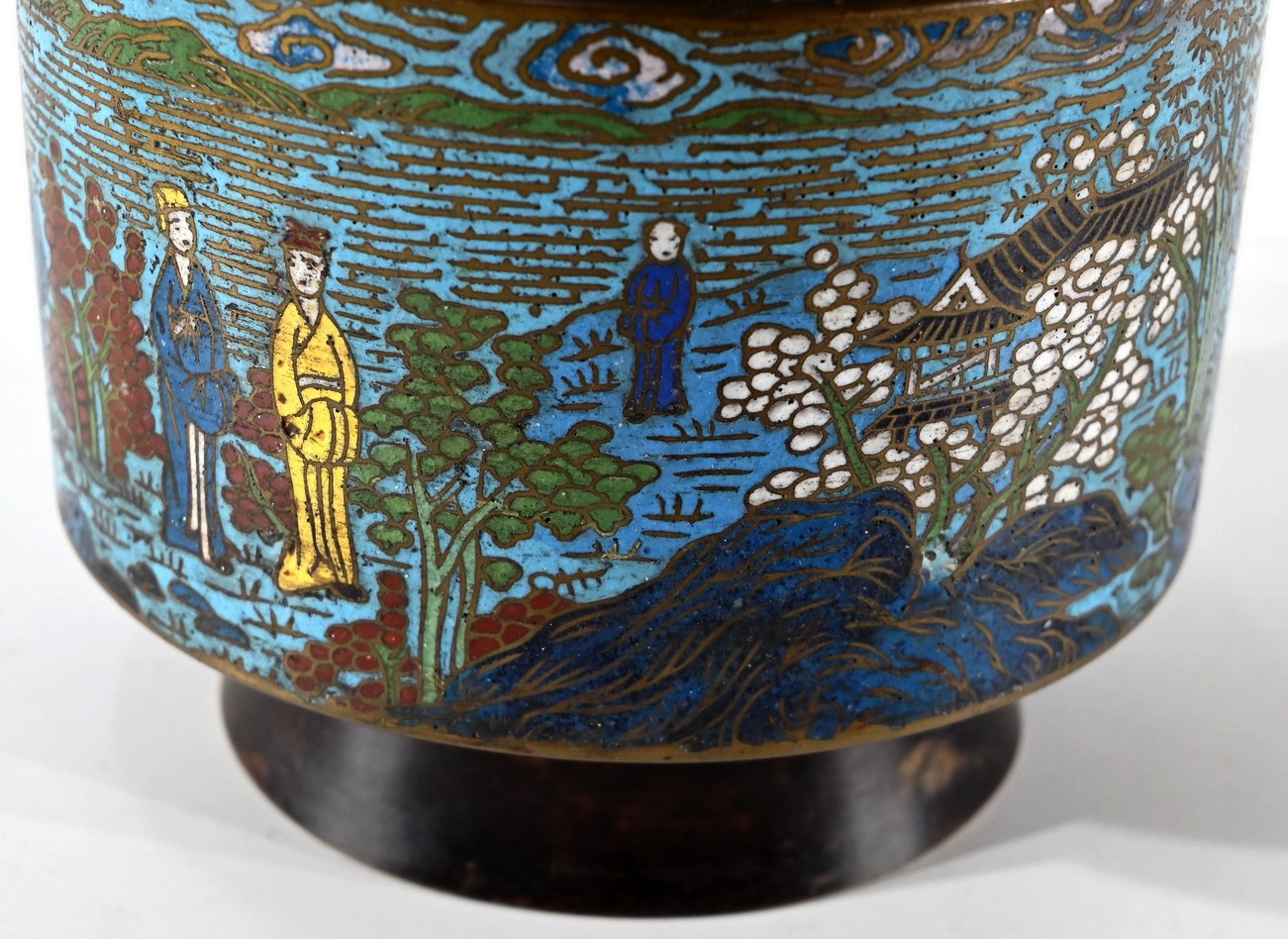 Cette paire de vase en émaux cloisonnés se compose d’une panse en deux parties. La plus basse, de forme cylindrique représente des scènes de vie japonaise, avec des personnages en kimonos et des pagodes. Différentes nuances de bleus parsemées de jaune, blanc, et vert, apportent de la profondeur à ces illustrations.