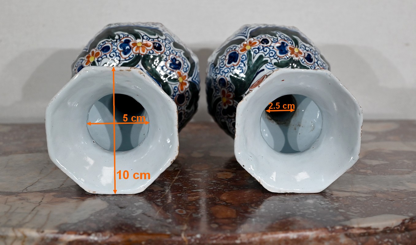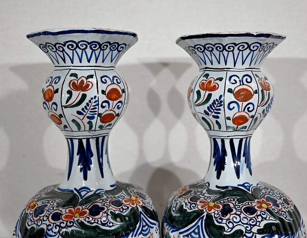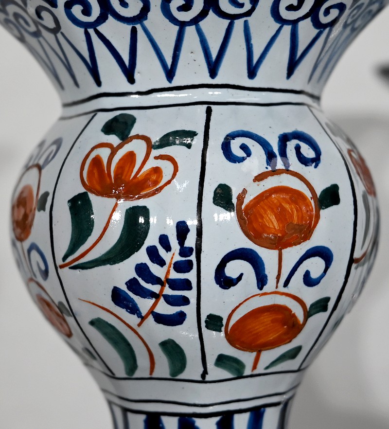 Vases en faïence de Delft du XIXe siècle, peint en polychromie, à panse ronde godronnée et col étroit se terminant par un bulbe ouvert.