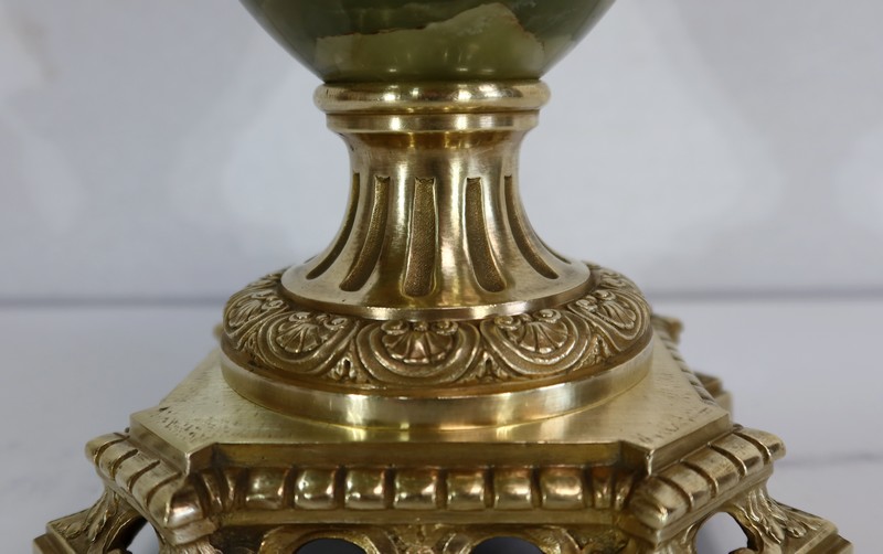 L’ensemble prend appui sur un socle de section carré à petits pans coupés, en bronze joliment ouvragé et ajouré.