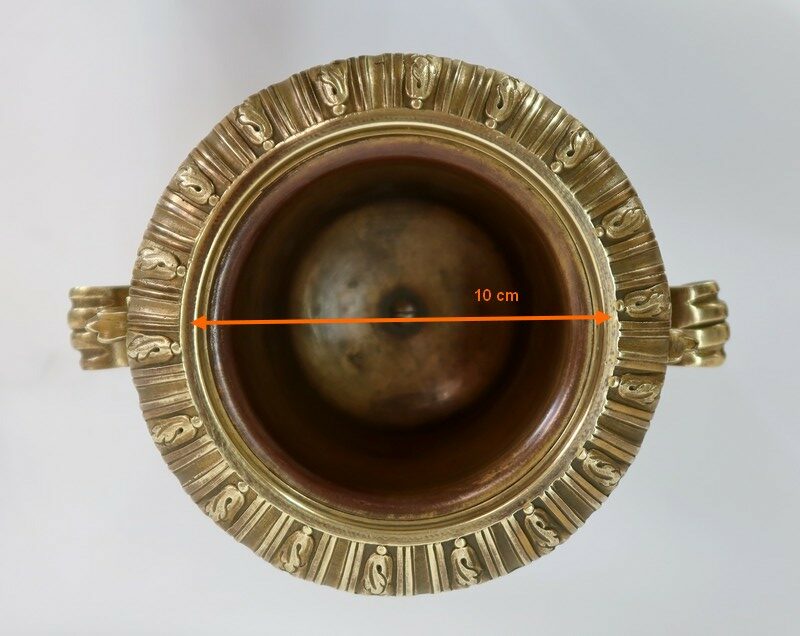 En partie haute, le col est mis en valeur par l’ajout de bronze godronné, tandis que de chaque côté, des poignées se terminant en feuille d’acanthe sont reliées par des guirlandes de feuillages.