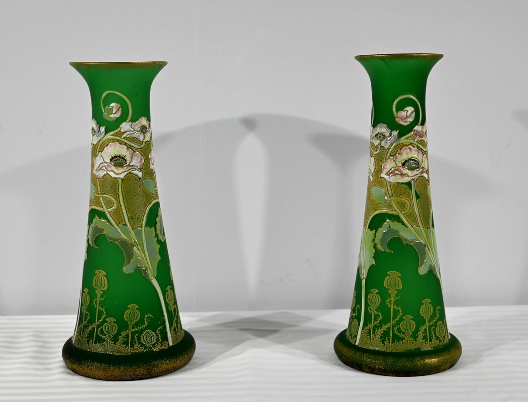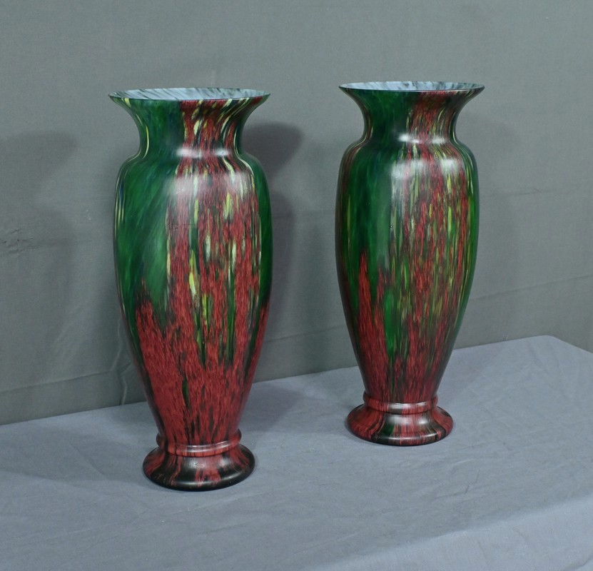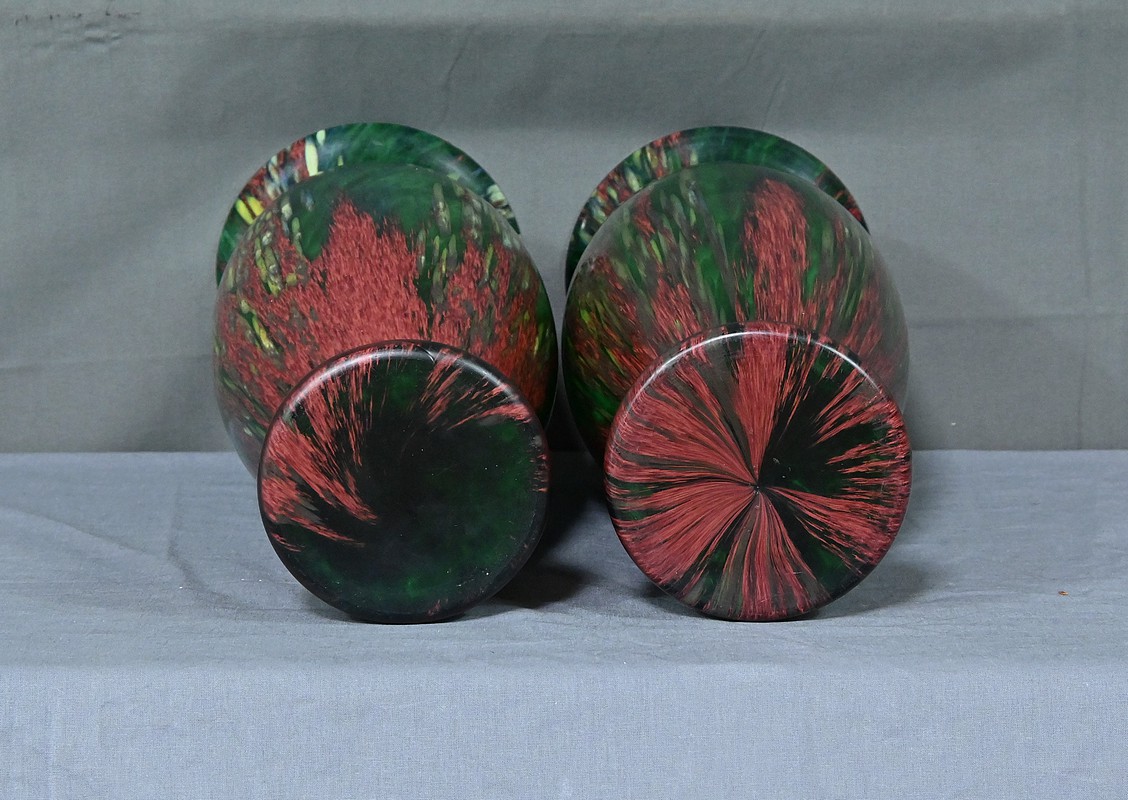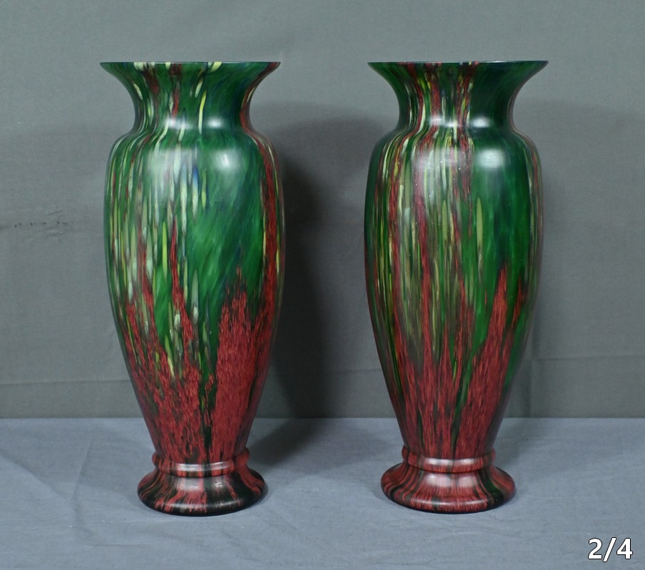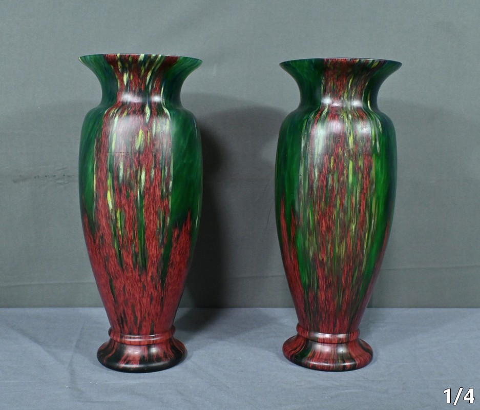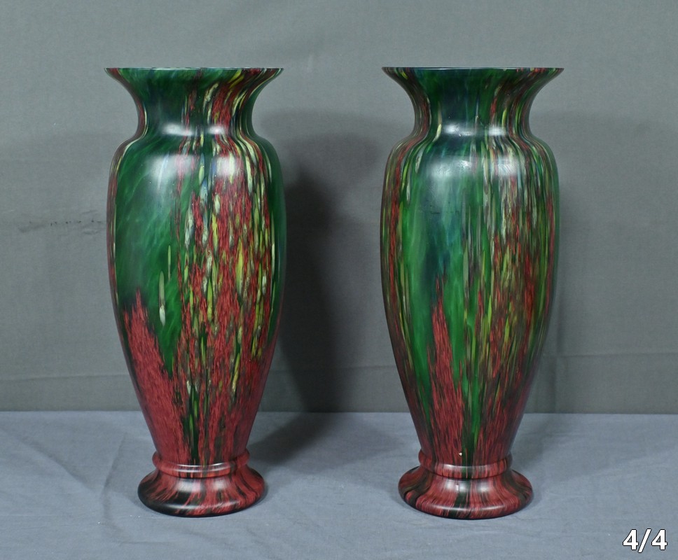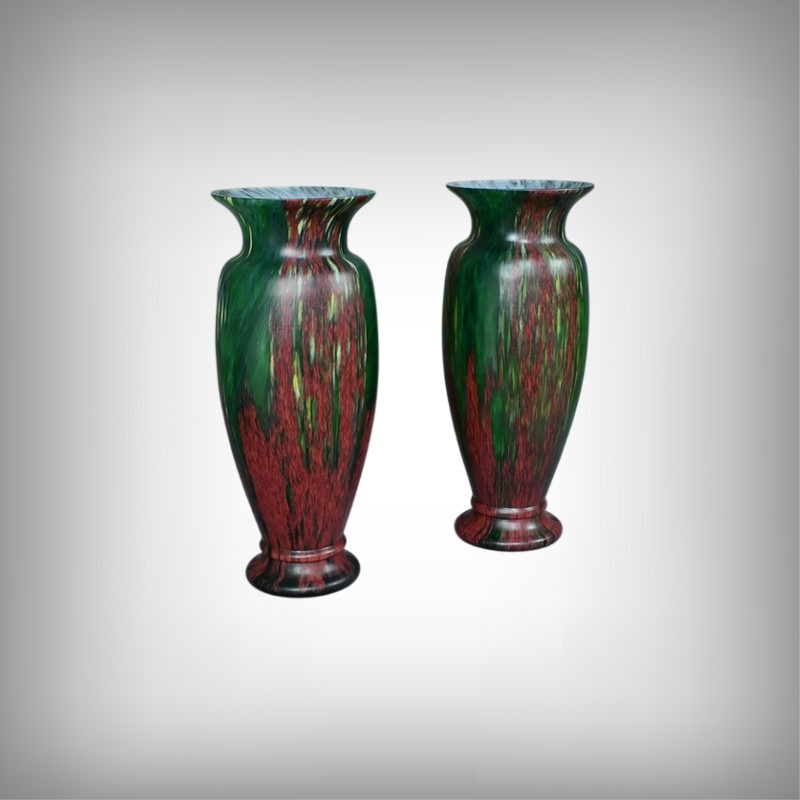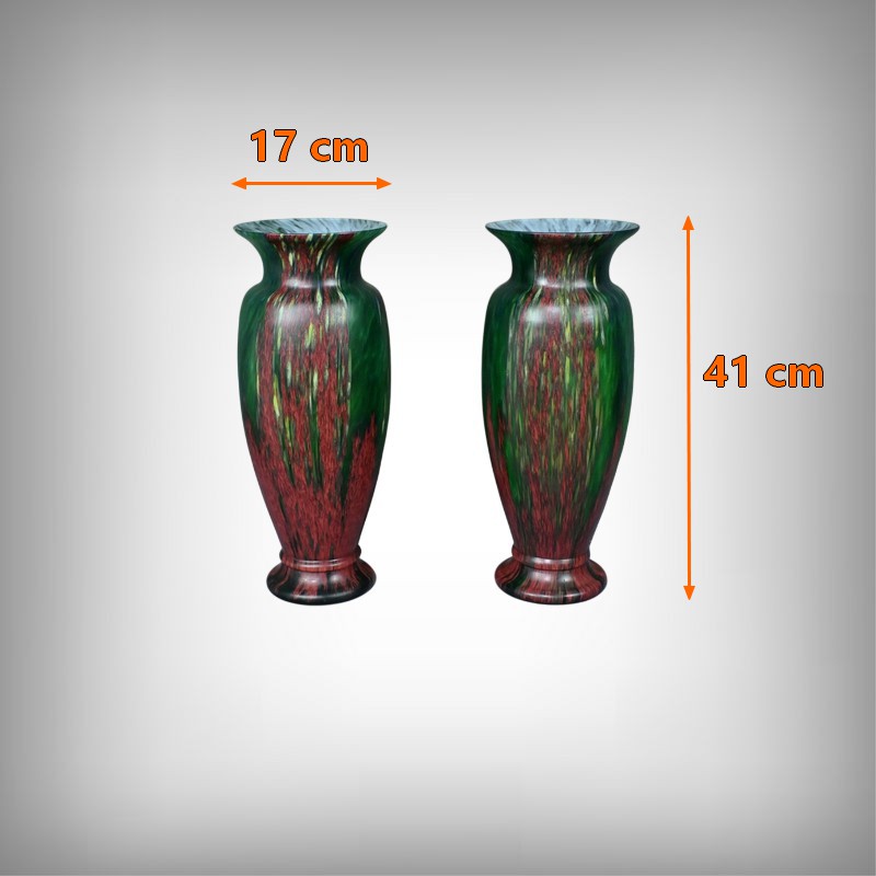 Paire de vases vintage en pâte de verre, alliant l’intensité du rouge et la profondeur du vert. Chaque pièce incarne l’harmonie des contrastes, révélant des nuances vibrantes qui captent la lumière avec délicatesse. Leur silhouette élancée apporte une touche d’élégance à tout intérieur, qu’il soit moderne ou plus classique. Fabriqués avec soin, ces vases sont des pièces uniques qui sauront séduire les amateurs d’art verrier et les passionnés de décoration. Que ce soit sur une console, un buffet ou une étagère, ils offriront votre intérieur une note artistique pleine de caractère.