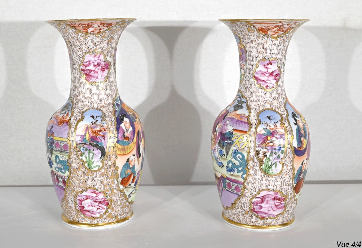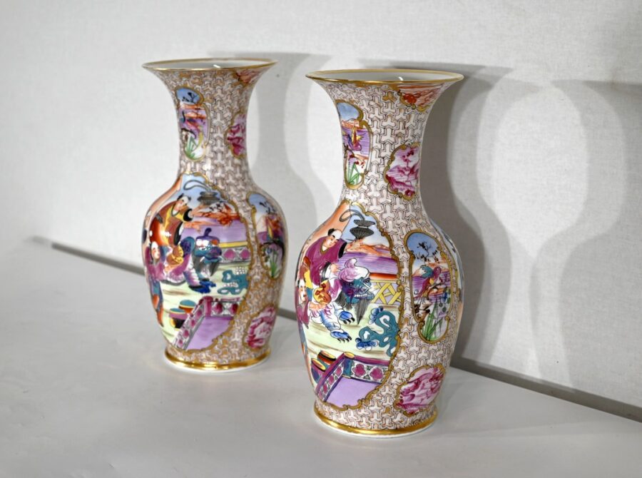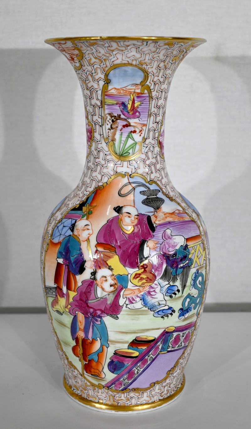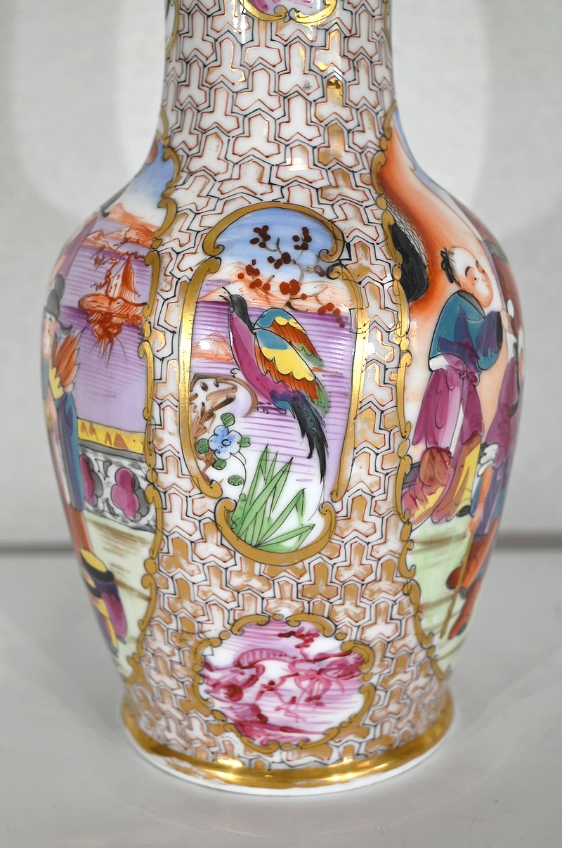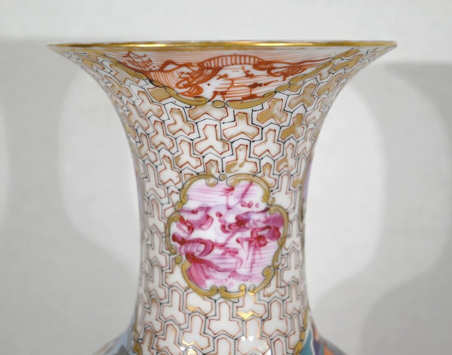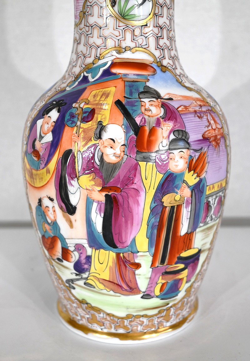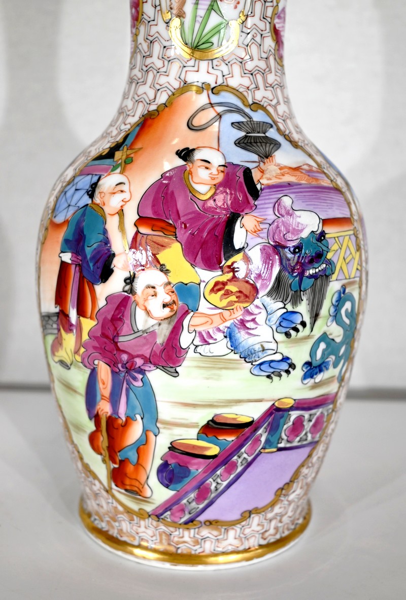 Paire de vases balustres à col évasé décorés de personnages pittoresques, d’animaux, de fleurs et de feuillages dans des tons vifs.