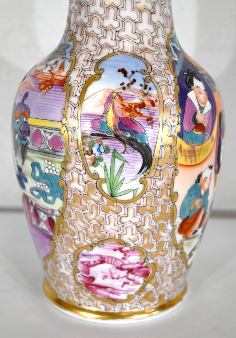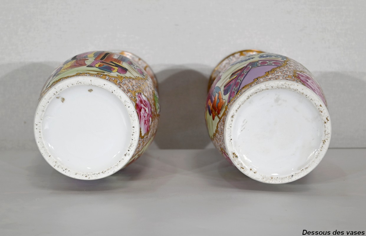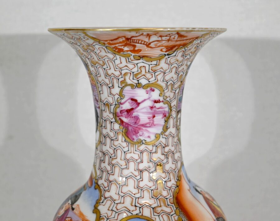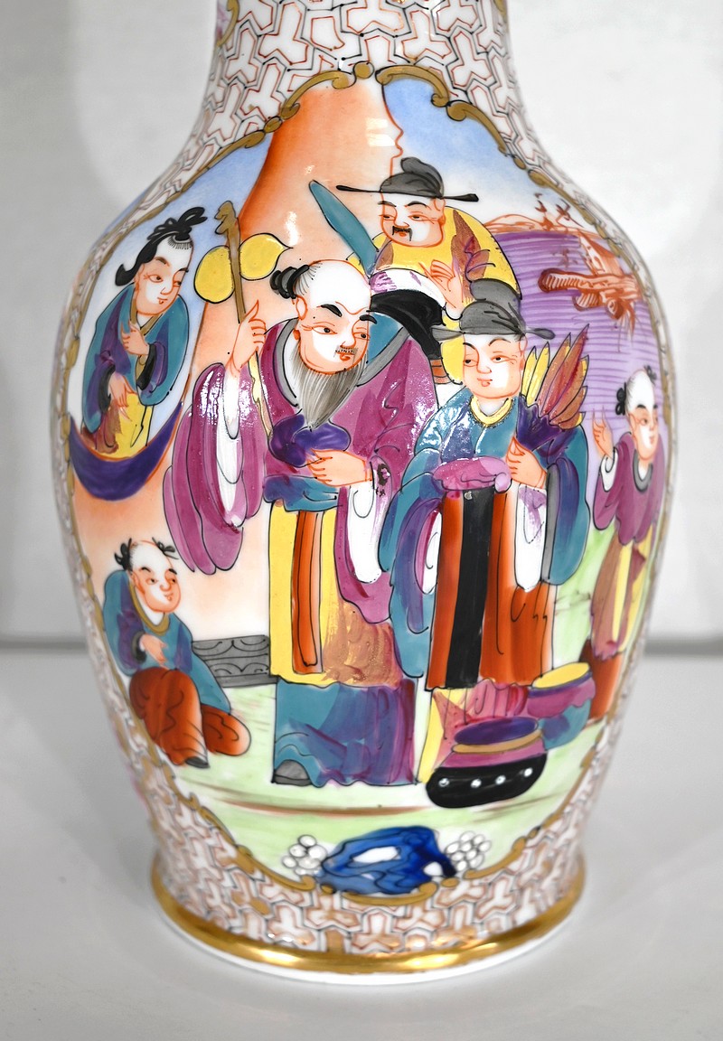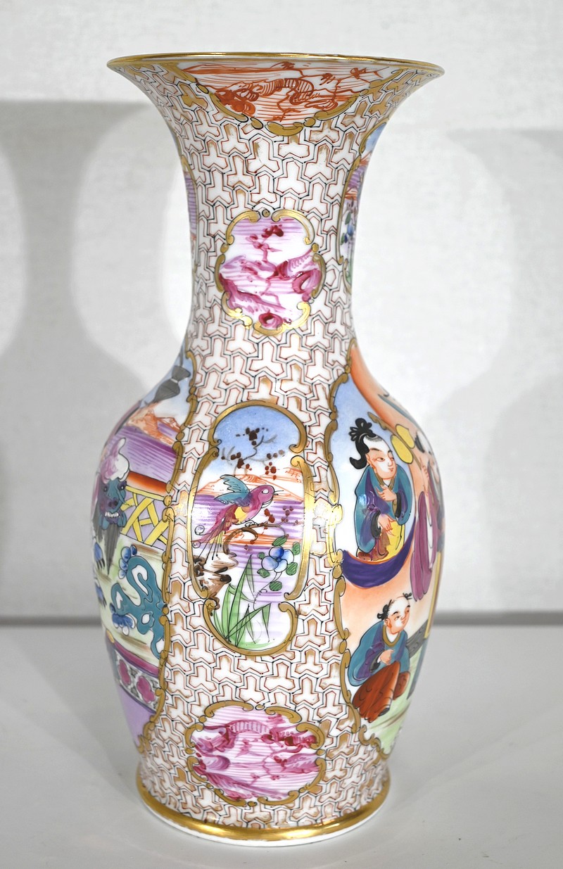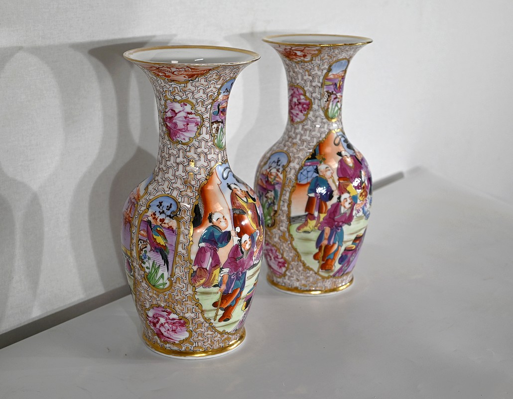 Paire de vases balustres à col évasé décorés de personnages pittoresques, d’animaux, de fleurs et de feuillages dans des tons vifs.