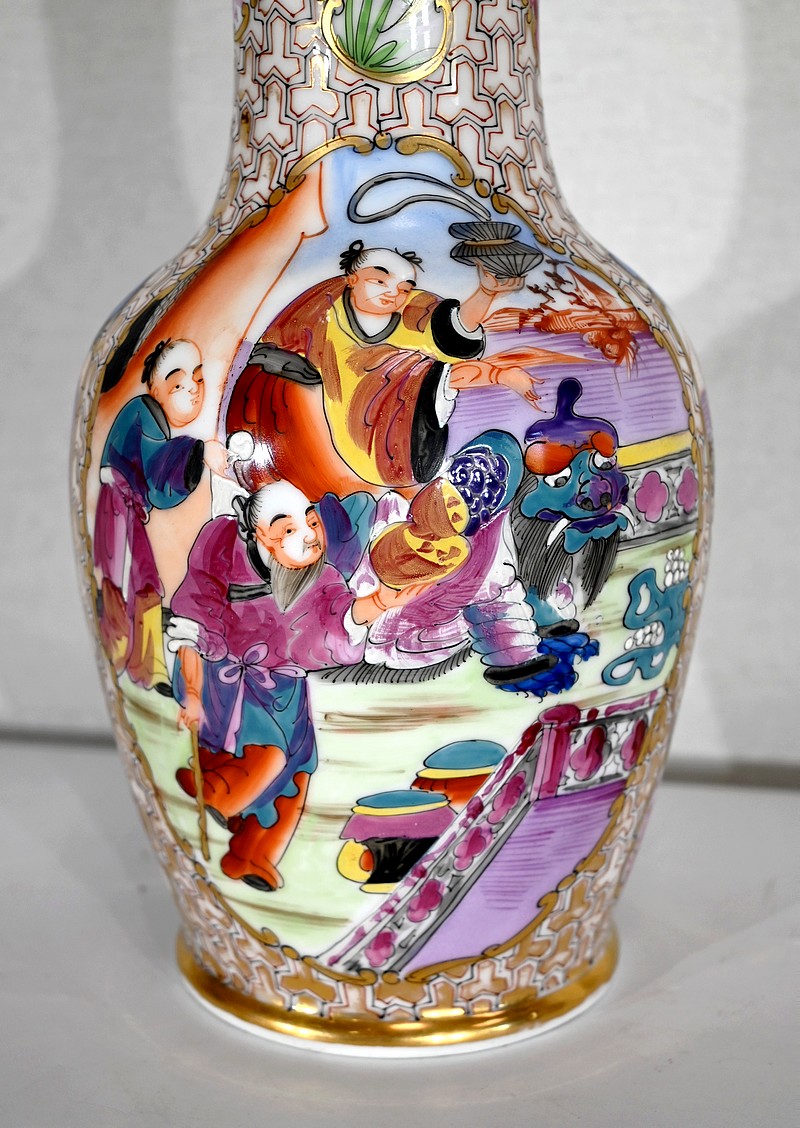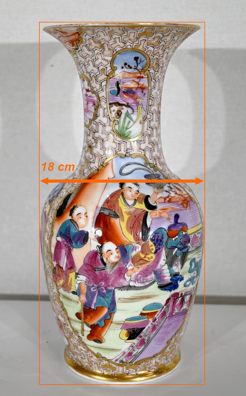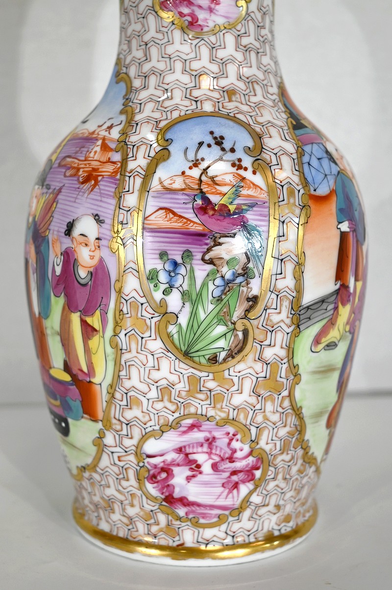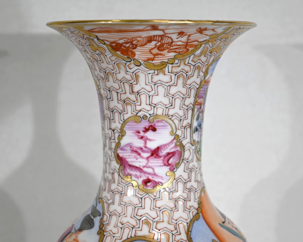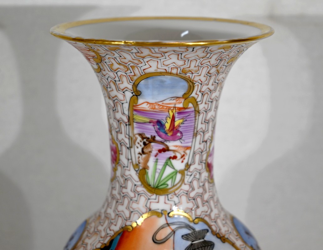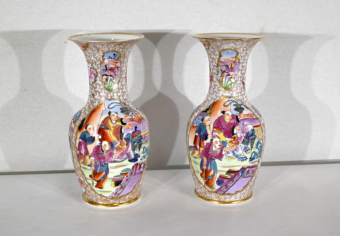 Paire de vases balustres à col évasé décorés de personnages pittoresques, d’animaux, de fleurs et de feuillages dans des tons vifs.