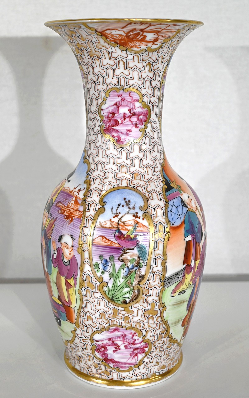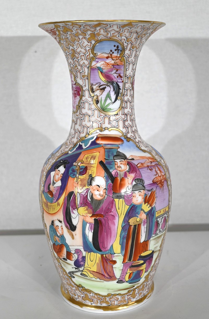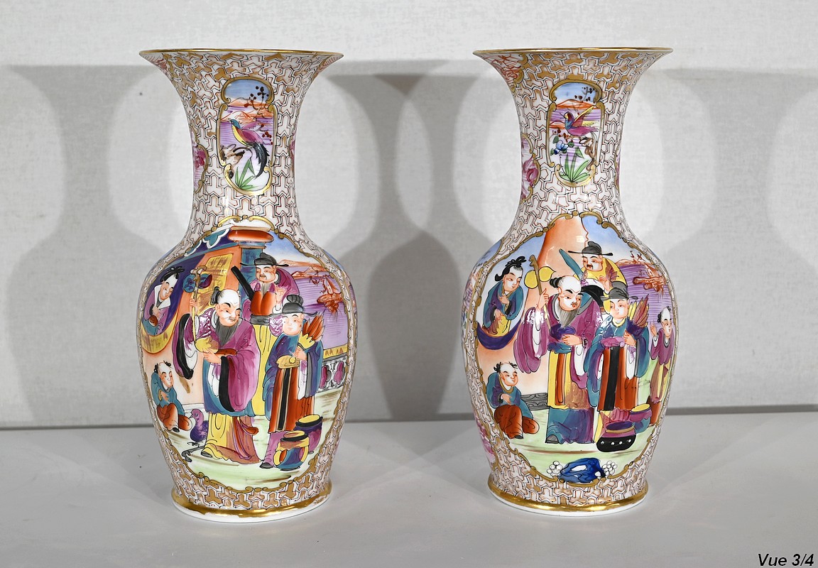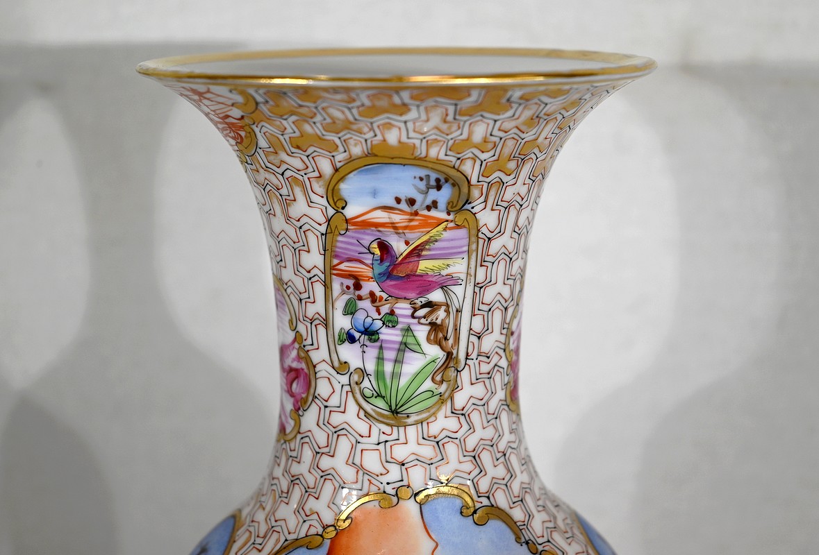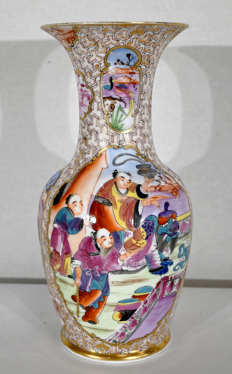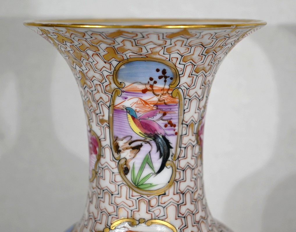 Paire de vases balustres à col évasé décorés de personnages pittoresques, d’animaux, de fleurs et de feuillages dans des tons vifs.