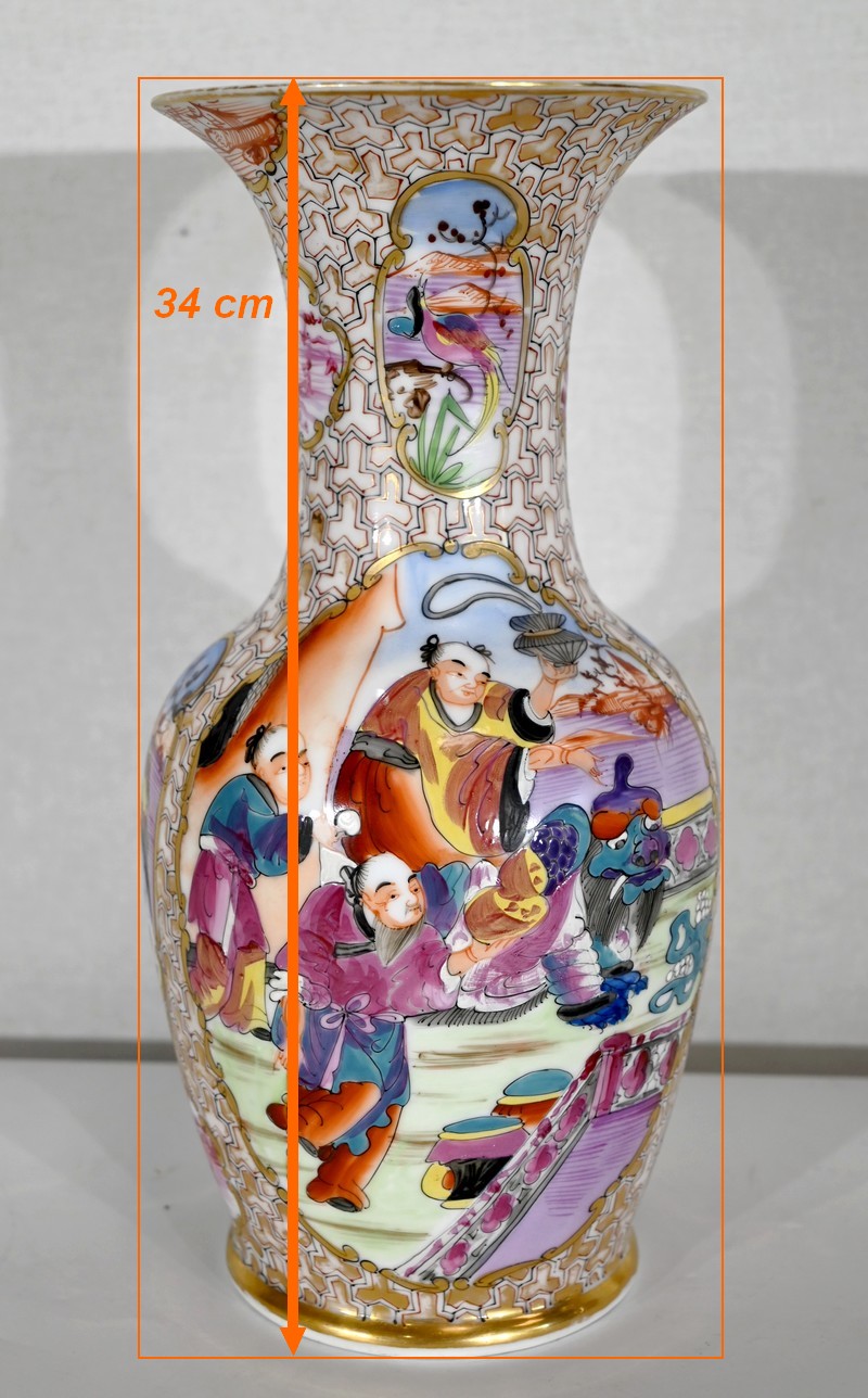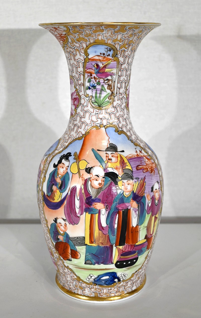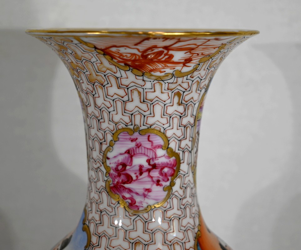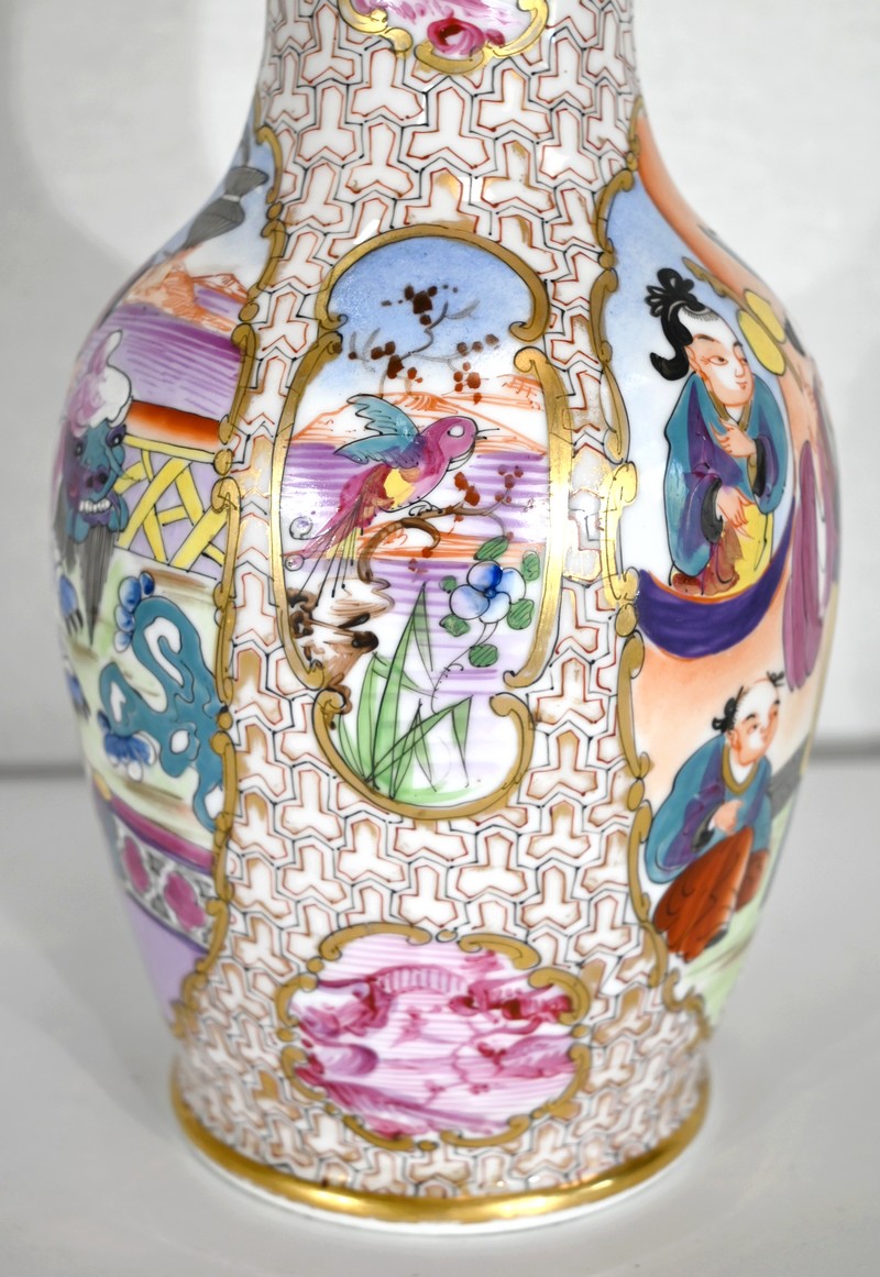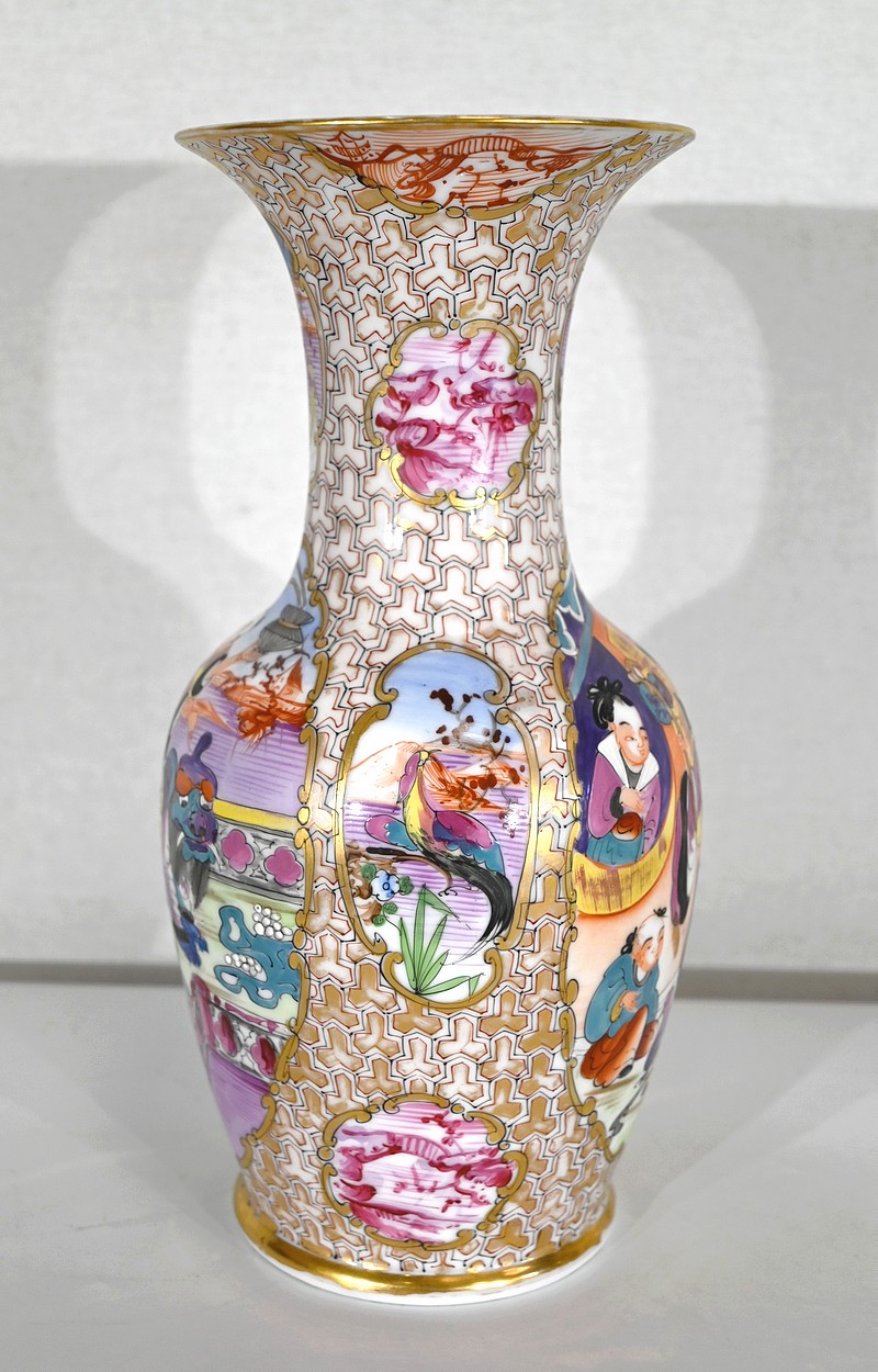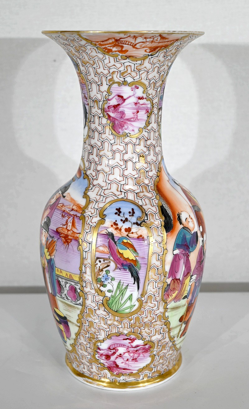 Paire de vases balustres à col évasé décorés de personnages pittoresques, d’animaux, de fleurs et de feuillages dans des tons vifs.
