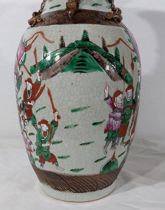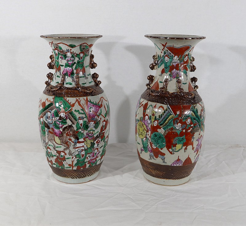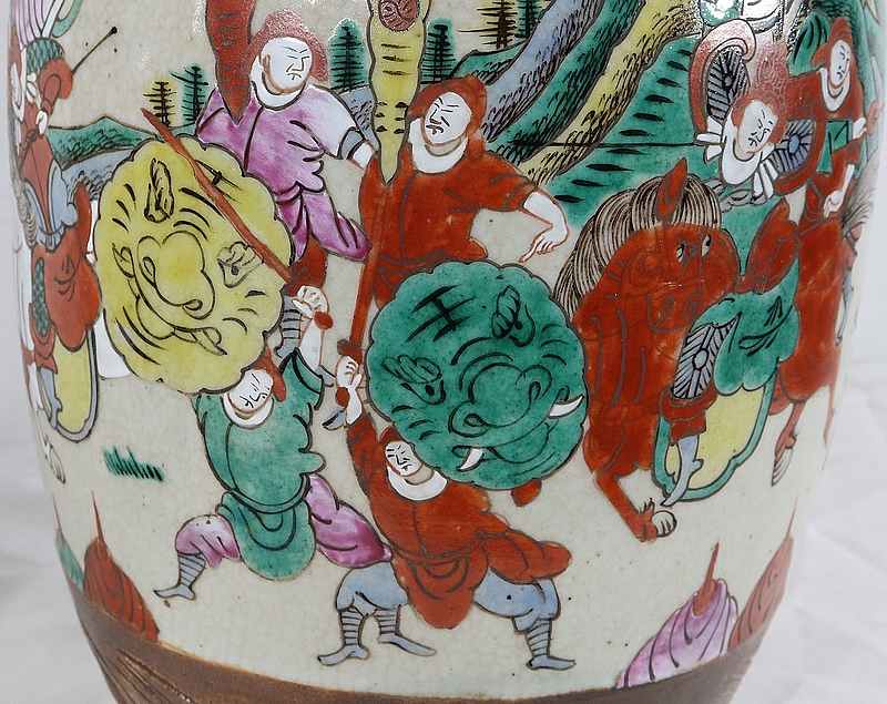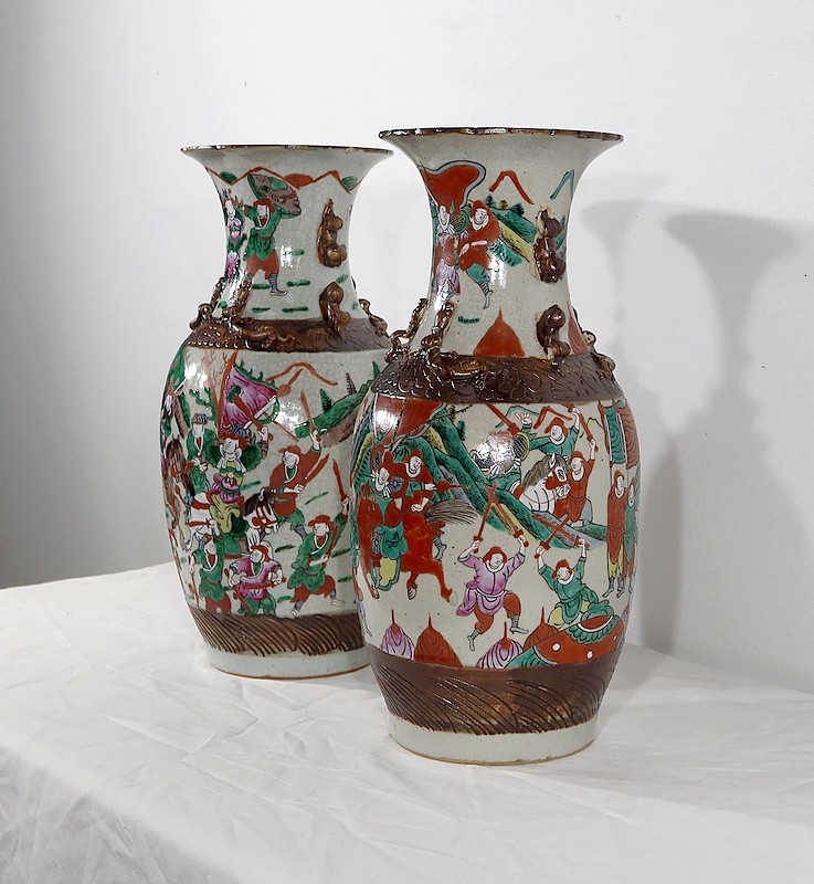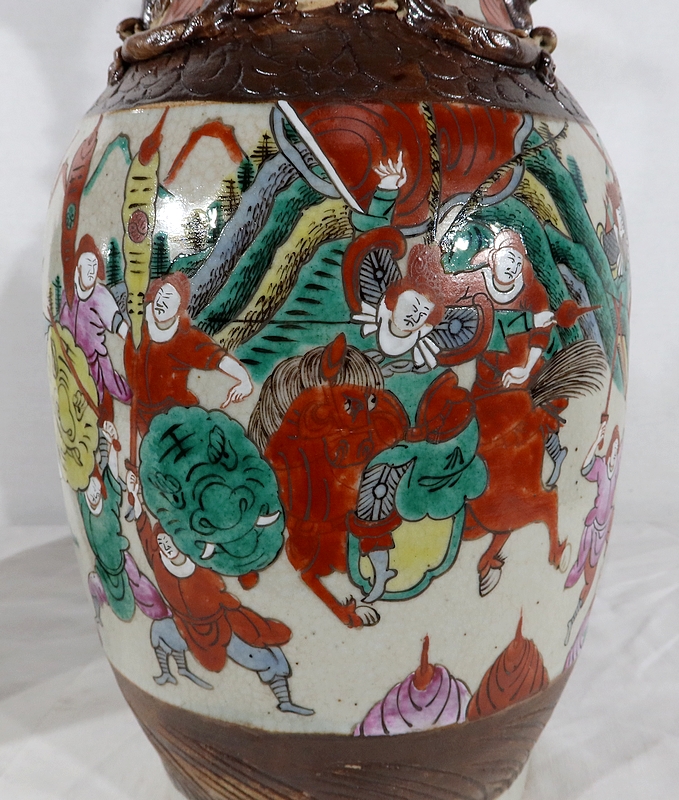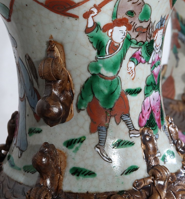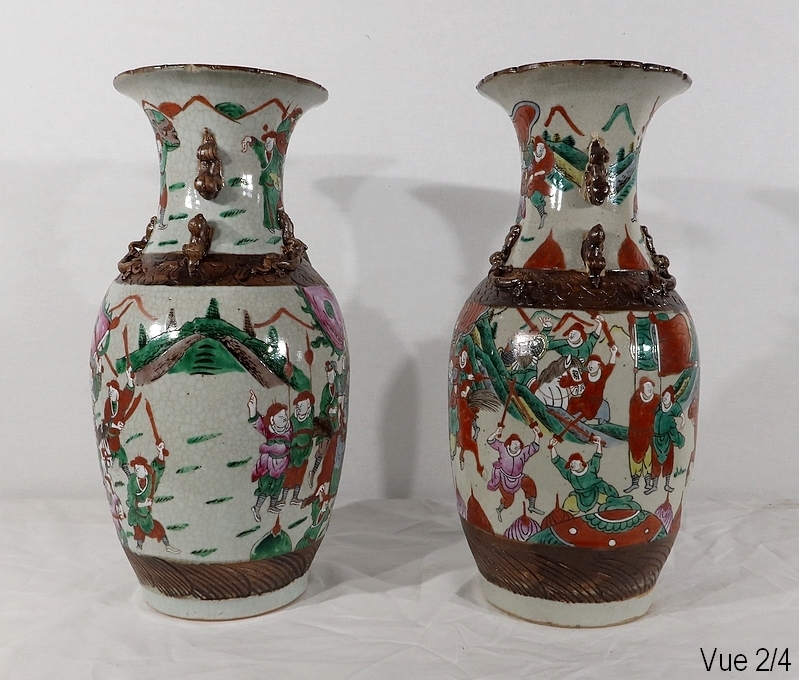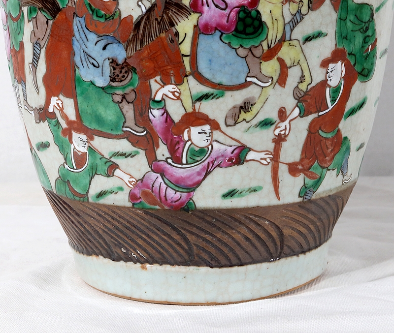 Paire de vases pansus en porcelaine chinoise de Nankin, à fond craquelé beige à décor émaillé polychrome. Chaque vase présente un décor tournant d’une scène de bataille. De nombreux guerriers asiatiques aux tenues colorées sont peints, entourés d’un paysage stylisé. Témoignage et hommage aux traditions de la chine ancienne, ces vases font partis du folklore chinois.