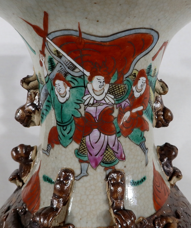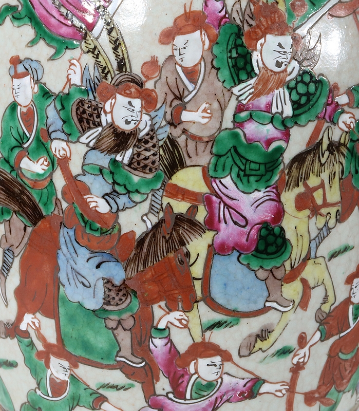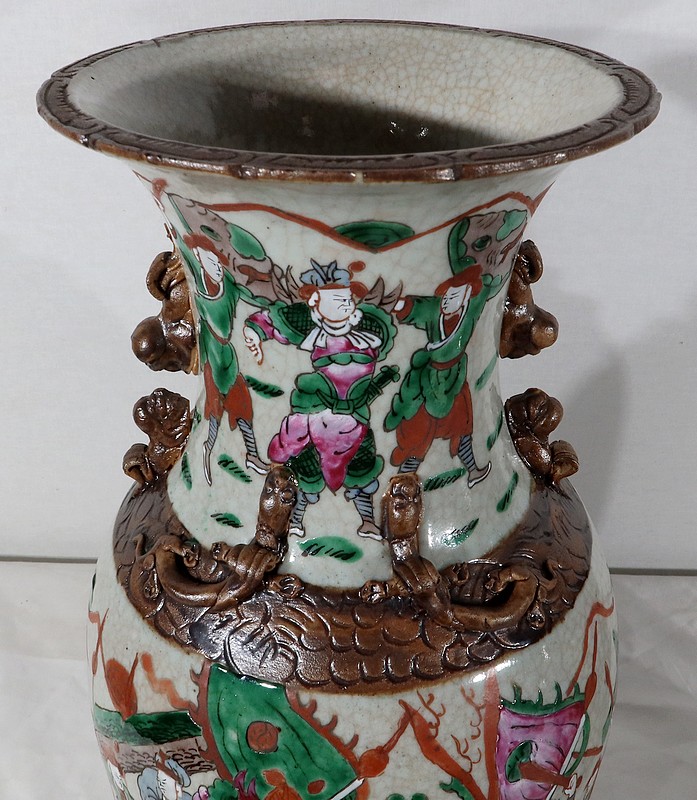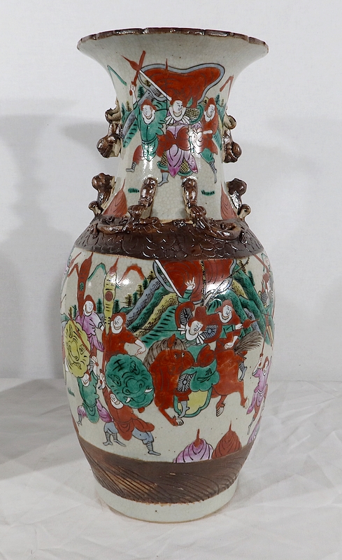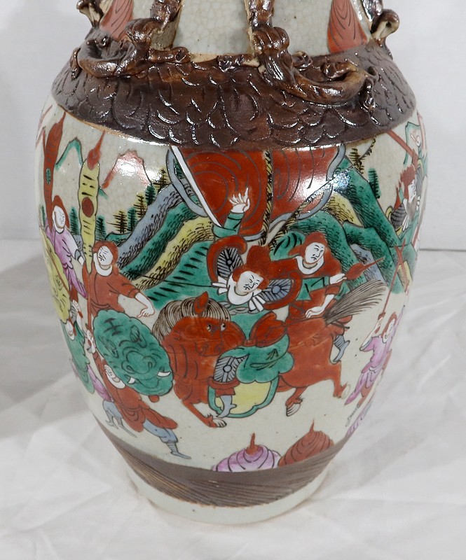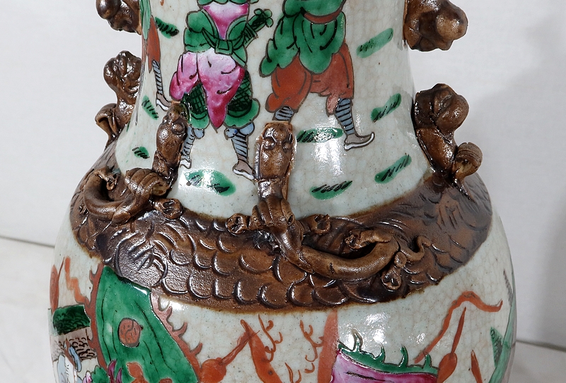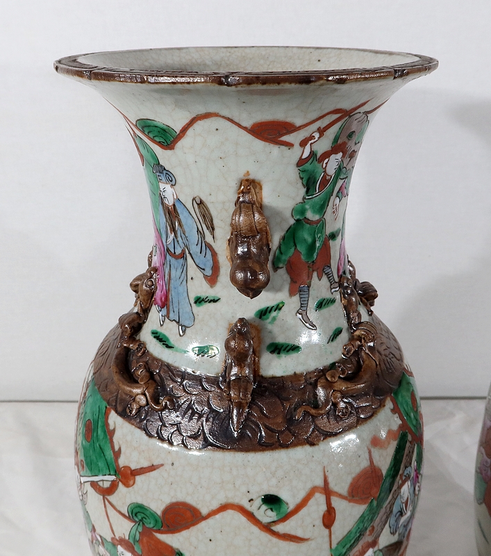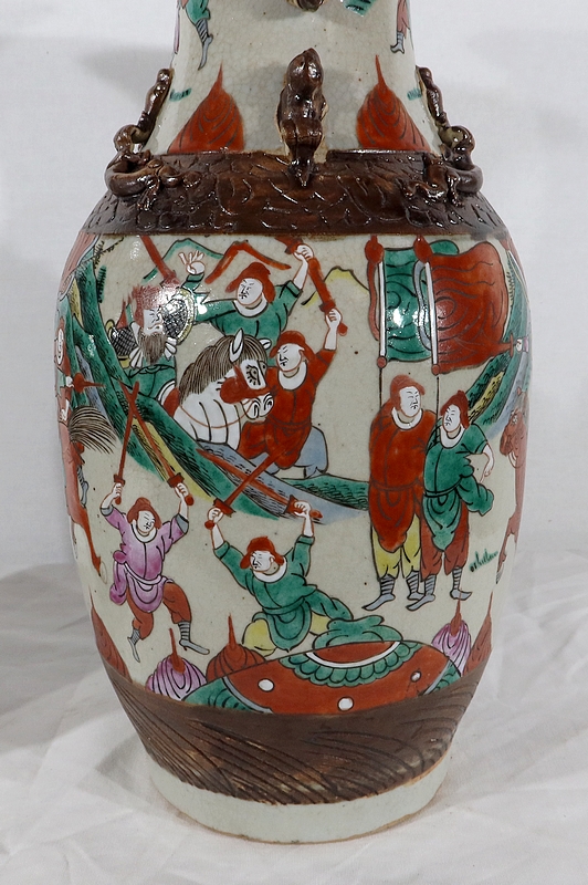 Paire de vases pansus en porcelaine chinoise de Nankin, à fond craquelé beige à décor émaillé polychrome. Chaque vase présente un décor tournant d’une scène de bataille. De nombreux guerriers asiatiques aux tenues colorées sont peints, entourés d’un paysage stylisé. Témoignage et hommage aux traditions de la chine ancienne, ces vases font partis du folklore chinois.