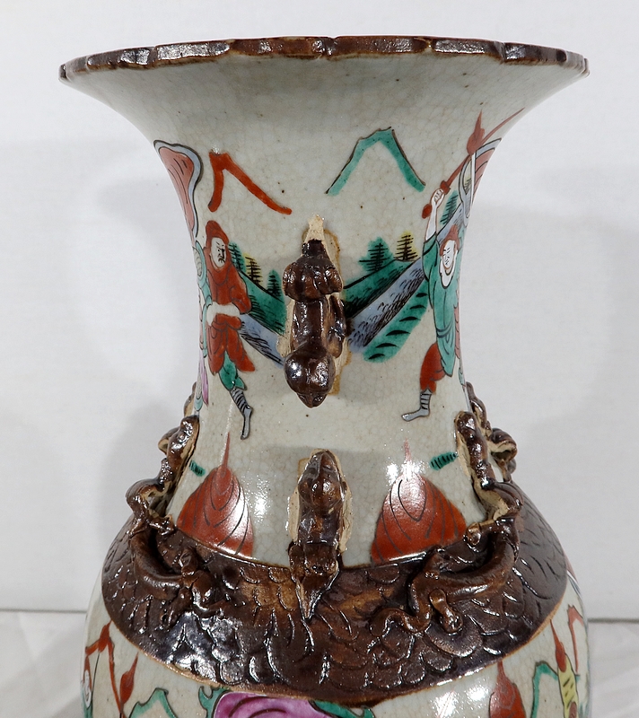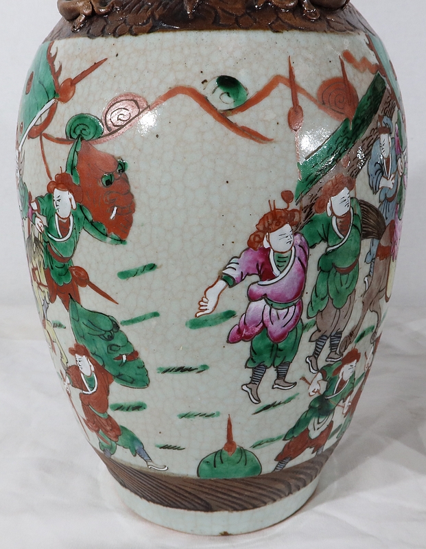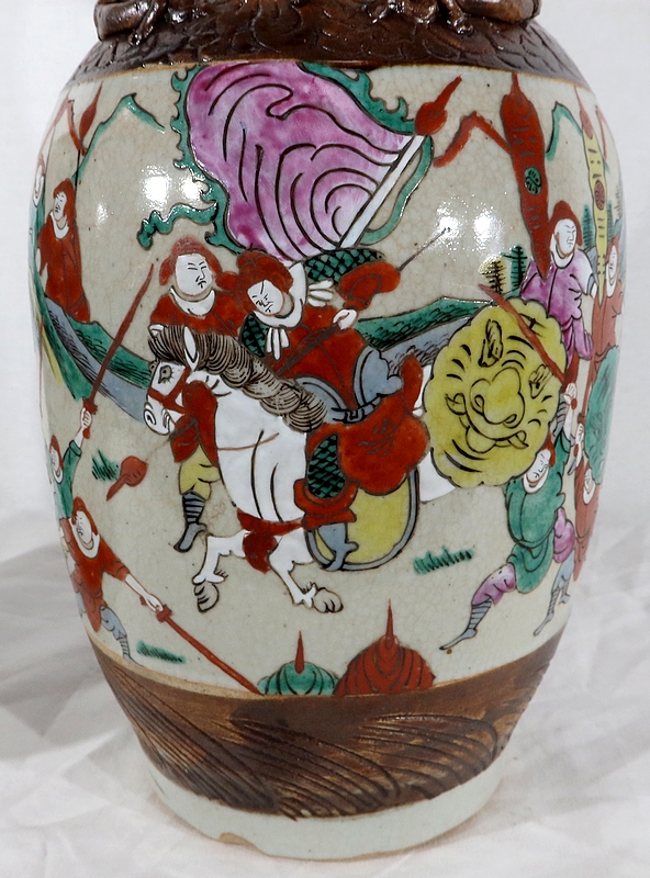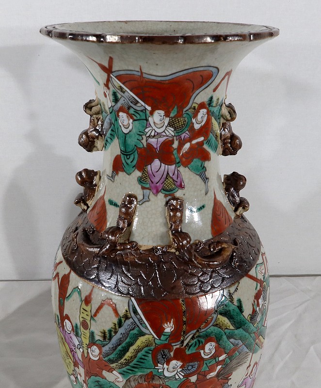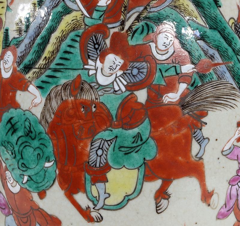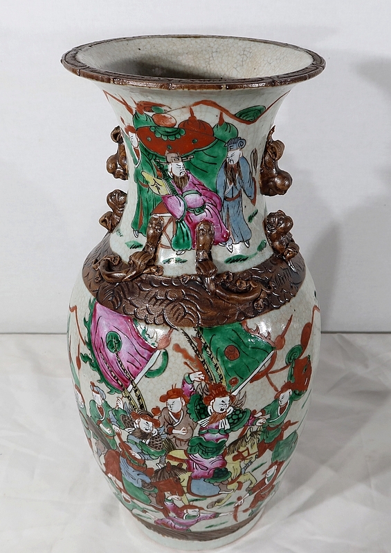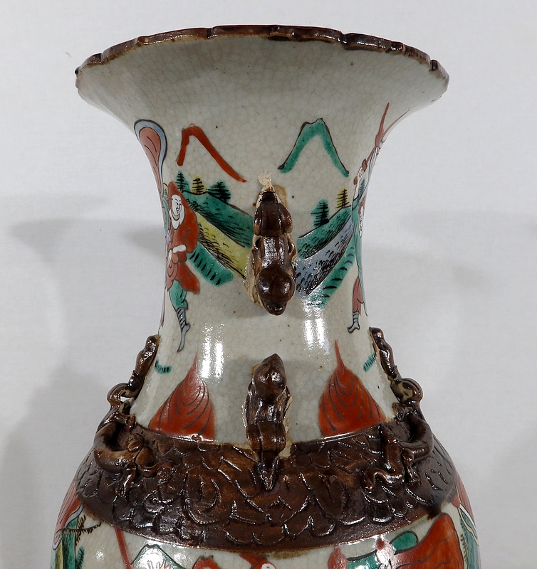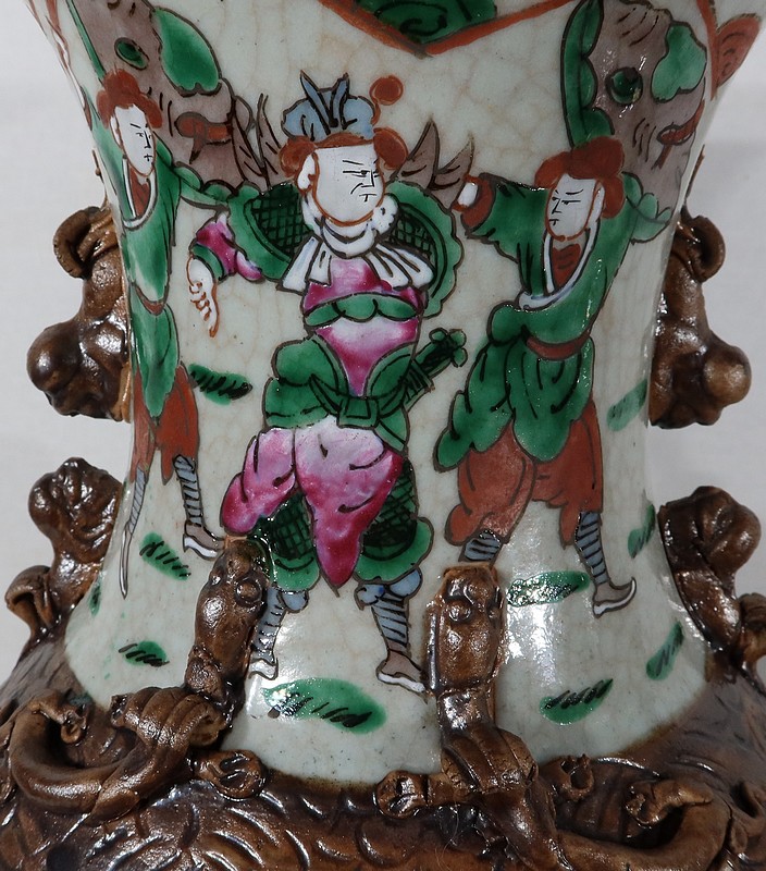 Paire de vases pansus en porcelaine chinoise de Nankin, à fond craquelé beige à décor émaillé polychrome. Chaque vase présente un décor tournant d’une scène de bataille. De nombreux guerriers asiatiques aux tenues colorées sont peints, entourés d’un paysage stylisé. Témoignage et hommage aux traditions de la chine ancienne, ces vases font partis du folklore chinois.