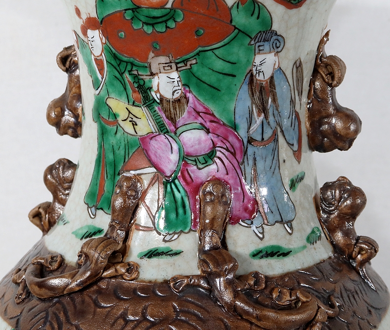Sommé d’une collerette, le col des vases est ornementé de chien de Fô sur les côtés. Le haut de la panse figure des animaux fantastiques ressemblant à des lézards.