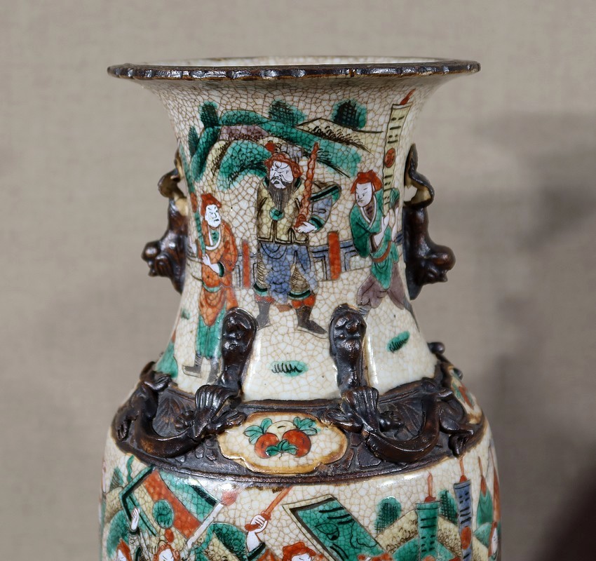Paire de vases pansus en porcelaine chinoise de Nankin à décor polychrome tournant d’une scène de bataille. De nombreux guerriers asiatiques aux tenues colorées sont peints sur fond de paysage stylisé. Les bords sont habillés d’une collerette ornée de dragons orientaux. Le col présente des chiens de Fô en guise d’anses.