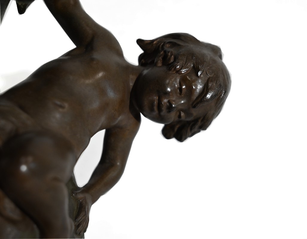 De jeunes enfants à patine brune, légèrement vêtus, s’accrochant sur un plan incliné, scrutent avec attention cette nature.