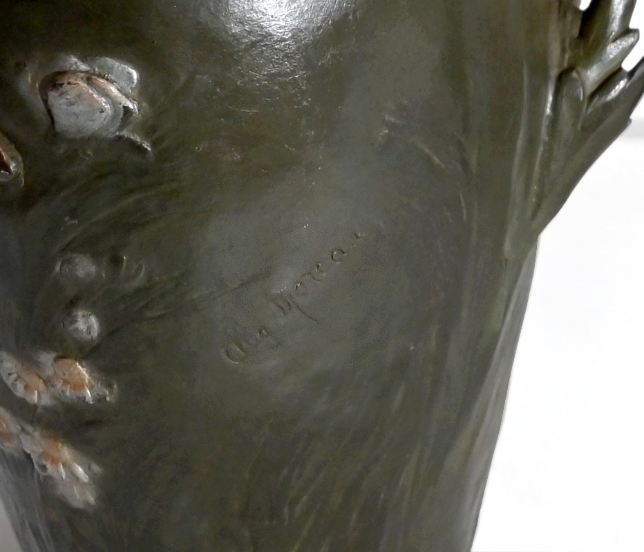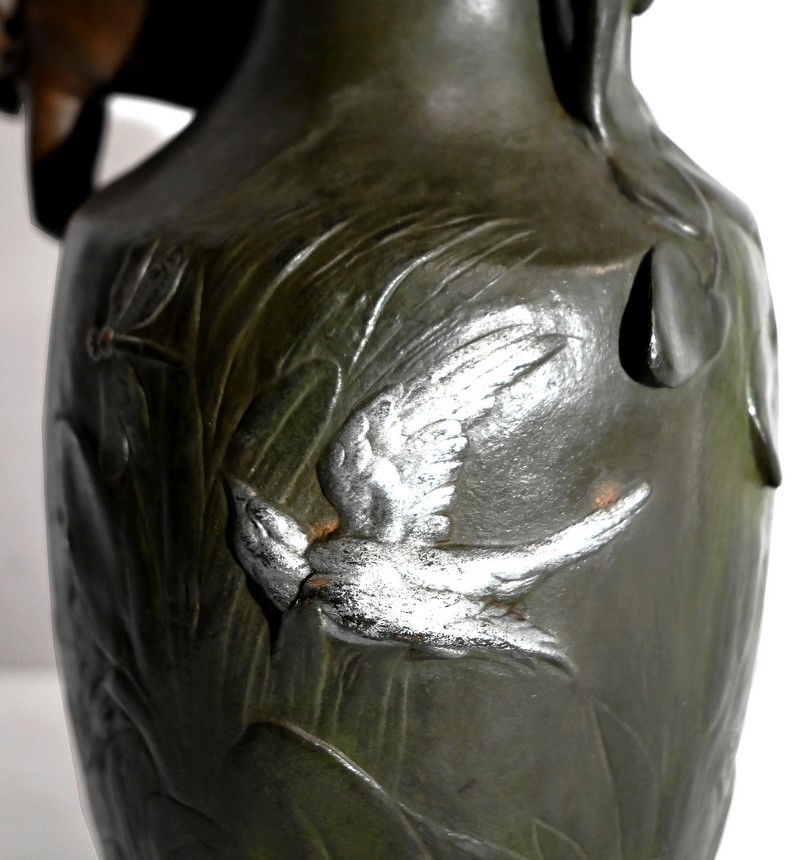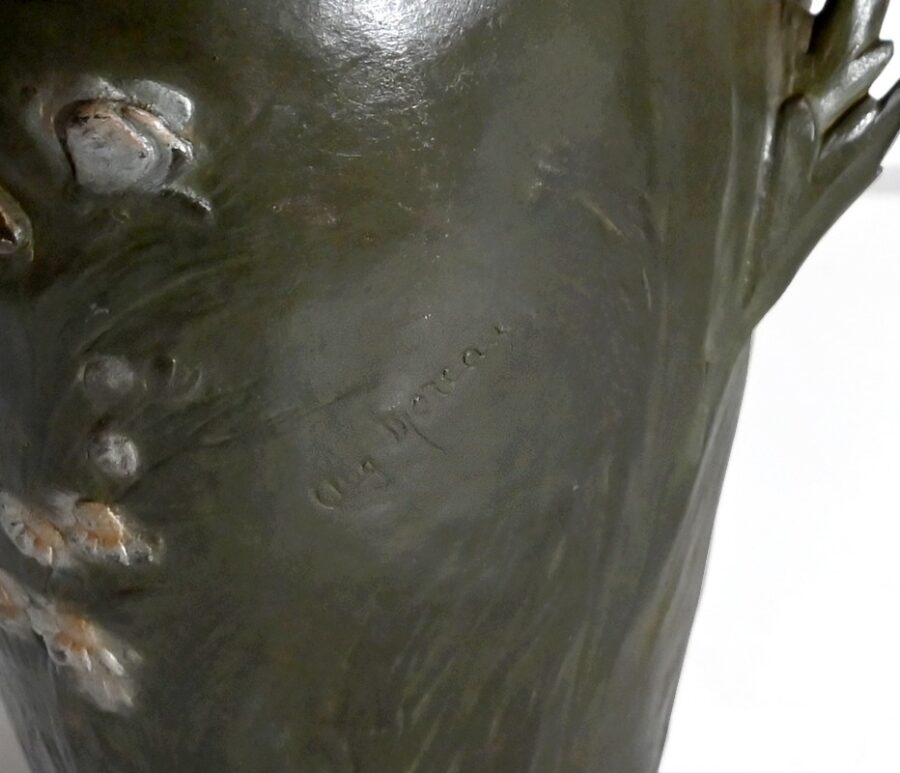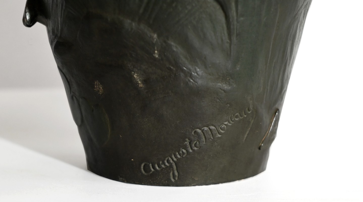 Cette production artistique, signée A. Moreau, présente le cachet du fondeur, Eugène Blot Paris, au pied du vase.