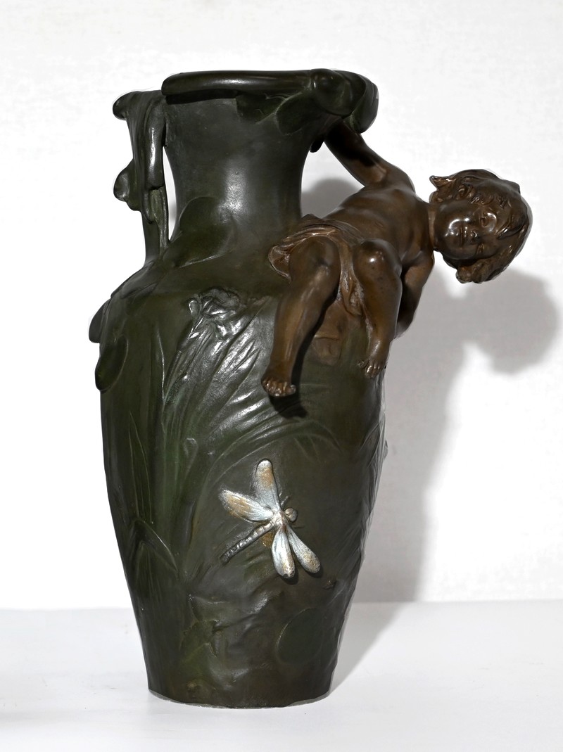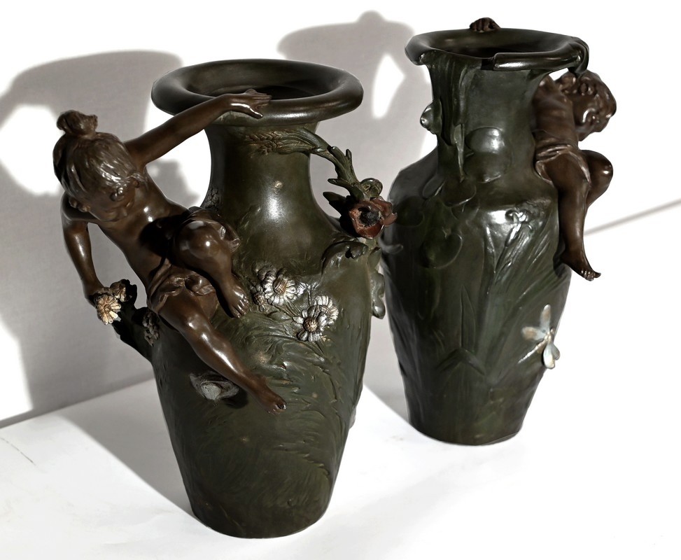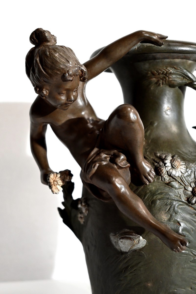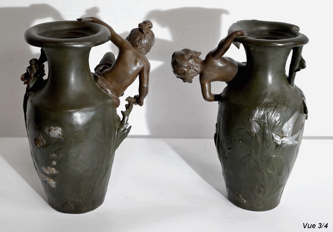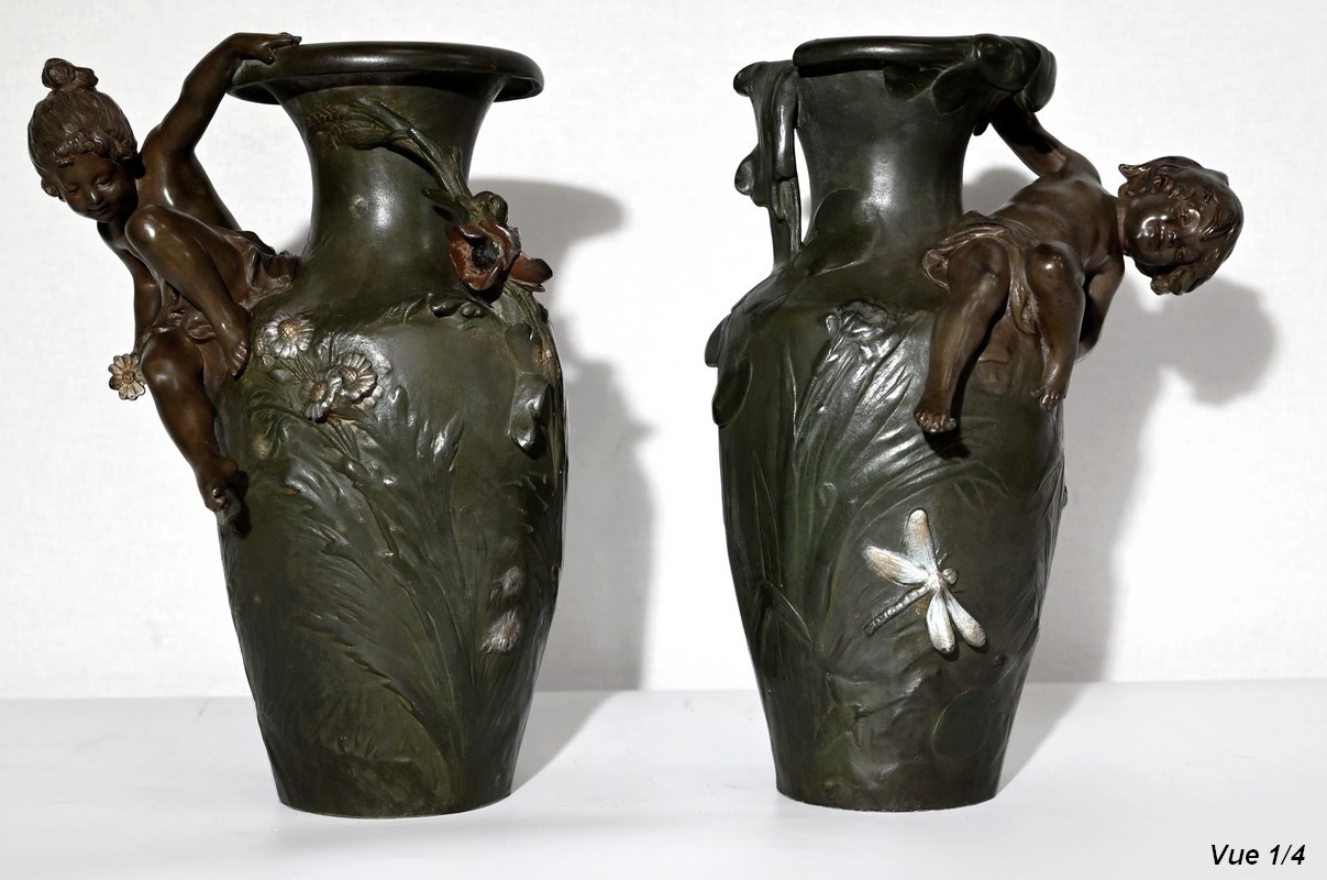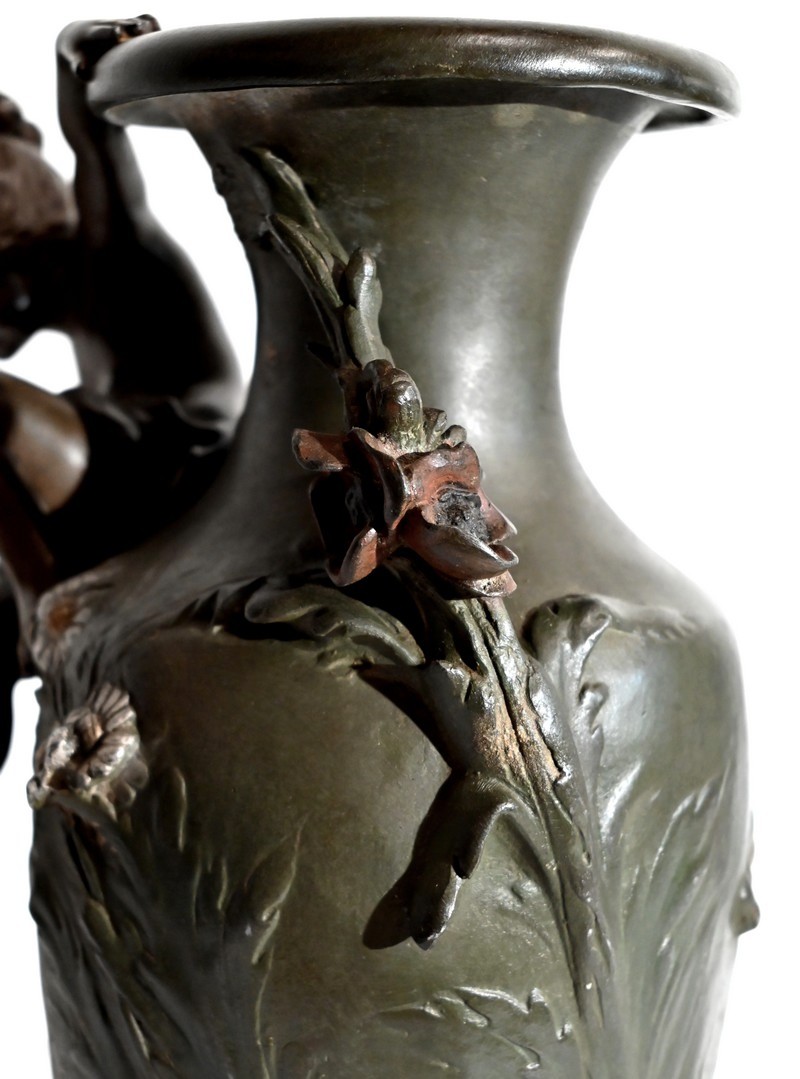 Paire de vases en régule à double patines, signés Auguste Moreau (1834 –1917). Fils du sculpteur Jean-Baptiste-Louis-Joseph Moreau et frère cadet des sculpteurs Hippolyte et Mathurin Moreau, il est reconnu pour produire essentiellement des bronzes d’art d’exception. N’ayant jamais reçu de récompense officielle, cette notoriété n’interviendra que post-mortem.